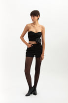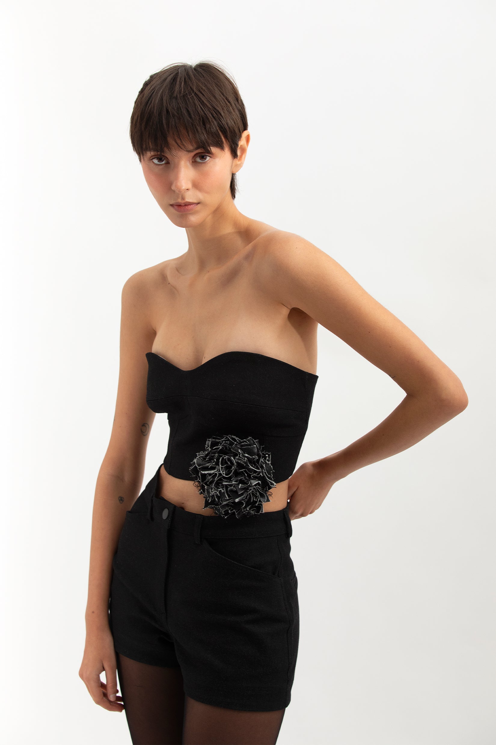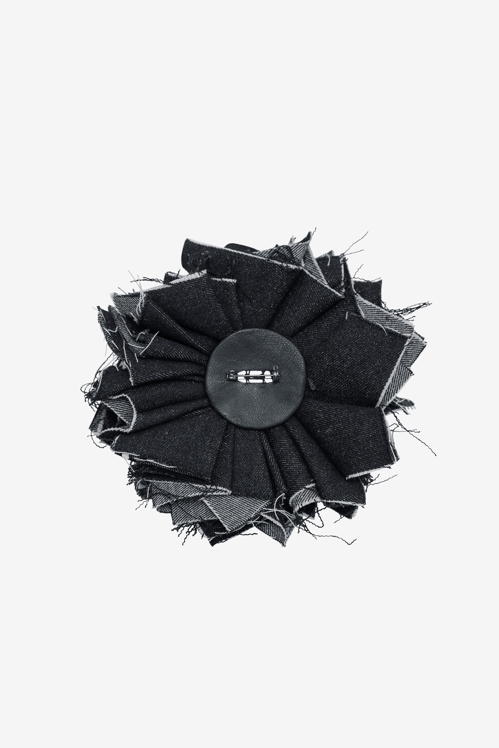 Our Denim Affair Rosette Pin is crafted in noir denim, formed into a soft rosette for a refined, versatile accessory. Each piece is handcrafted in our Barcelona atelier.