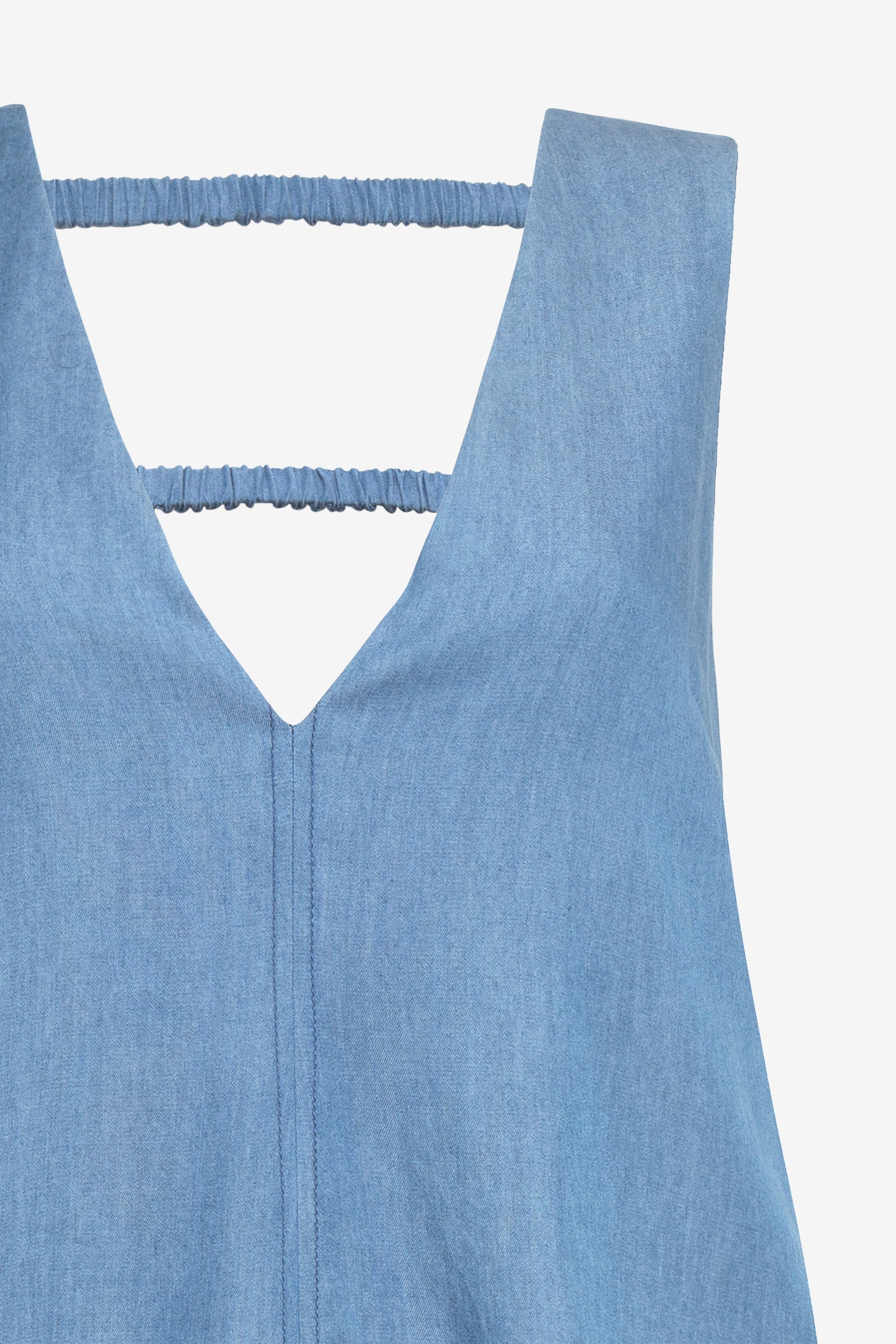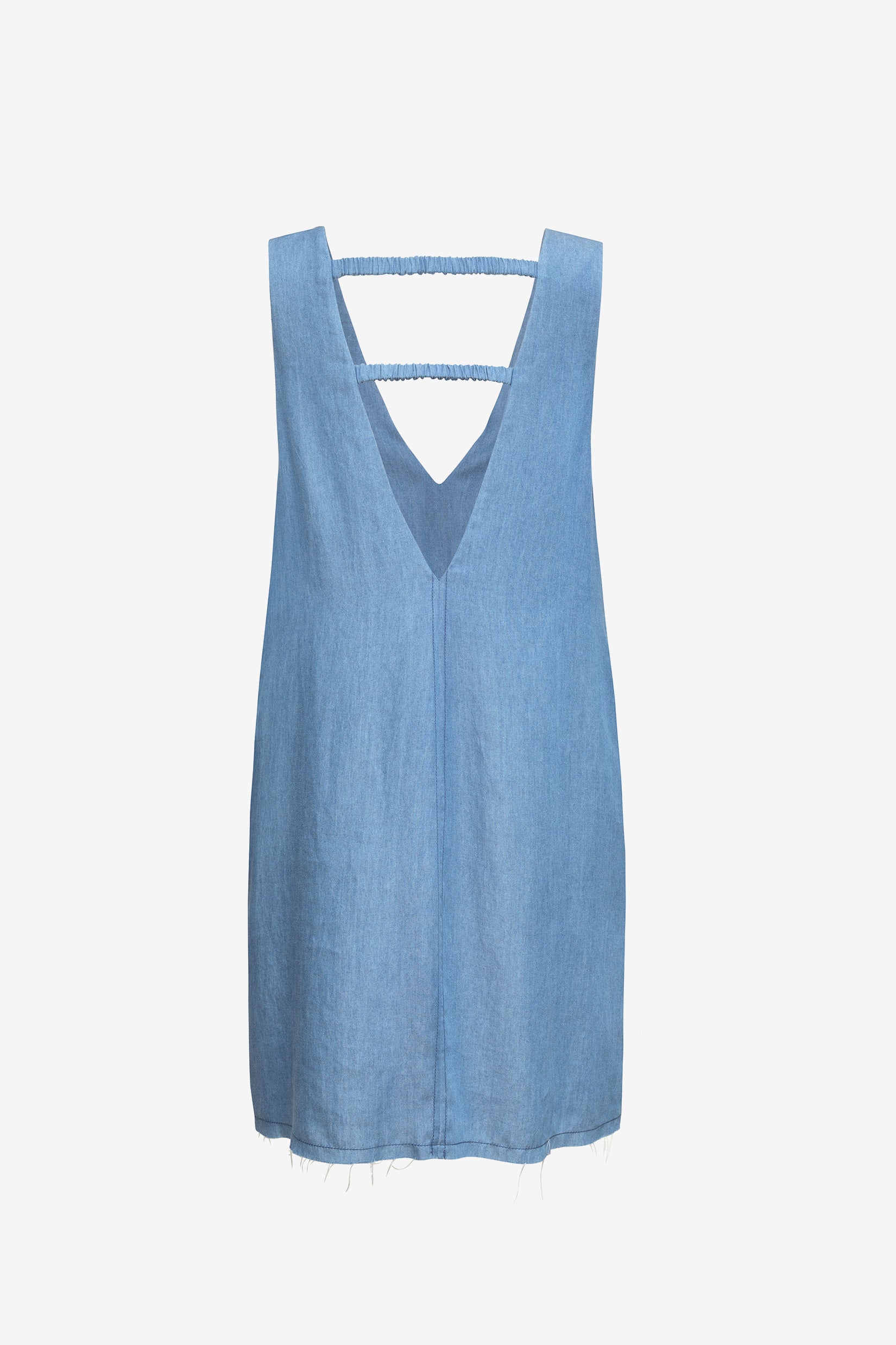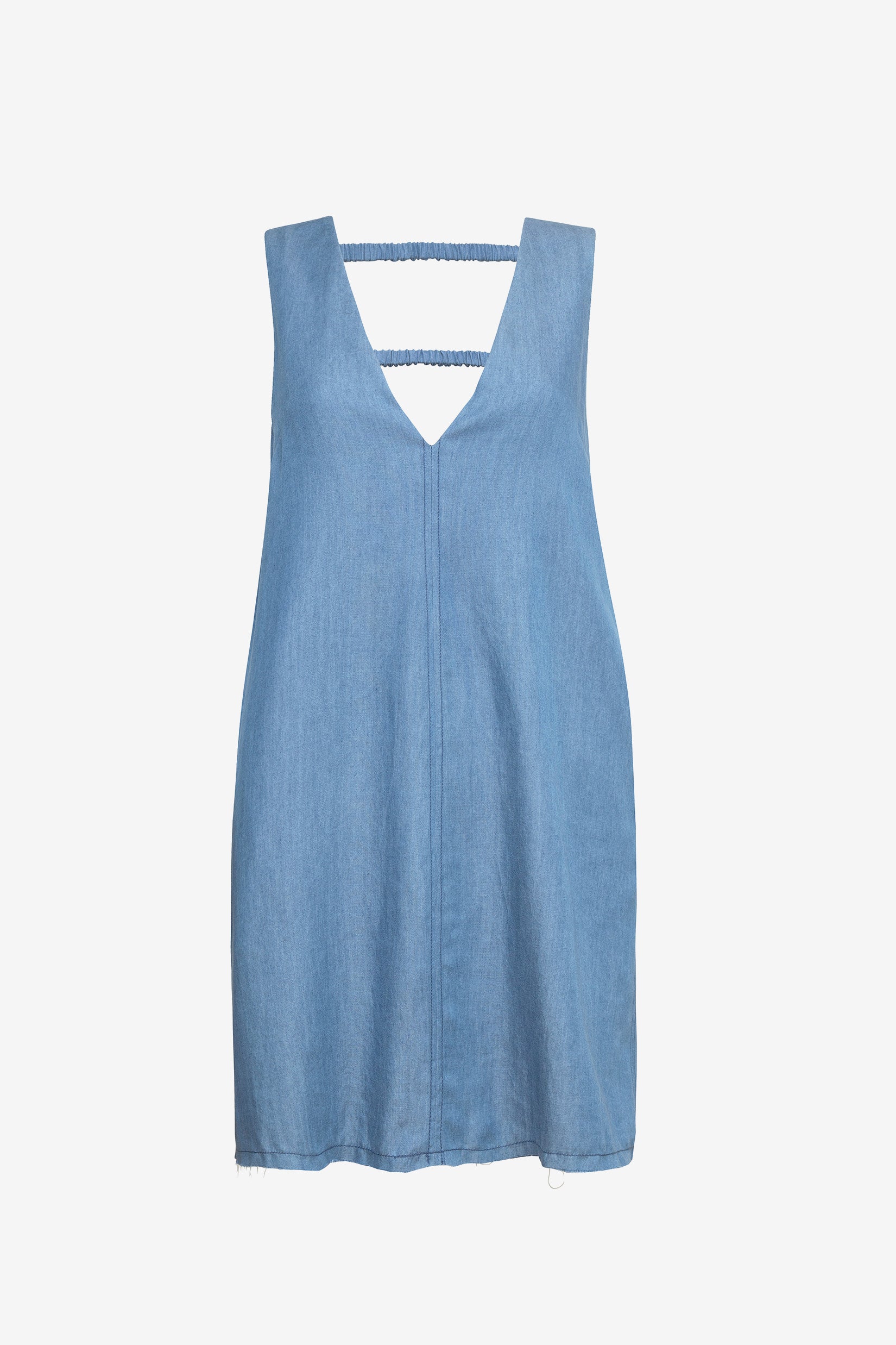 Our Denim mini shift dress, featuring a soft V-neckline, elastic gather detailing, and side pockets. Designed for ease with a relaxed, effortless silhouette.