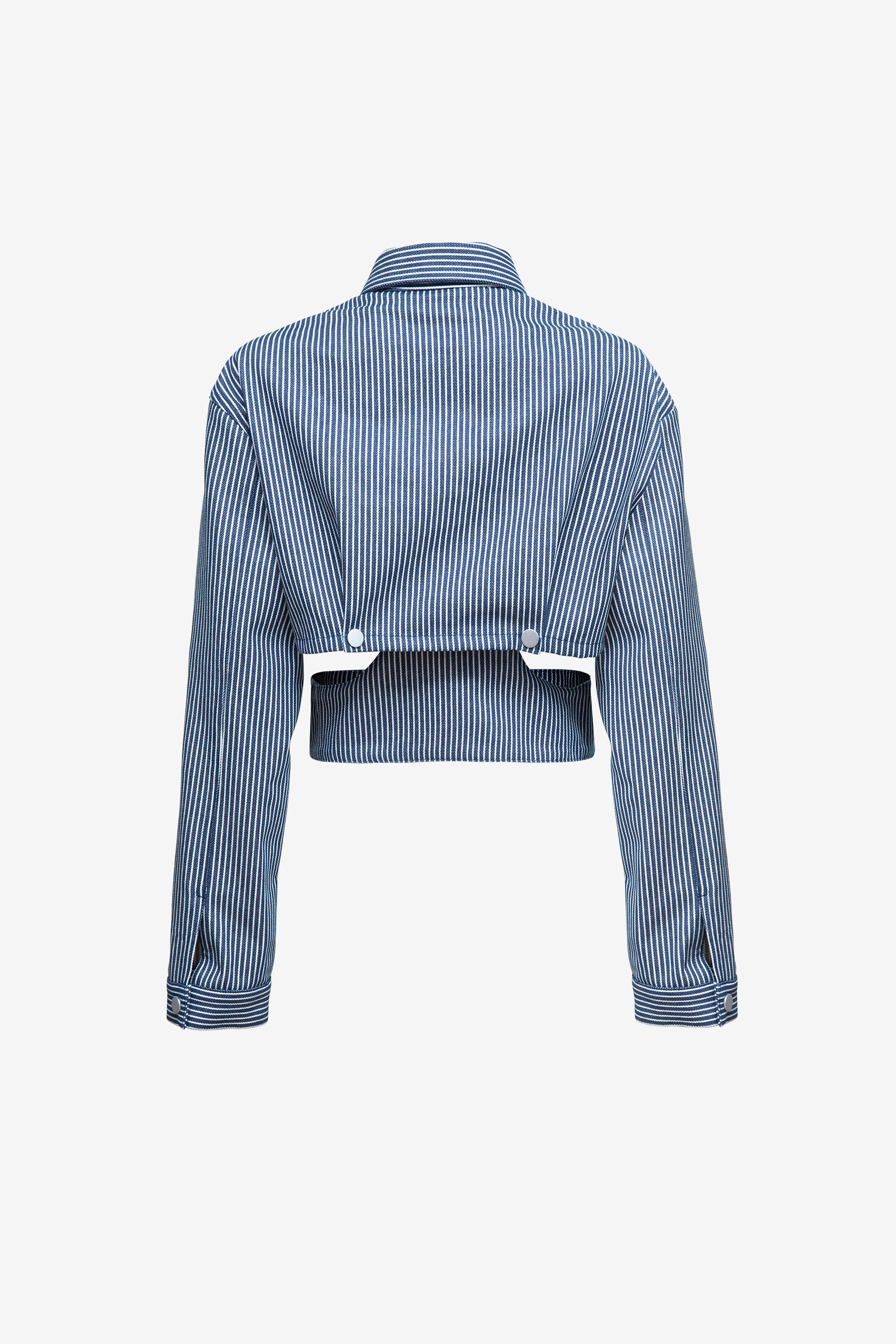 Our oversized denim striped jacket. Featuring a single suspender detail with a brand metal tag. Fabric made from 100% cotton selected from our sustainable range library.