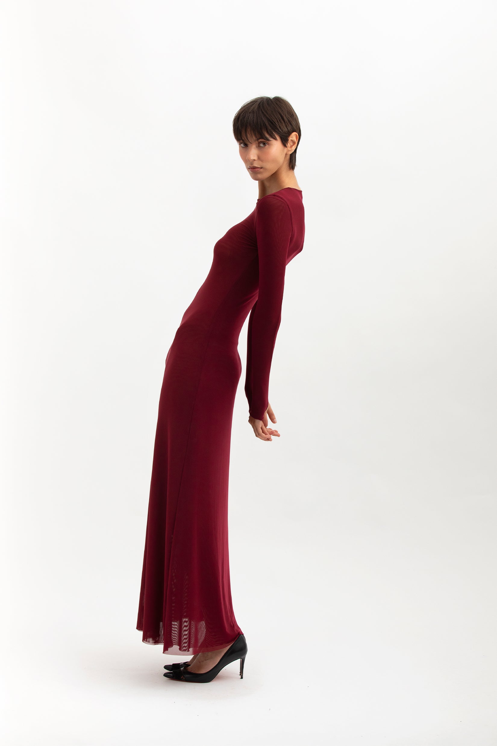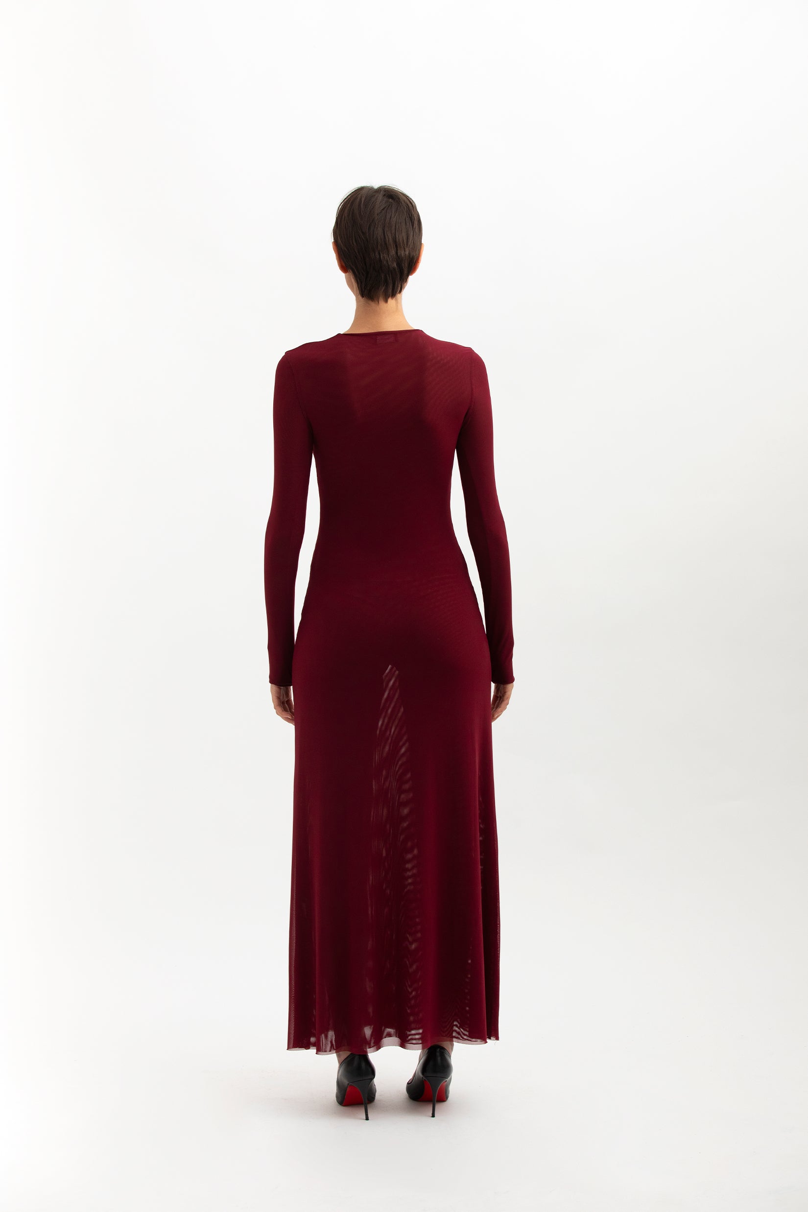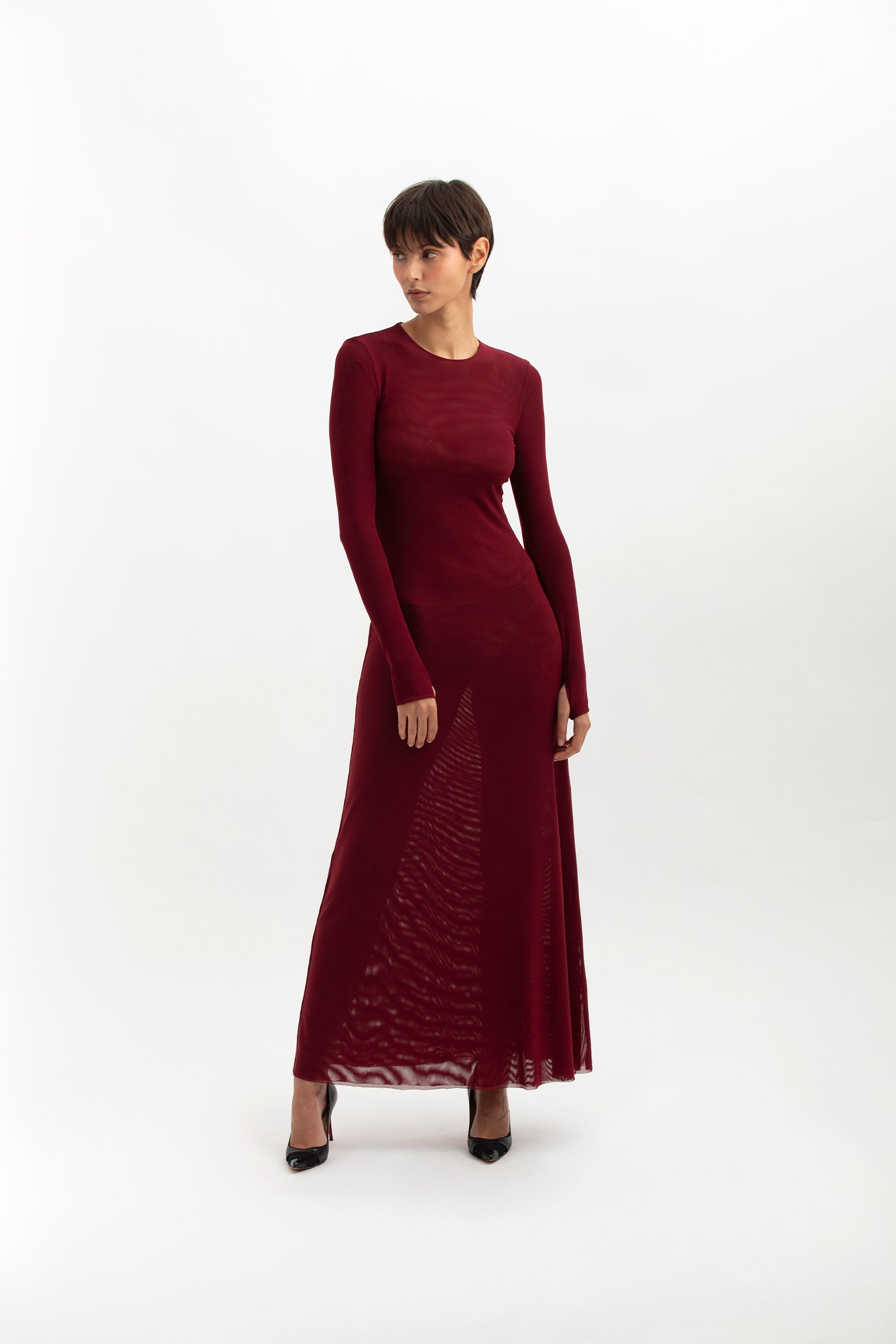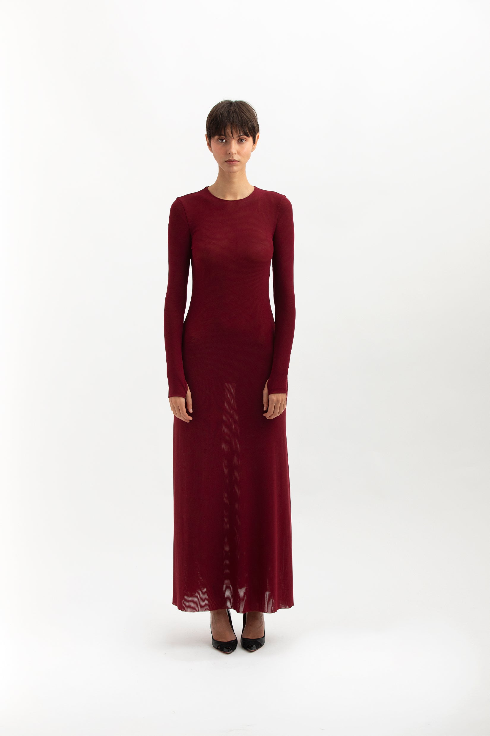 Our Mesh Maxi Dress is crafted in fluid mesh that contours the body with subtle transparency and movement. Designed in a deep Burnt Carmine hue, it features elongated sleeves with thumbhole detailing and a floor-grazing silhouette that elongates the form. A striking balance of structure and sensuality.