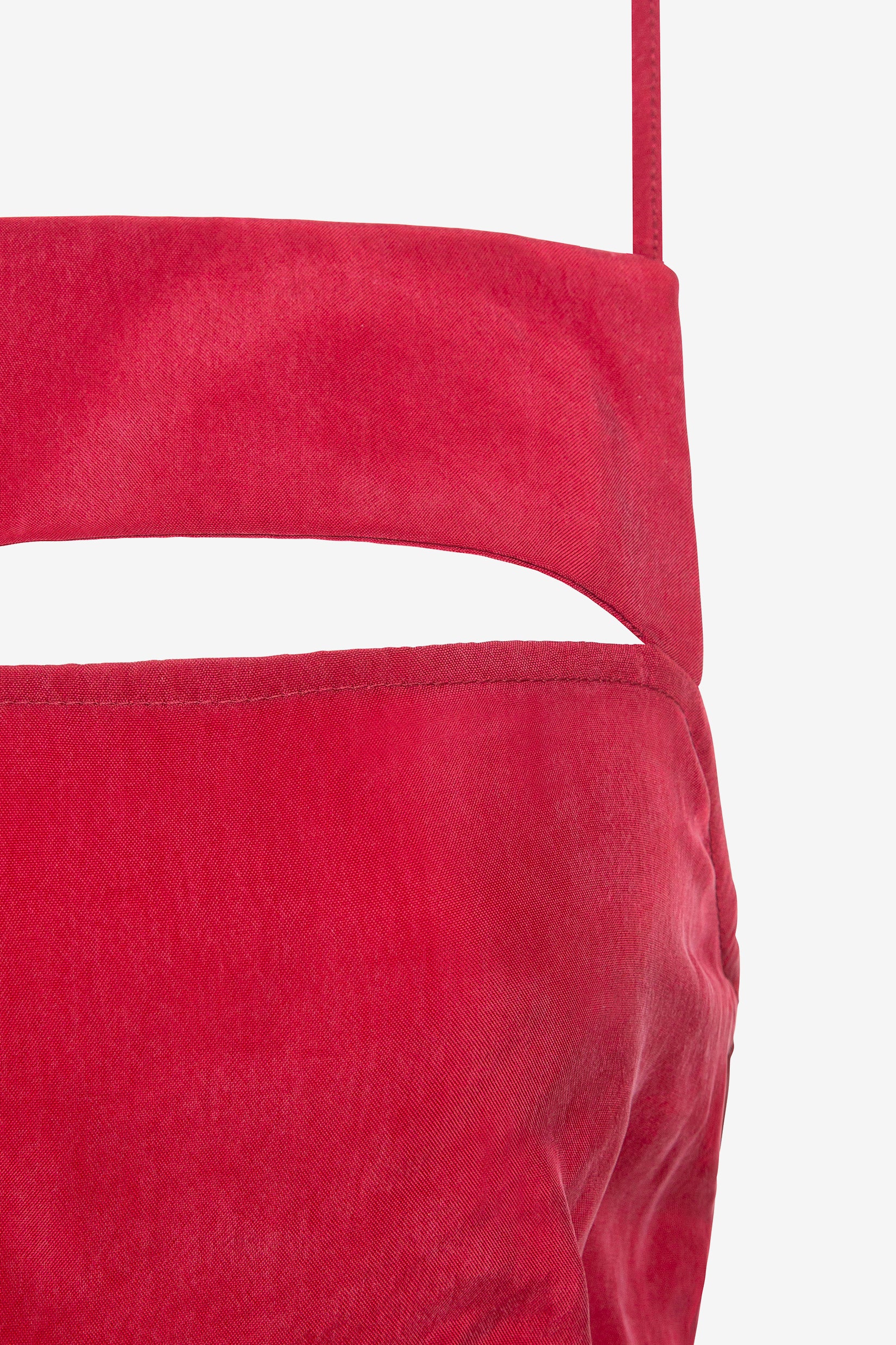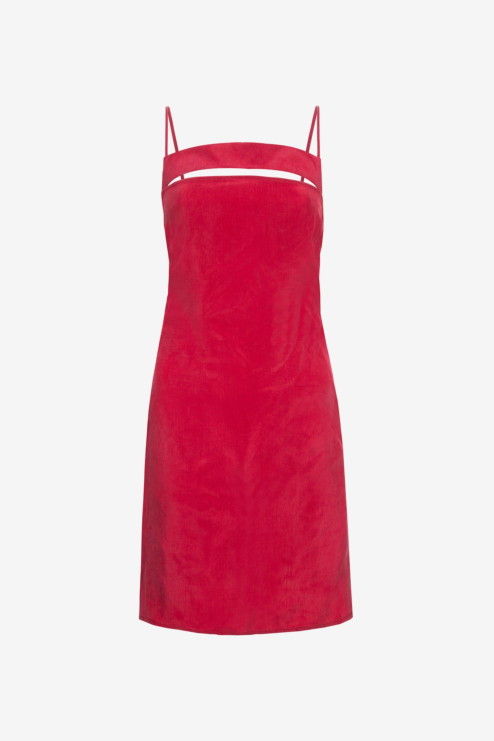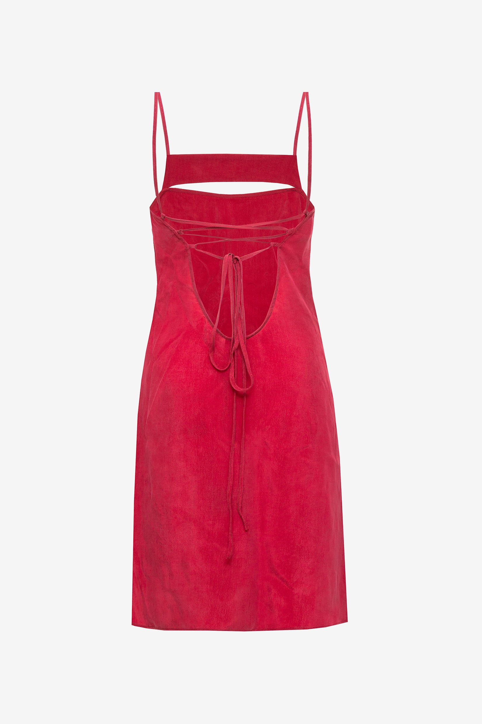 A slip dress, made from Cupro. Featuring a panel cut out detail by the bust, This style has a slightly loose fit, invisible zipper, spaghetti straps and a back accentuated by three overcross loops.