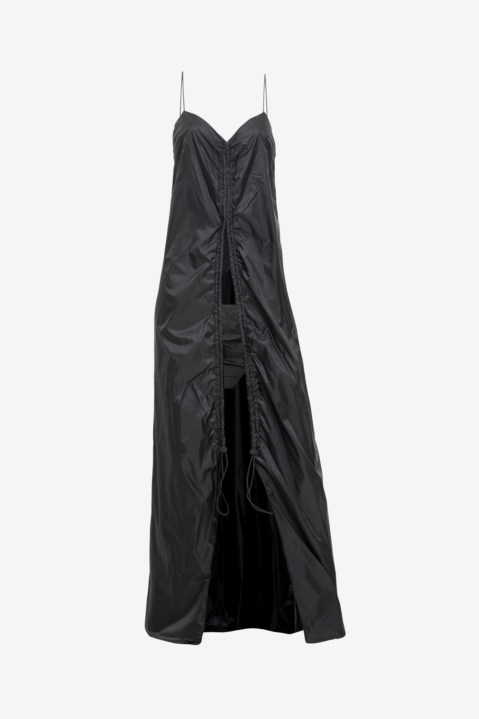 A statement athleisure dress made from 100% soft nylon produced in Italy. This style features a ruched gathered detail at the front with an eyelet closure and an adjustable elastic cord-toggle finish. The back features an elastic gathered neckline and strappy adjustable cord straps. This style is fully-lined. Each piece is handmade in our Barcelona atelier.