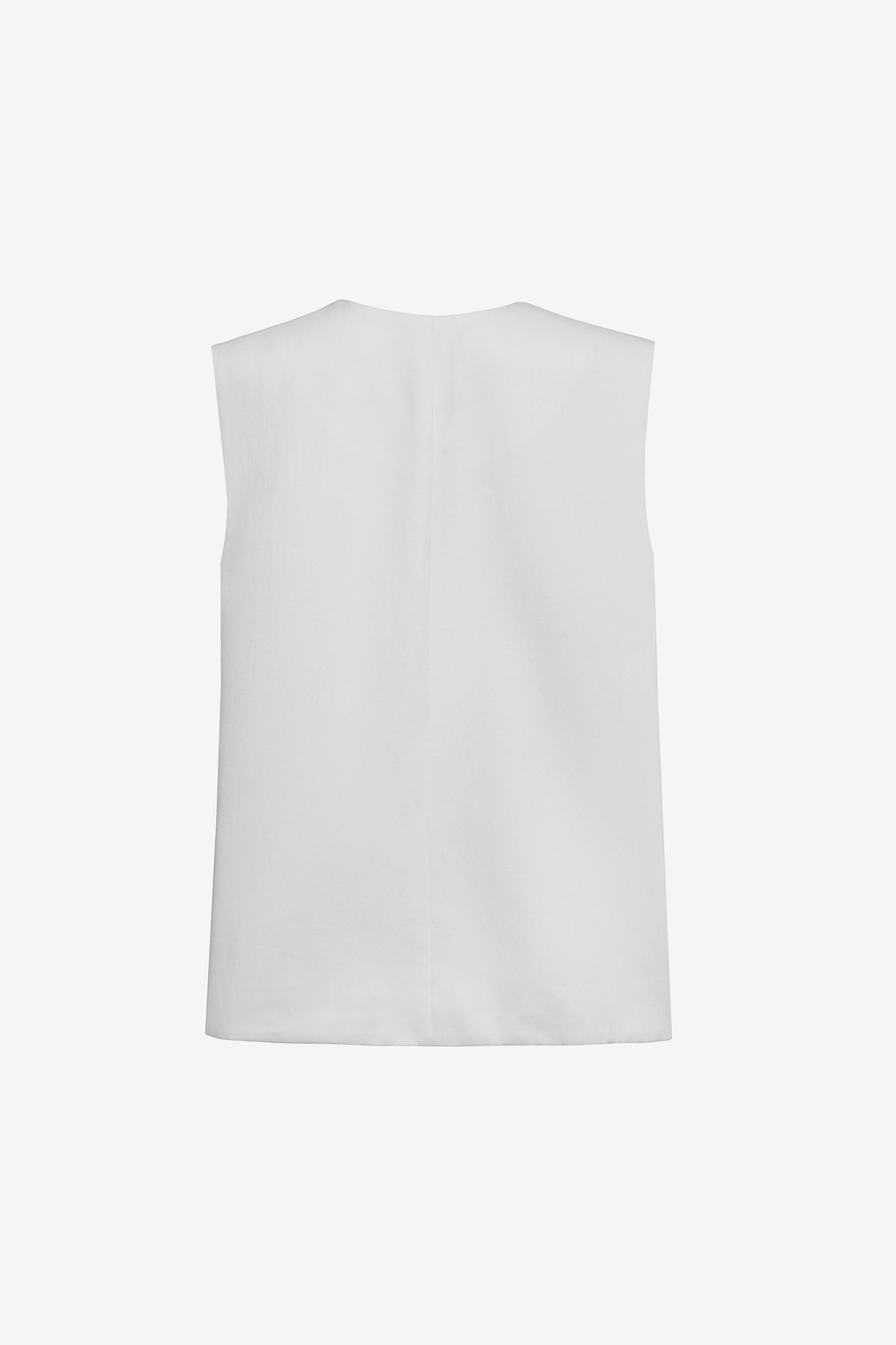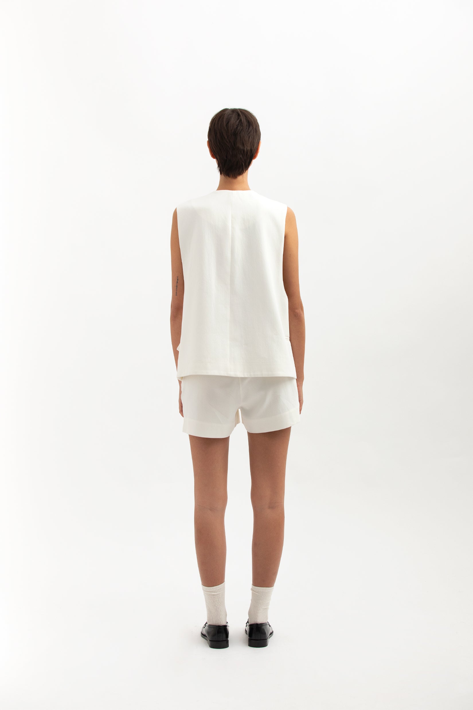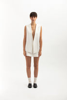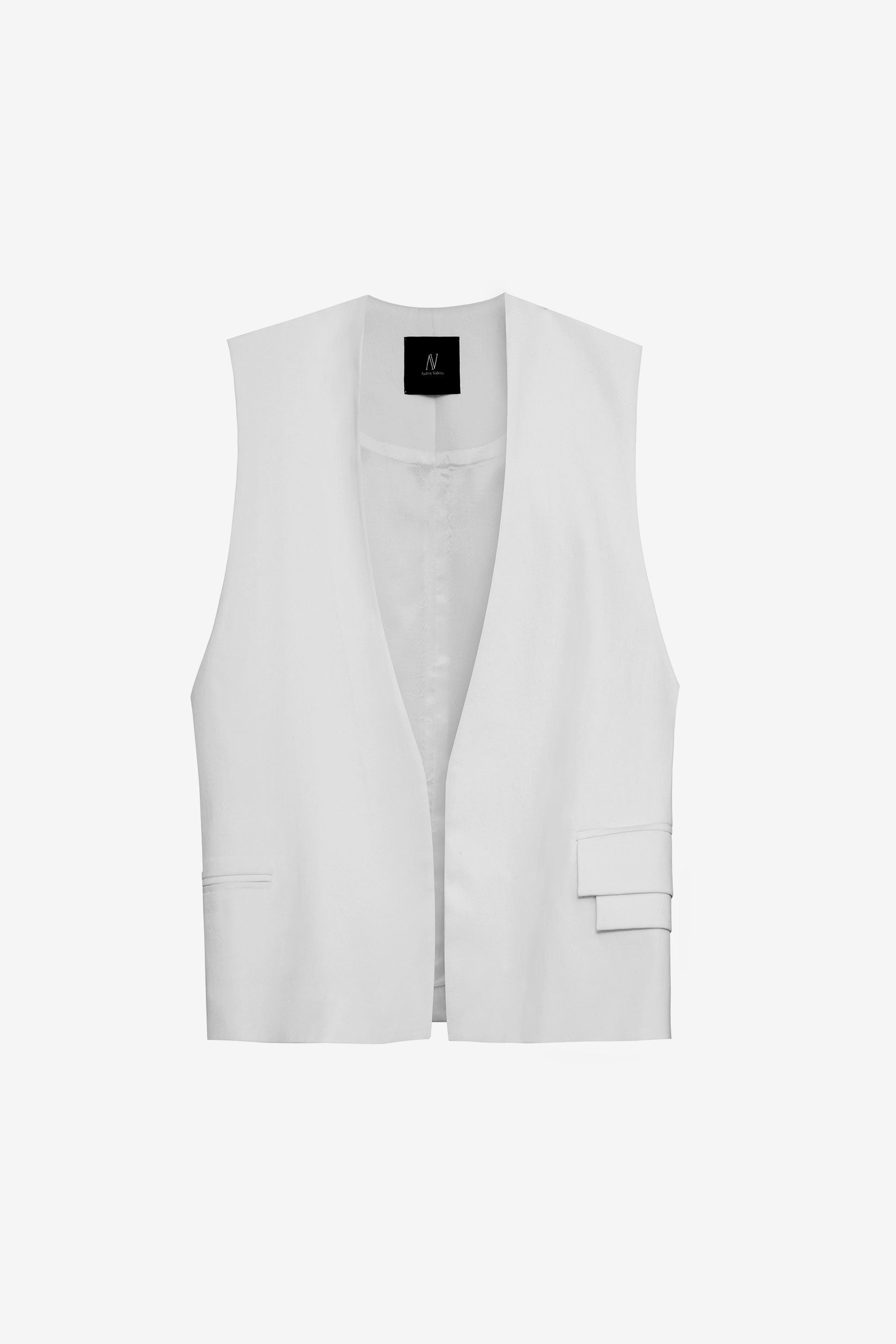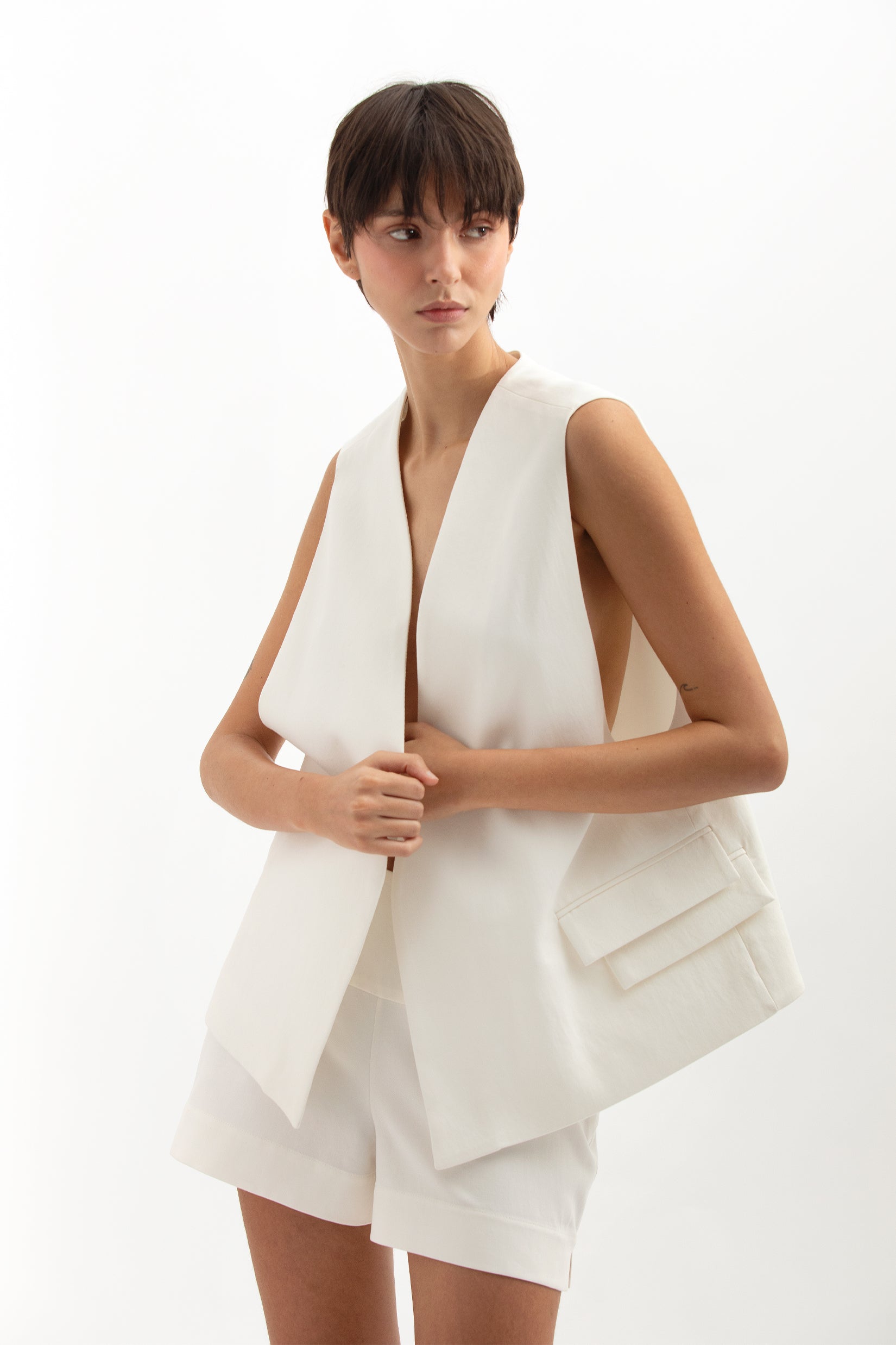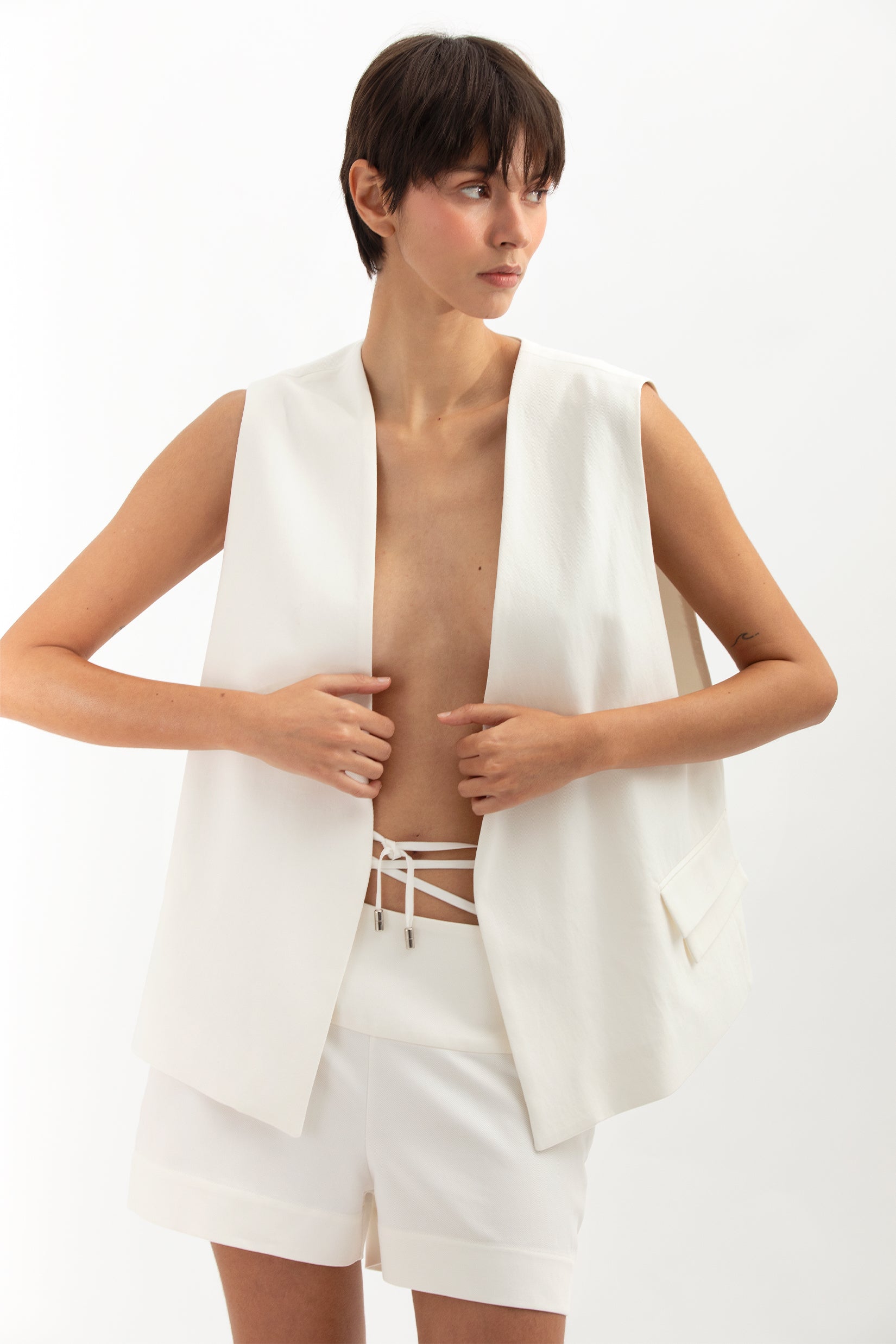 Our Selene Twill Vest is tailored in off-white twill, designed as an open vest with a clean, minimalist line. Finished with two flap pocket details that add subtle structure, it serves as a refined layering piece.