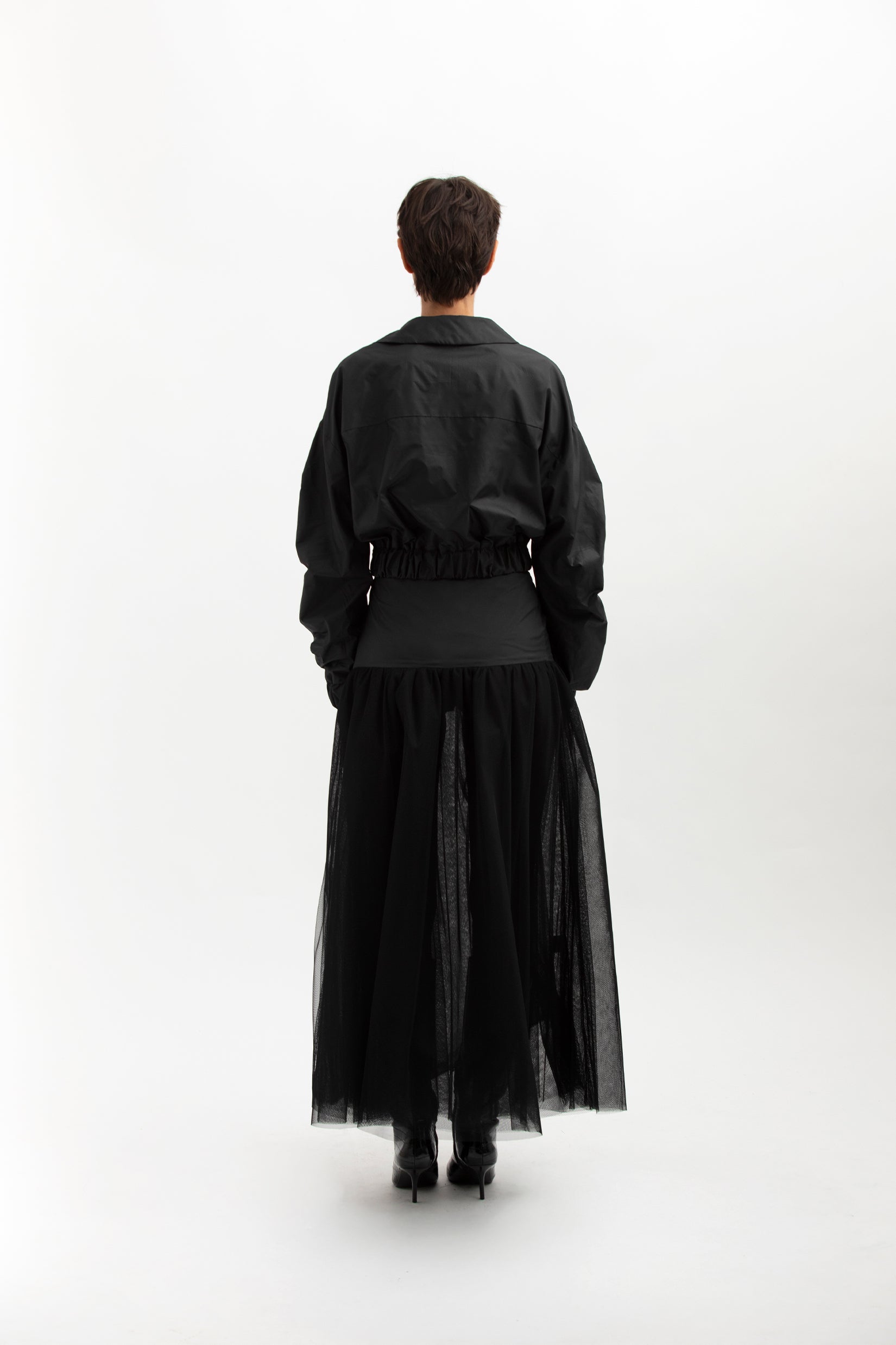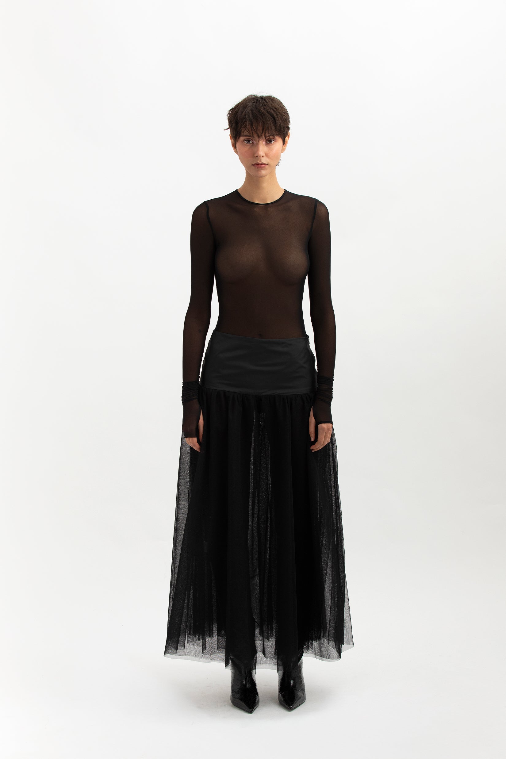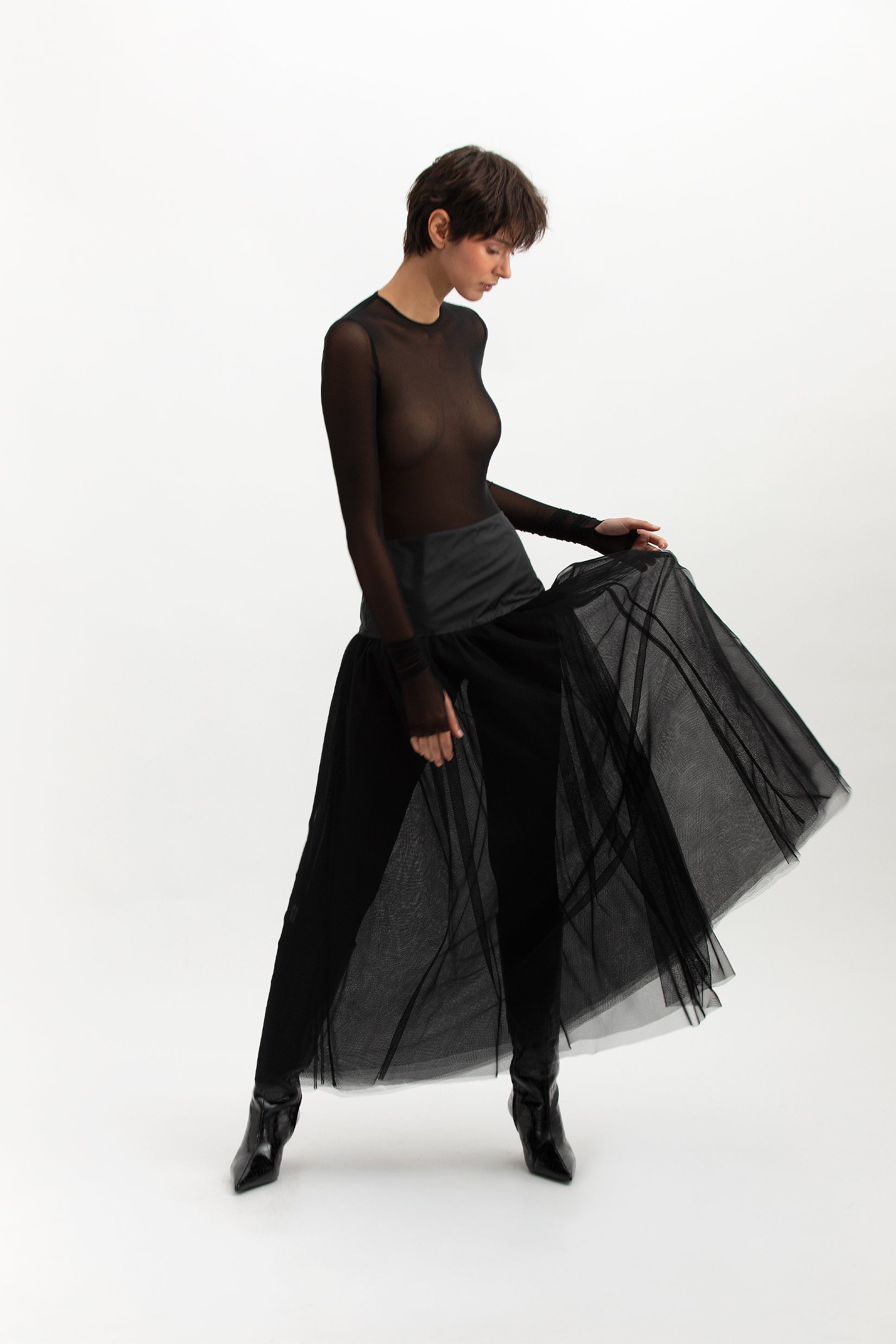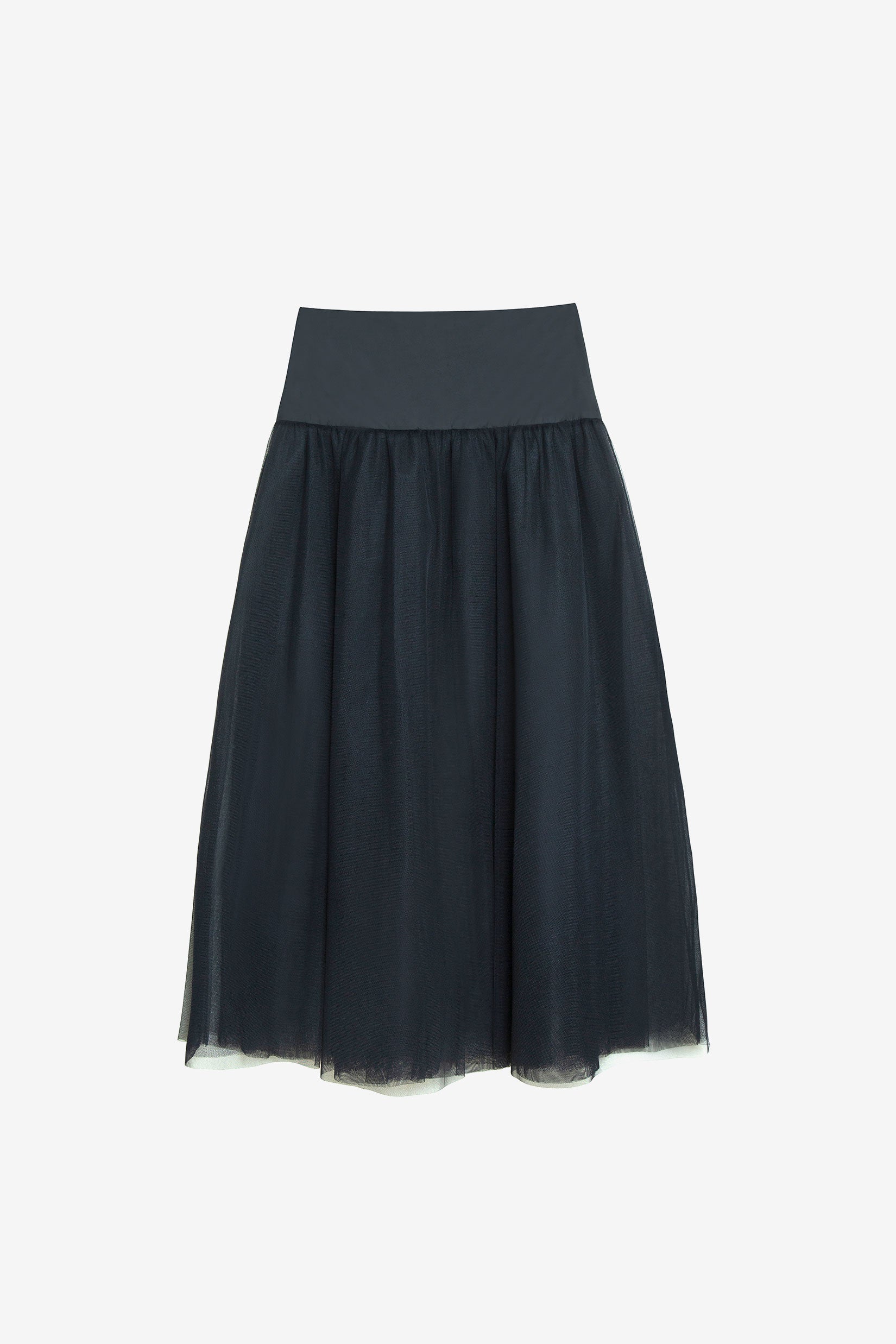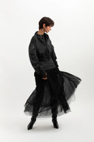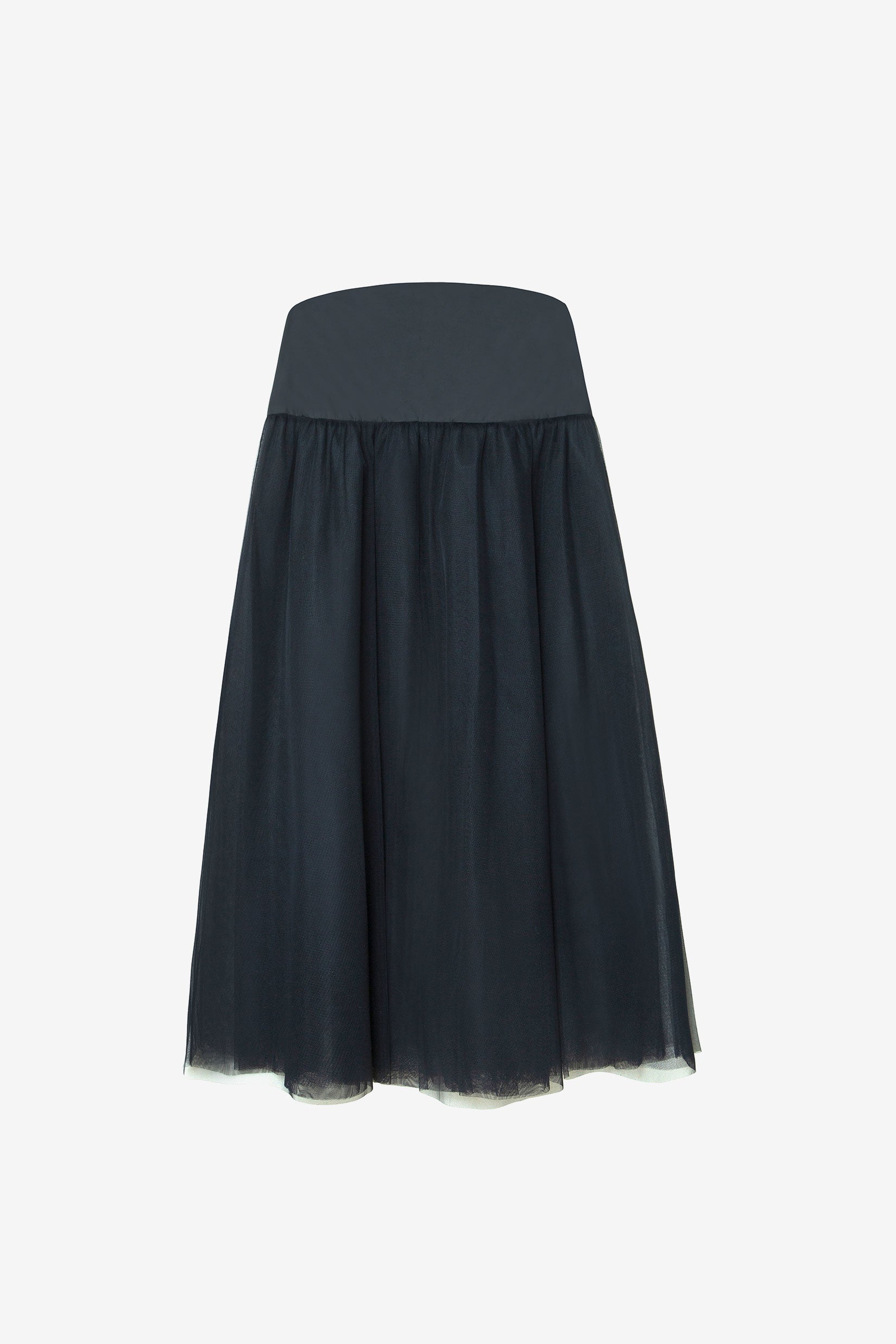 Our Selene Tulle Skirt is crafted in layers of soft noir tulle, designed with subtle gathering to create light, fluid volume. Cut to a floor-length silhouette and offered in one size, it moves with quiet grace and modern ease.