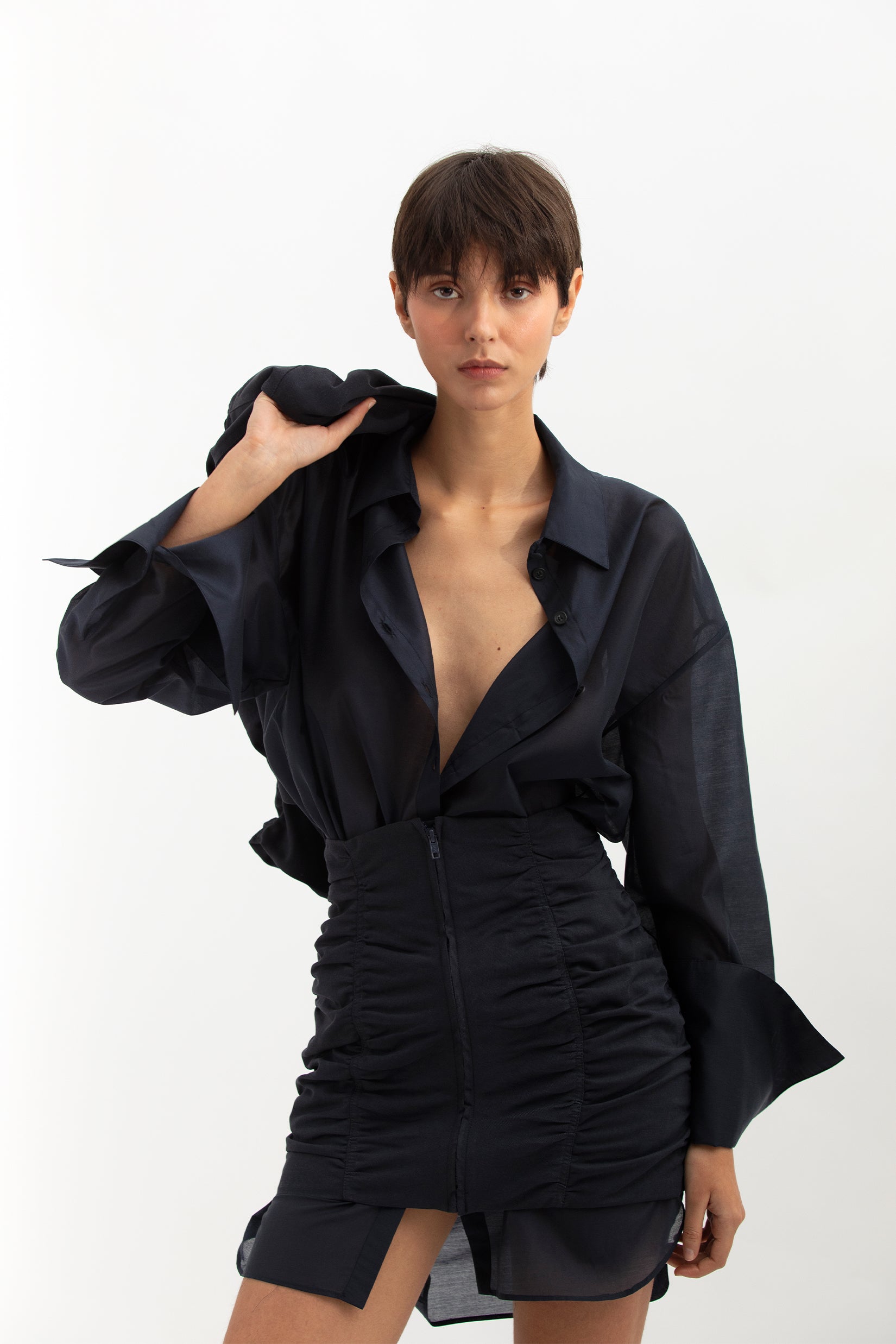 Our Selene Corset Skirt is inspired by the All-Gen silhouette, crafted from a soft twill blend of lyocell and cotton for a sculpted yet effortless feel. Designed in a muted Ash tone with subtle ruching, it can be styled over a dress shirt to redefine proportion and form. A contemporary piece that blends structure with ease.