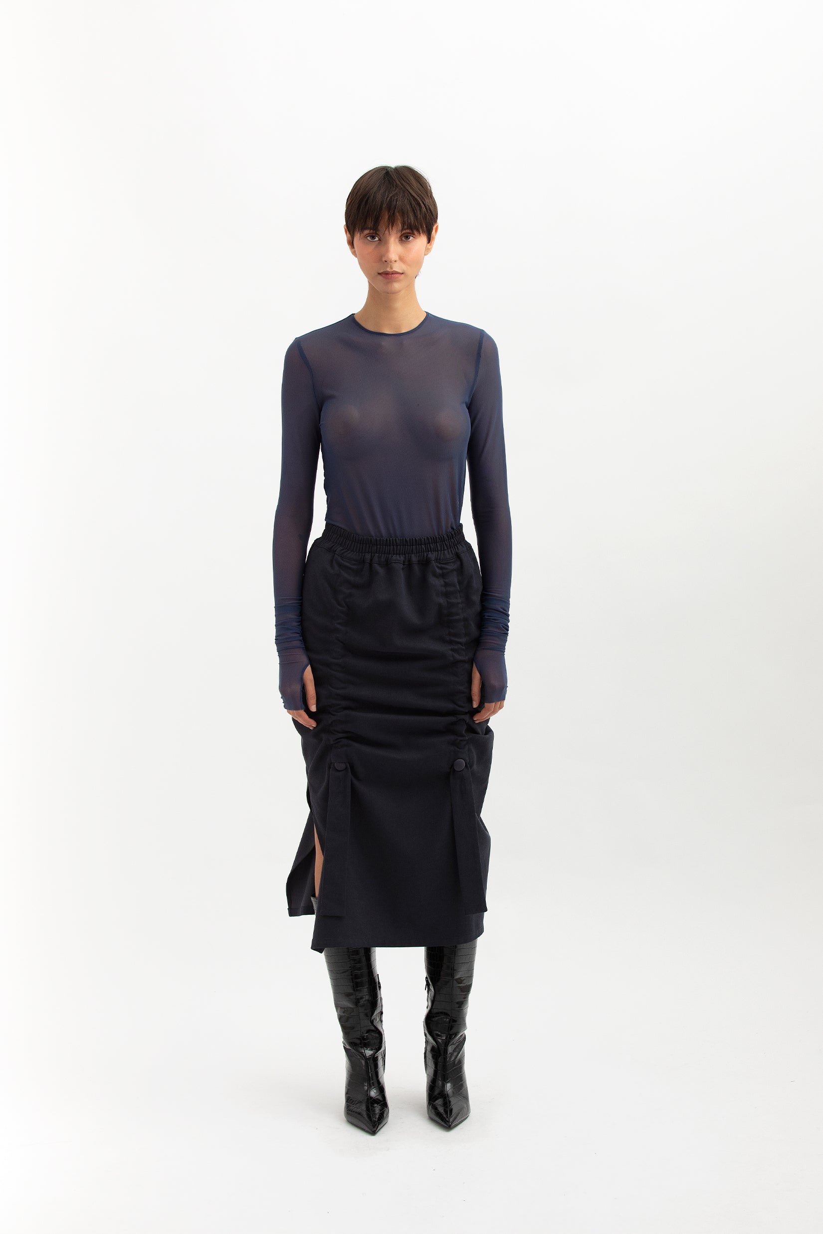 Our Selene Twill Skirt is inspired by the All-Gen silhouette, crafted from a soft twill blend of lyocell and cotton that moves with quiet fluidity. Designed in a muted Ash tone with delicate ruching, it can be worn straight or softly gathered to shape the form. A versatile piece that defines modern understatement.