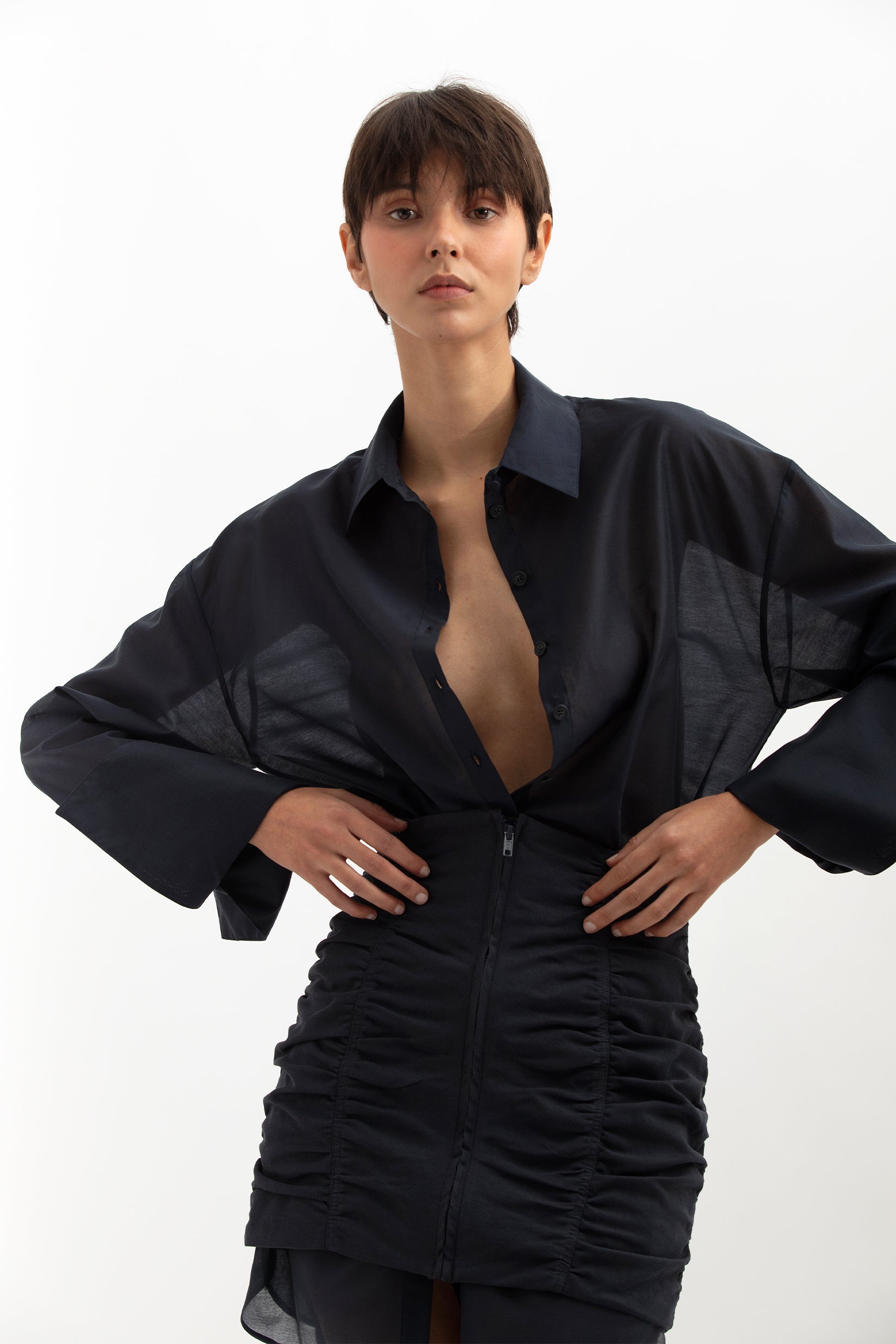 Our Selene Corset Skirt is inspired by the All-Gen silhouette, crafted from a soft twill blend of lyocell and cotton for a sculpted yet effortless feel. Designed in a muted Ash tone with subtle ruching, it can be styled over a dress shirt to redefine proportion and form. A contemporary piece that blends structure with ease.