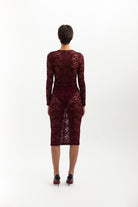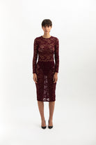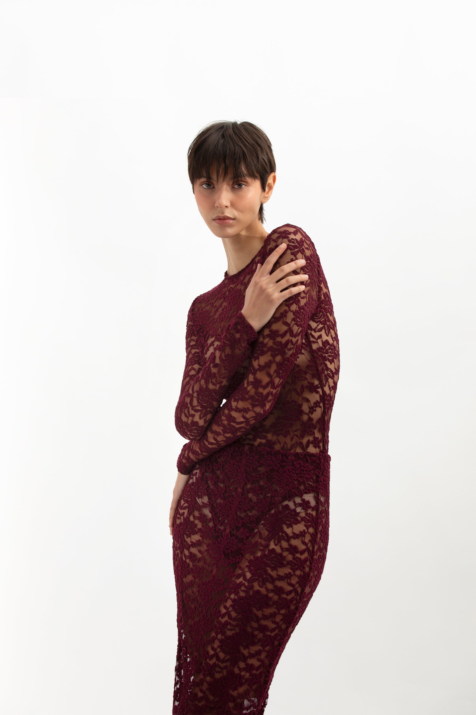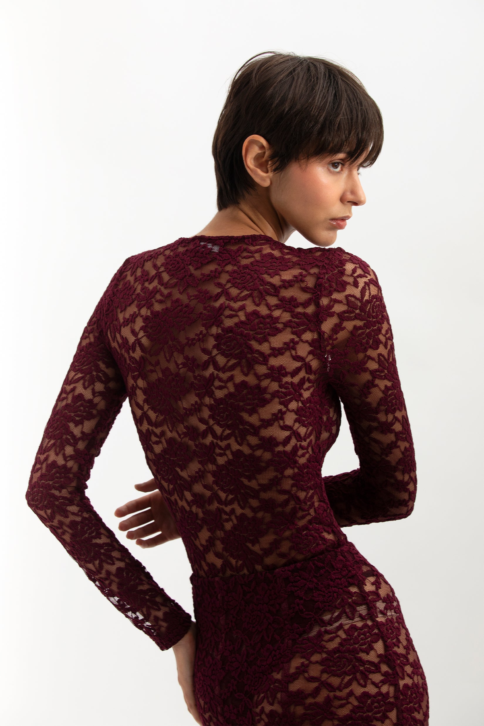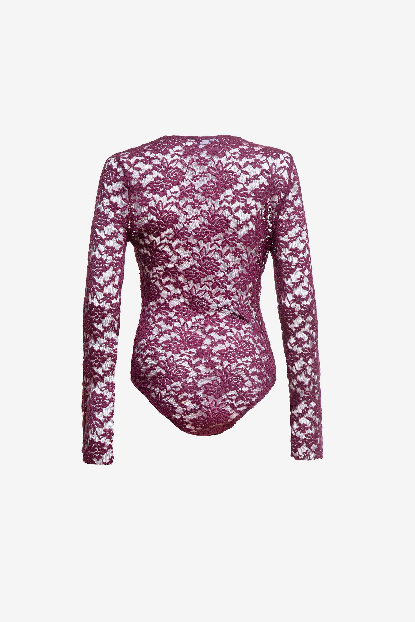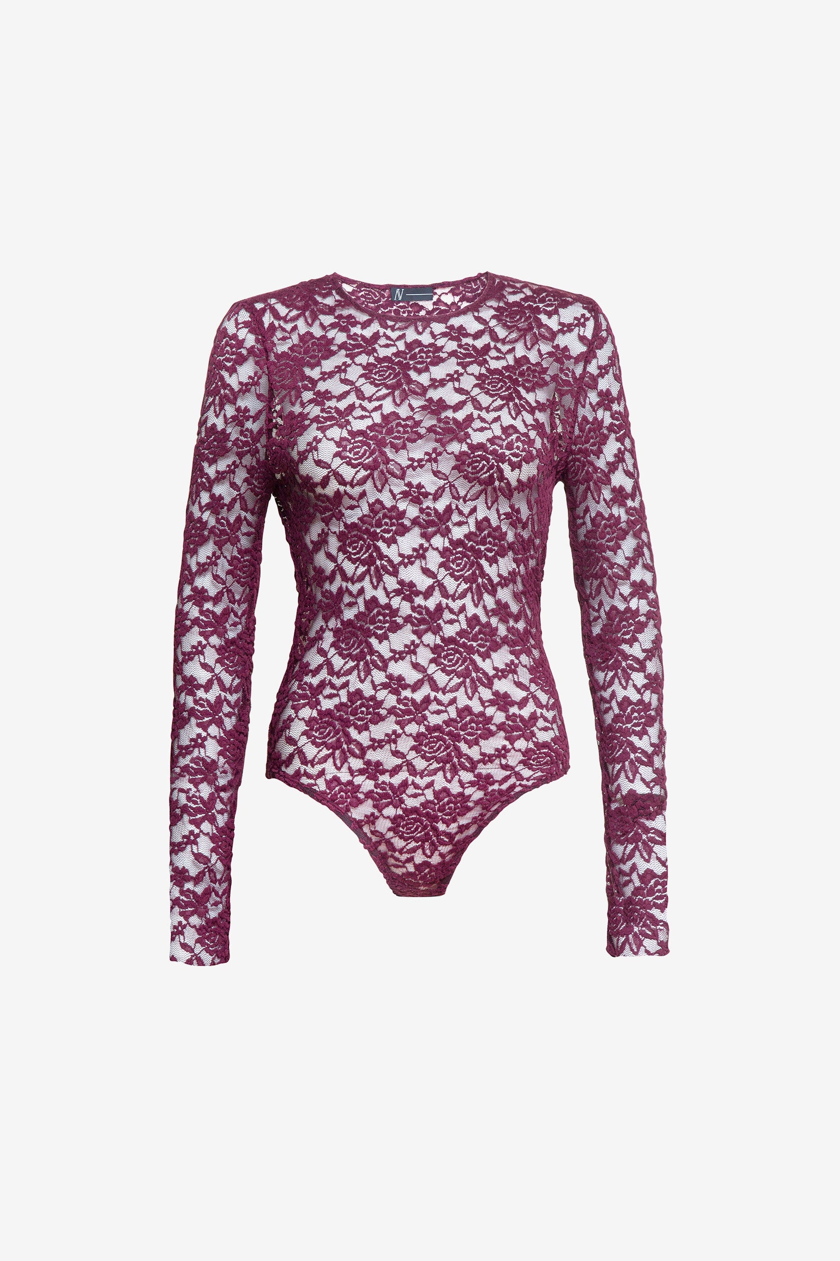 Our Selene Lace Bodysuit is crafted from intricate burnt carmine lace, combining delicate transparency with a sculpted fit. Designed with elongated sleeves finished with thumbholes and a discreet snap closure, it’s a modern interpretation of feminine strength and ease.