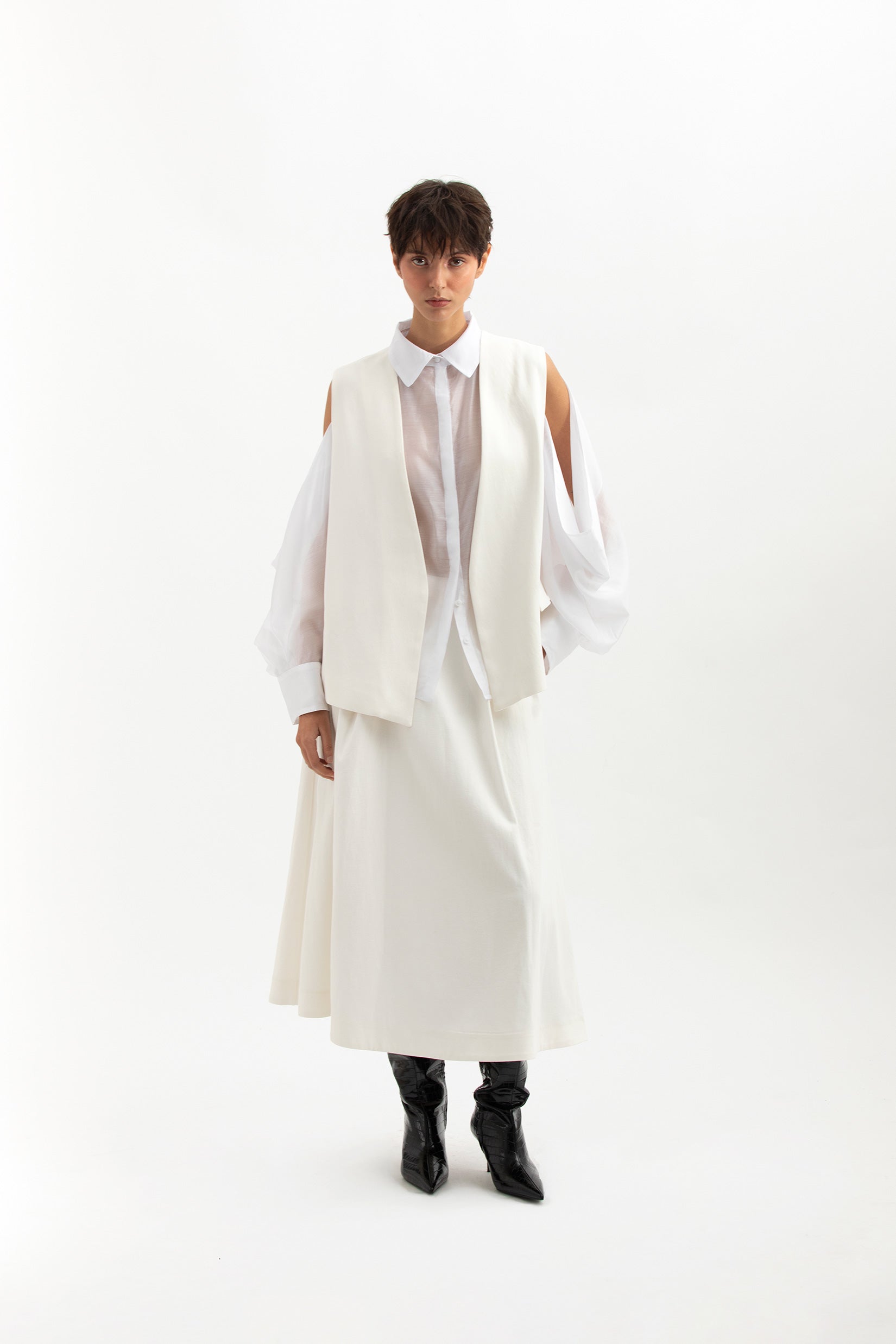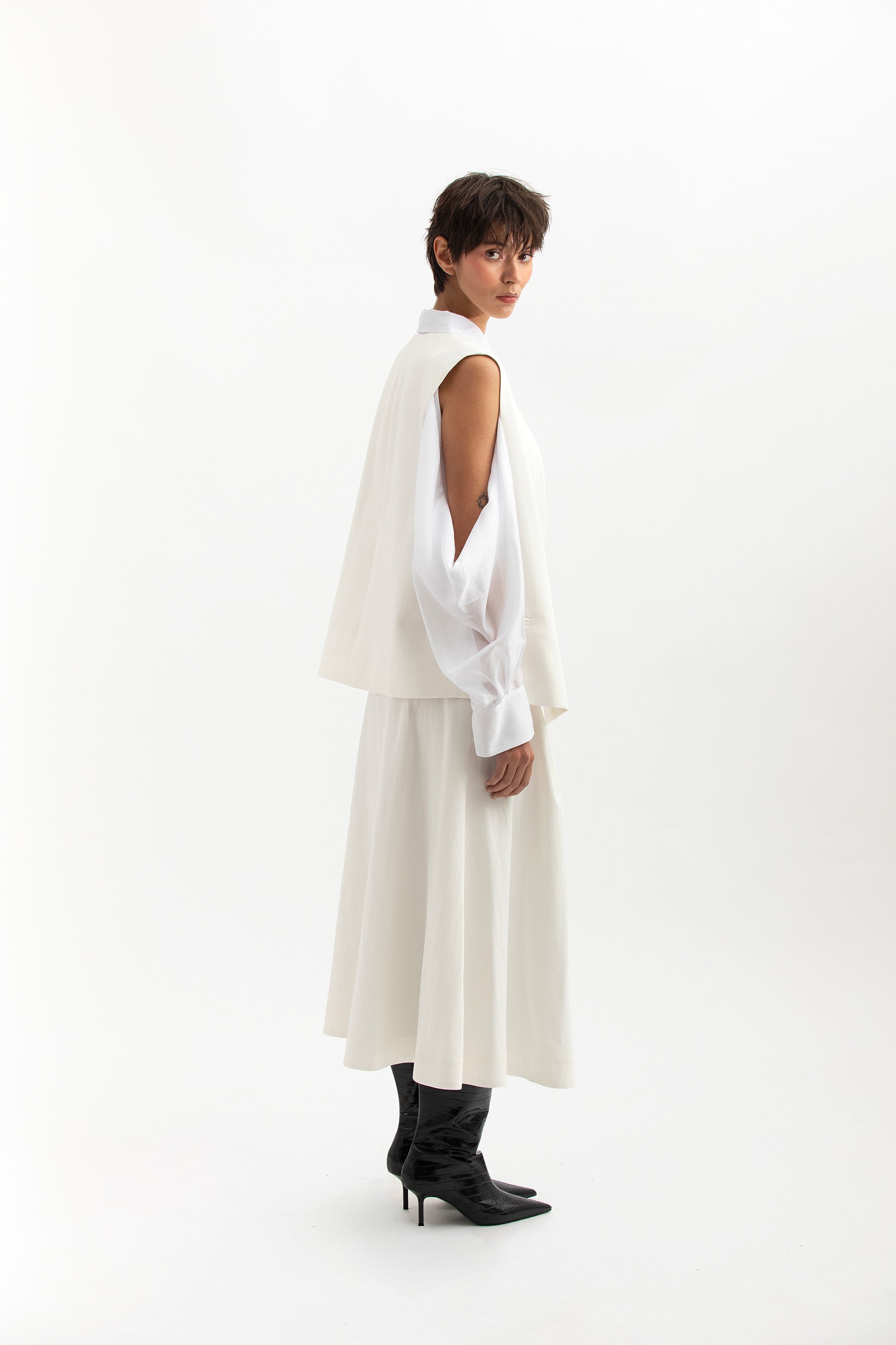Our Selene Twill Skirt is crafted in off-white twill, cut to a classic mid-length A-line silhouette. It offers timeless elegance with clean, refined lines.
