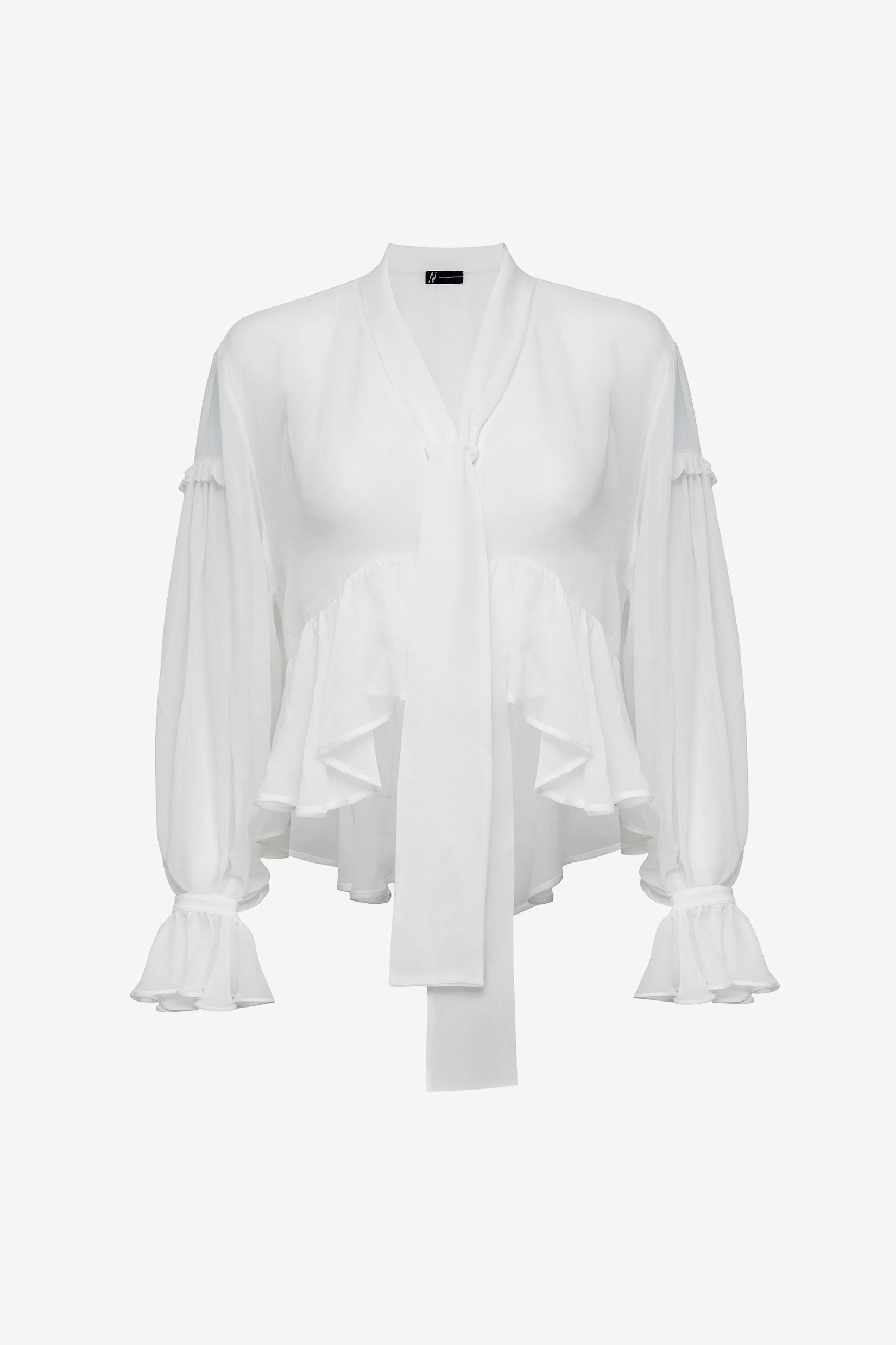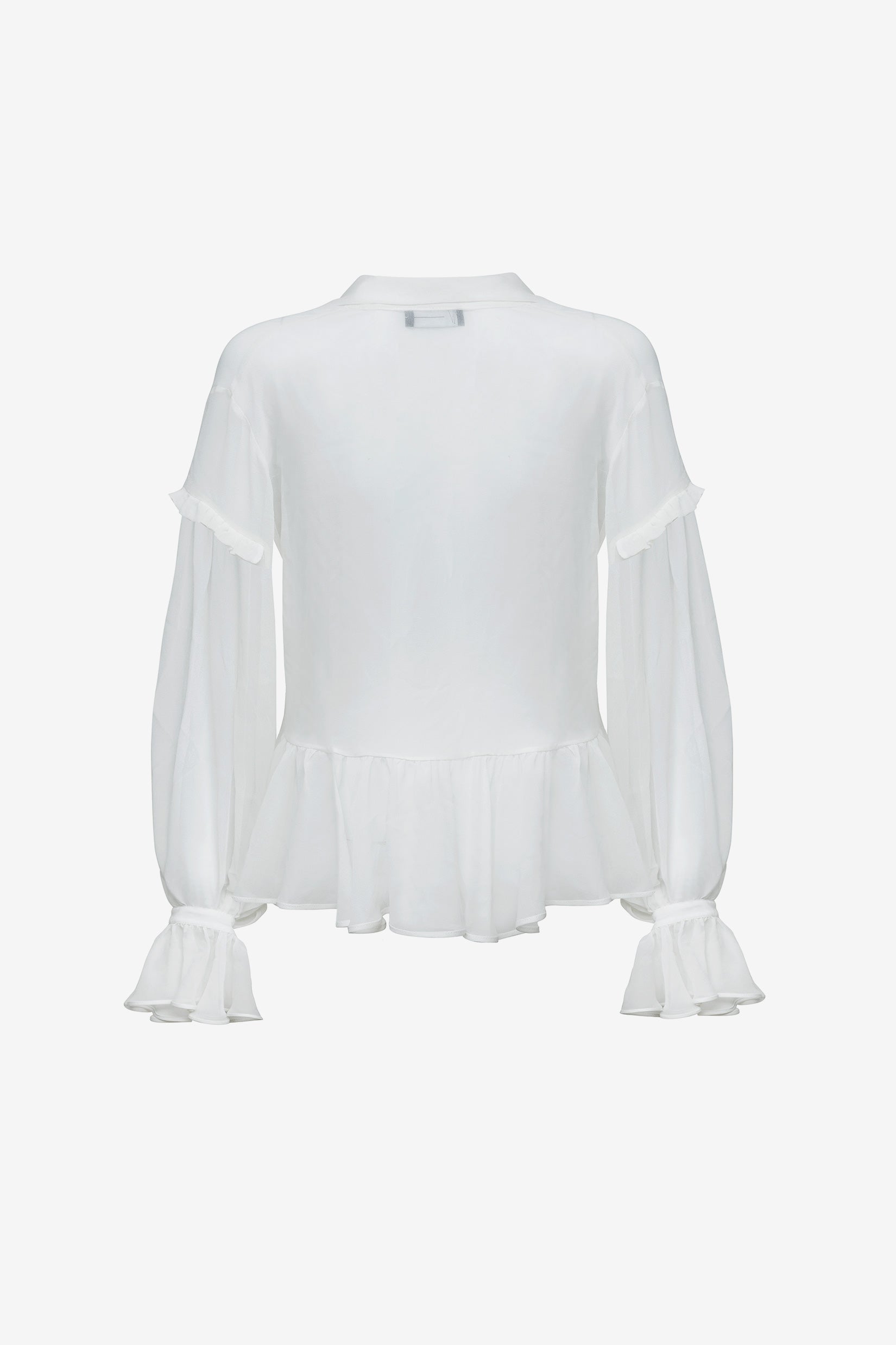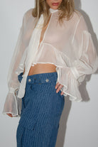 Our Miss AV Chiffon ruffle shirt. Made from 100% silk selected from our sustainable range library. Featuring cropped ruffled sleeves and body detail.