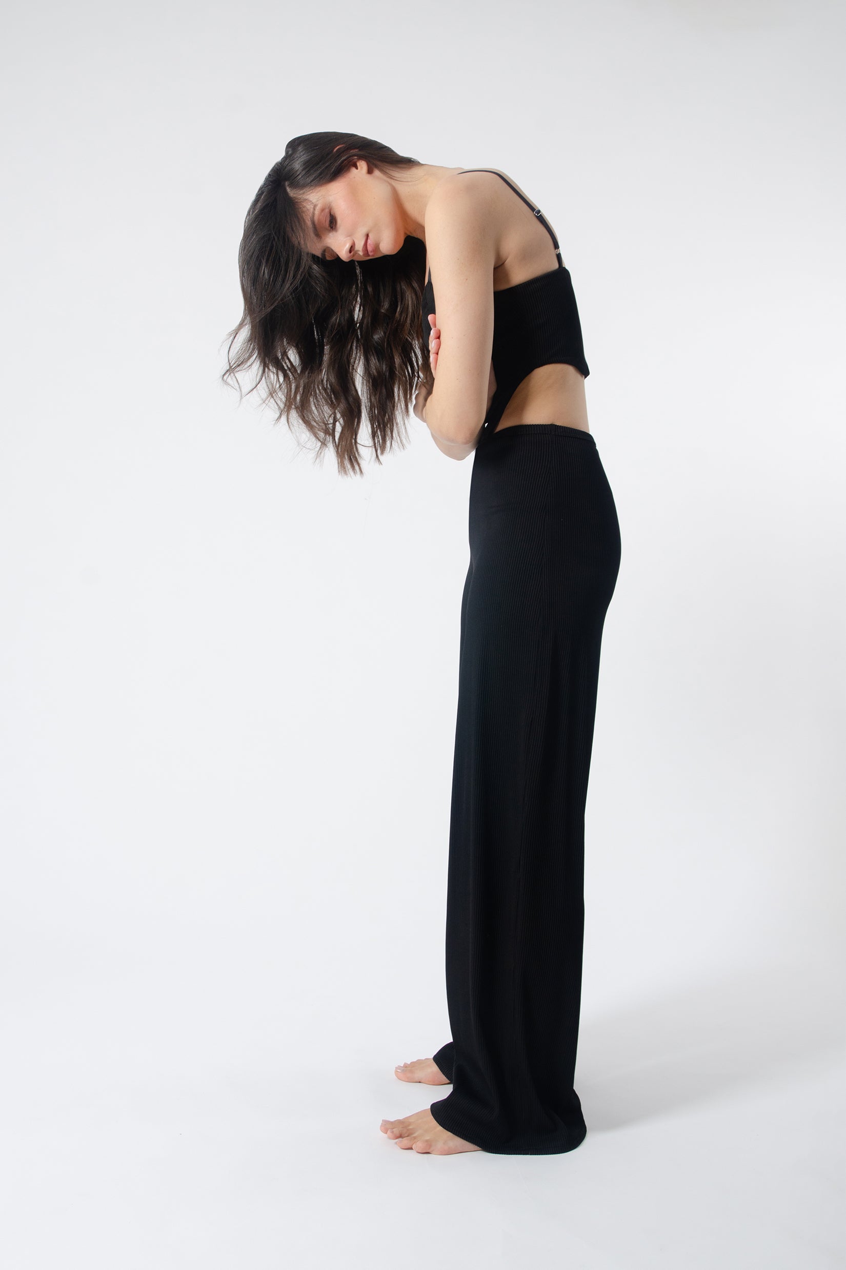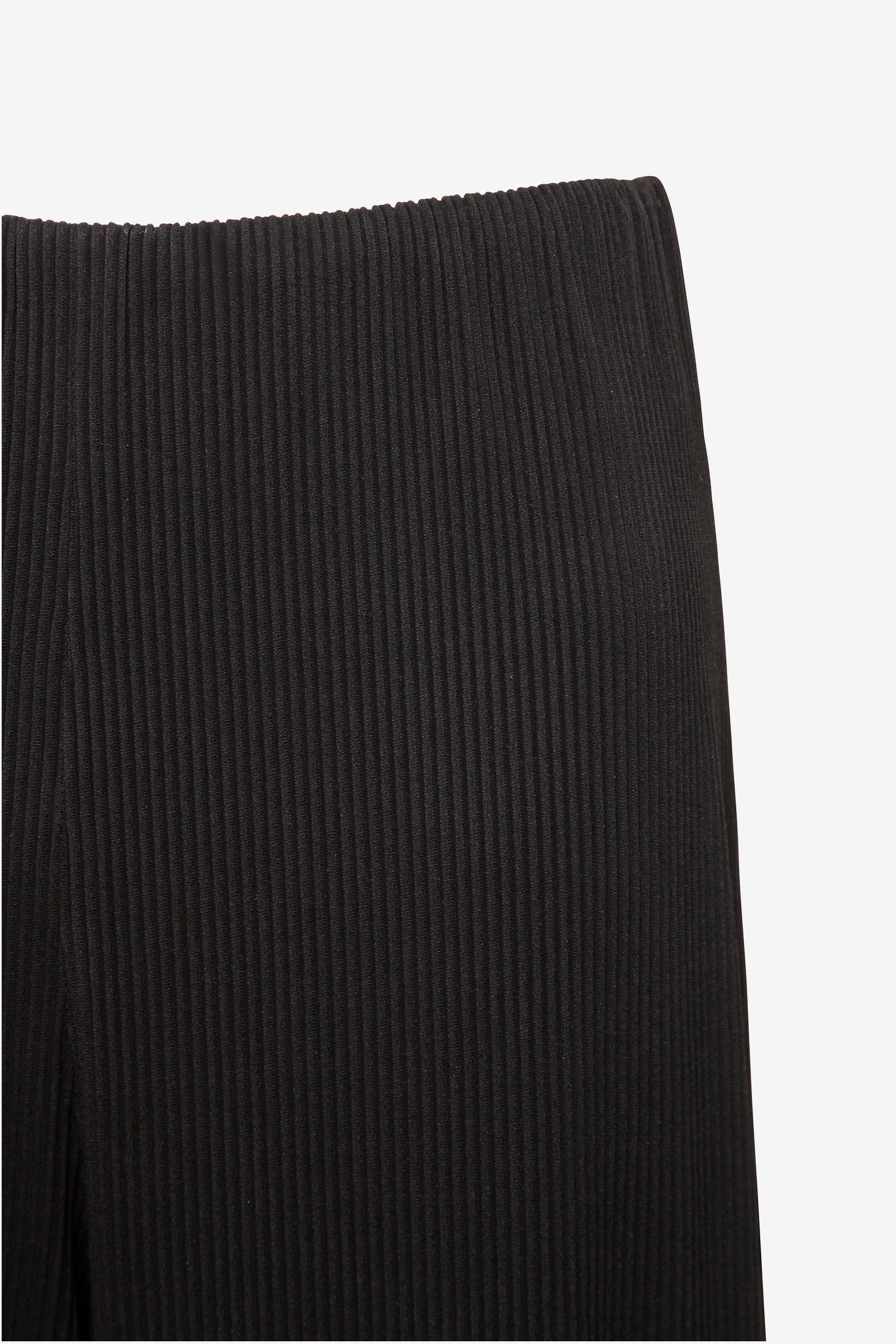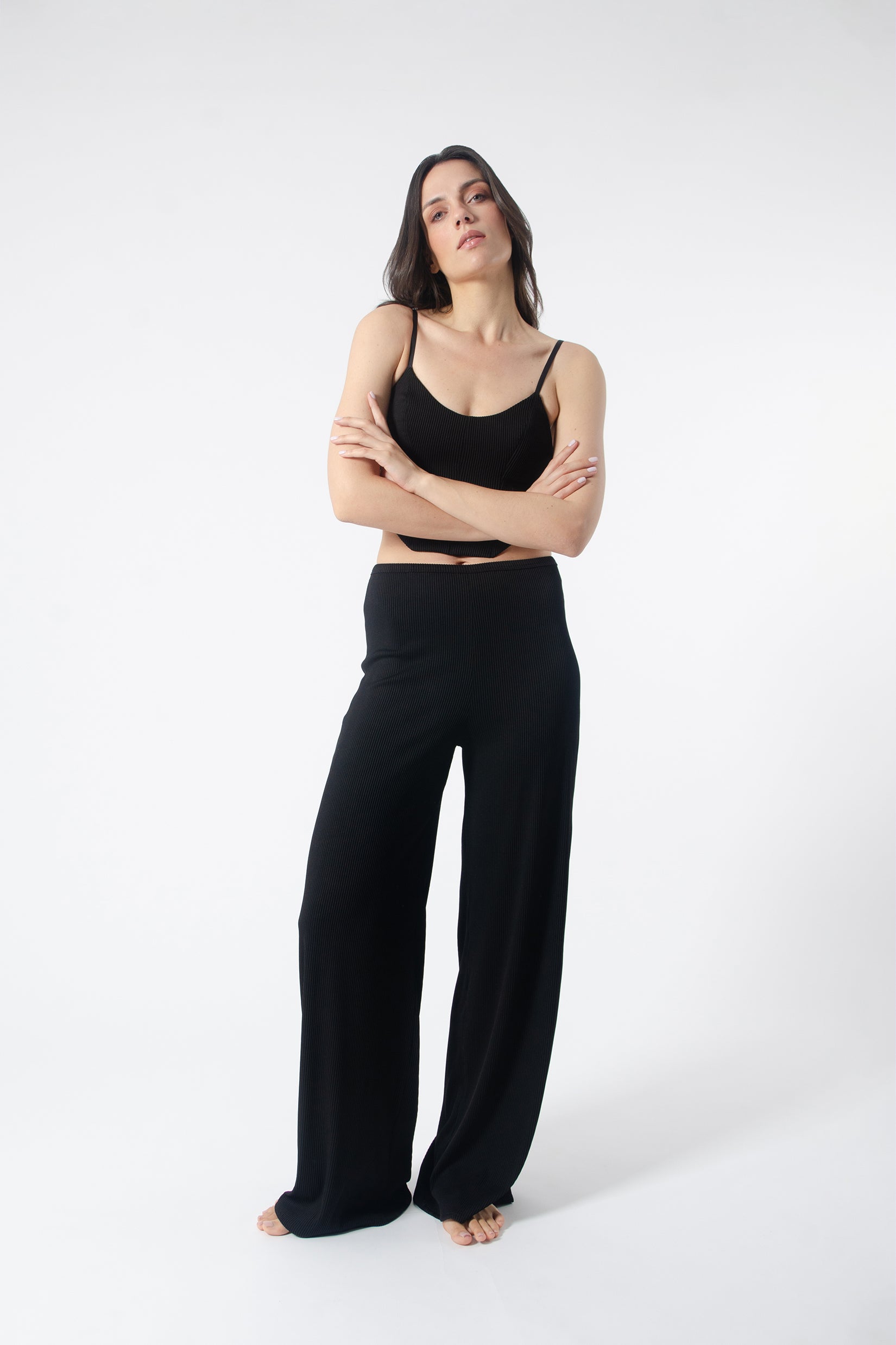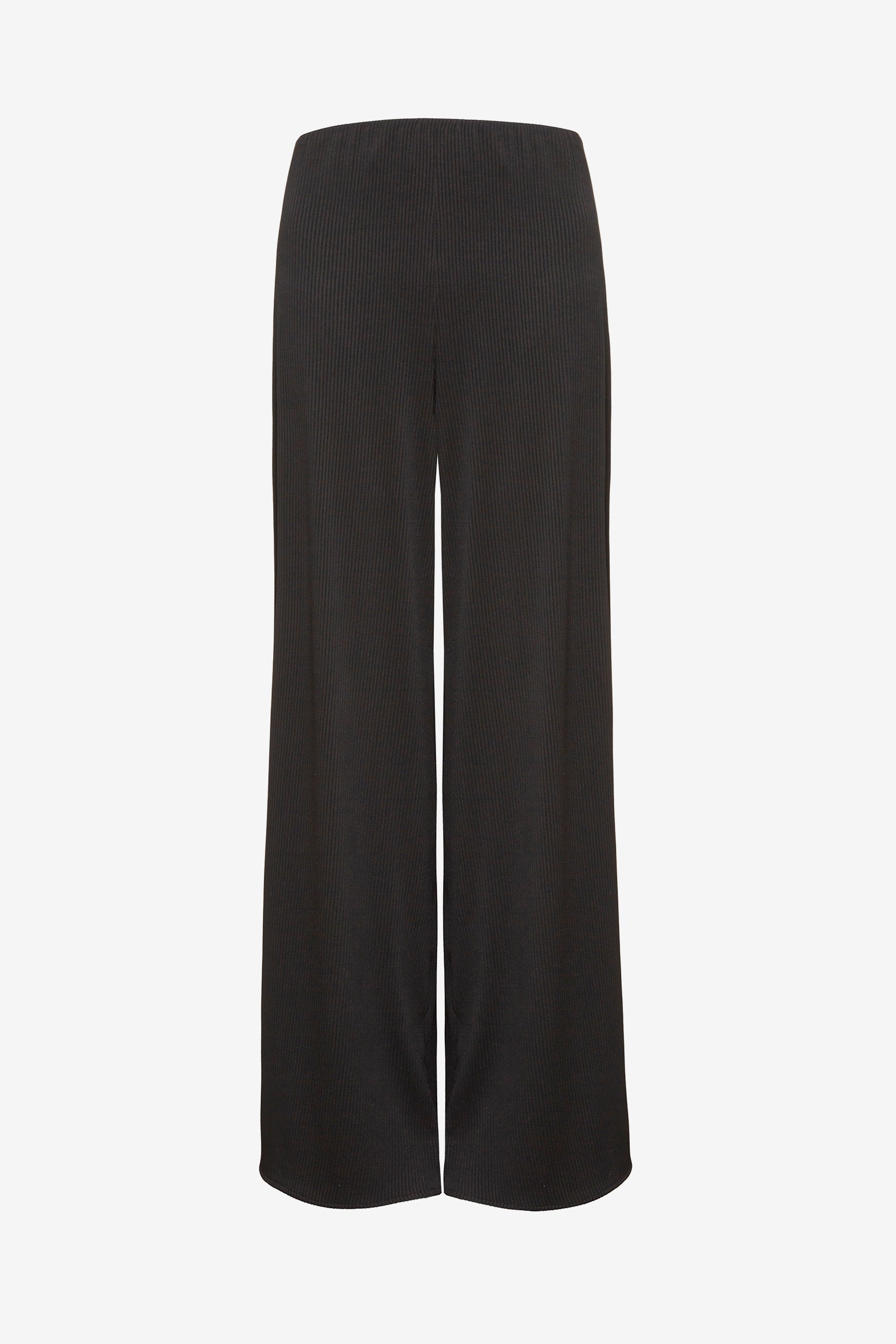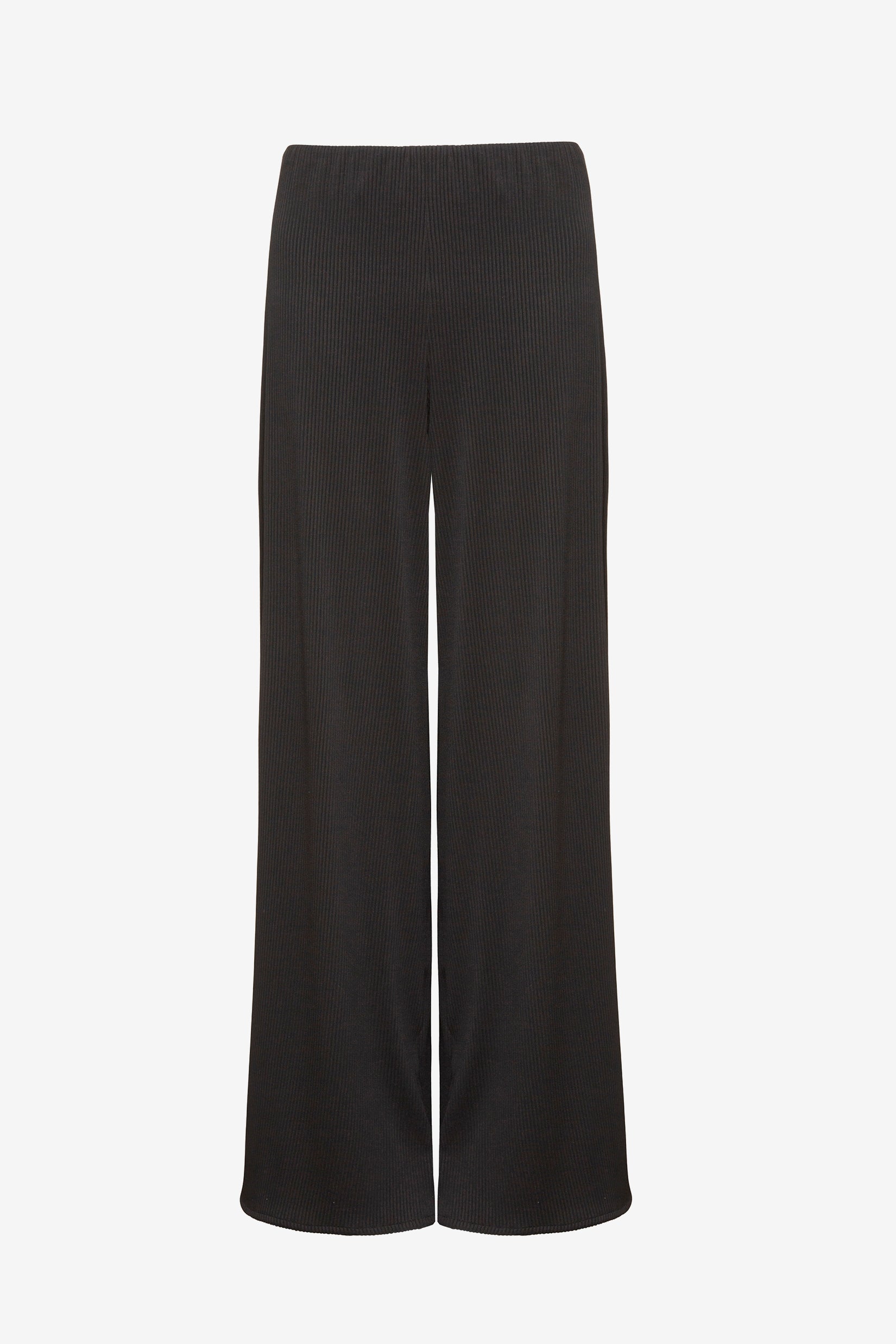 A palazzo style pants, features a velvet like textured fabric with an elastic waist.