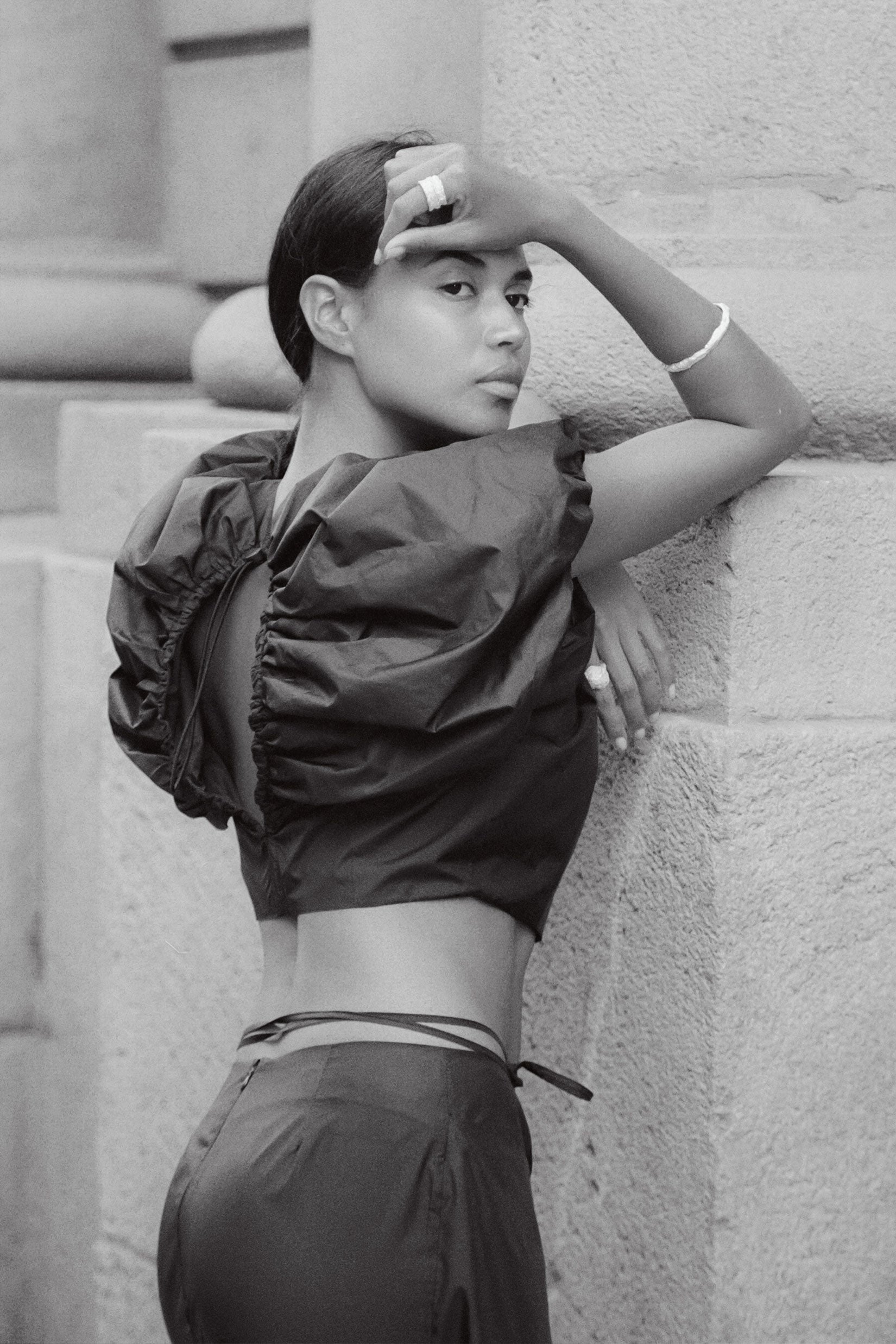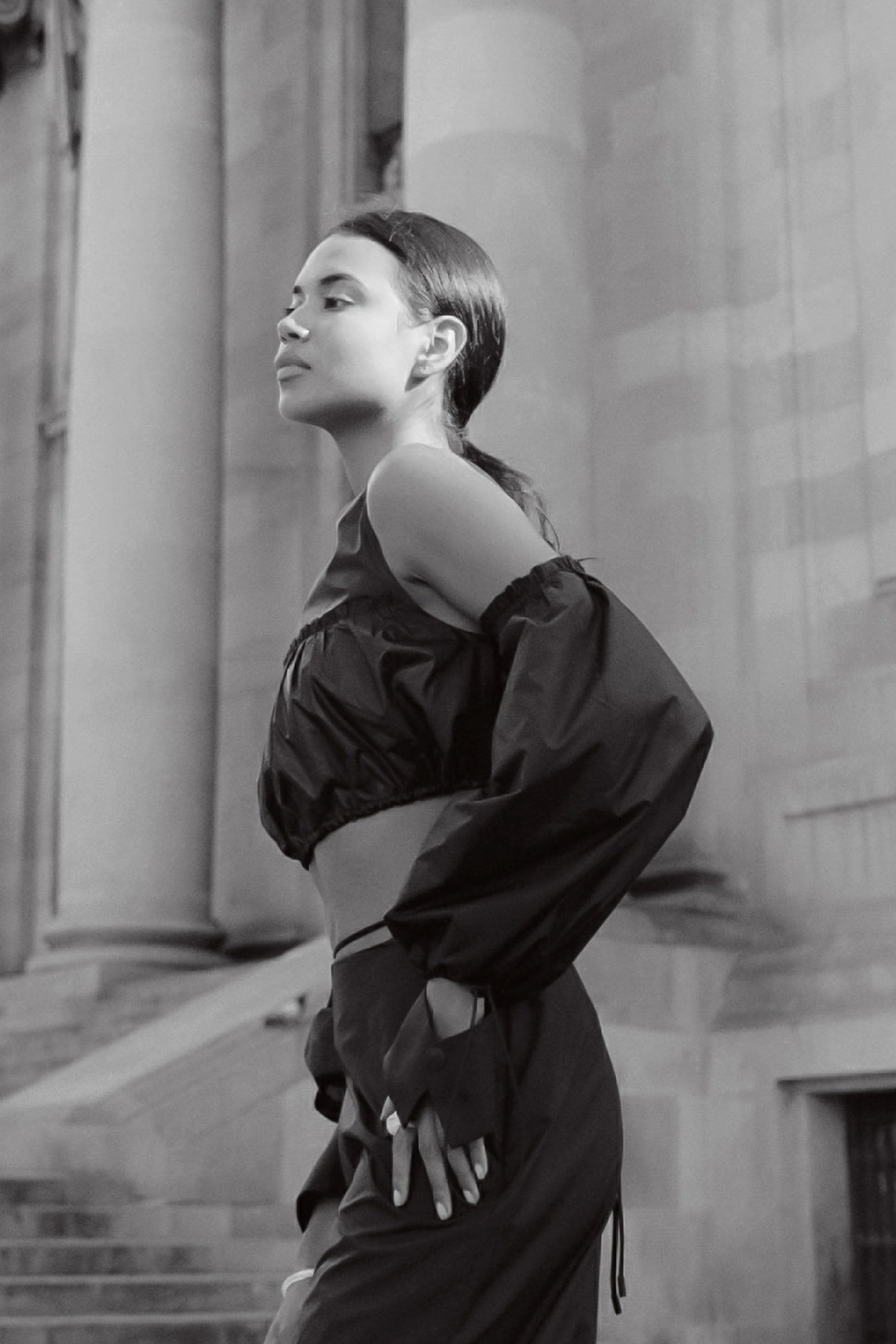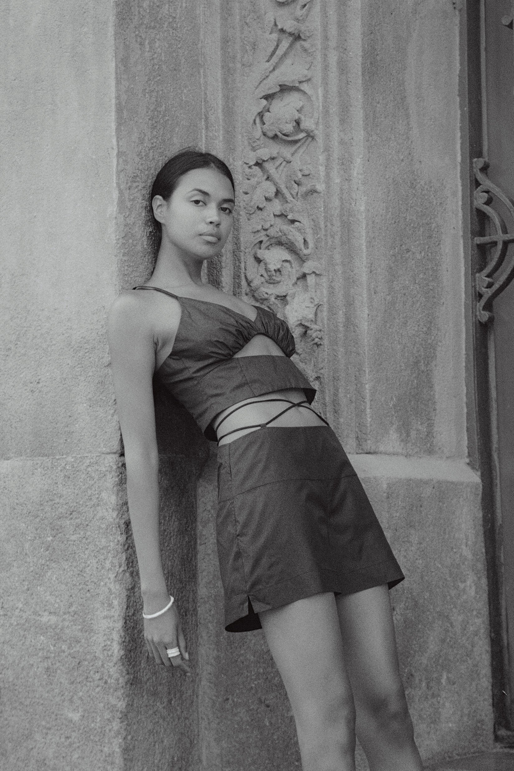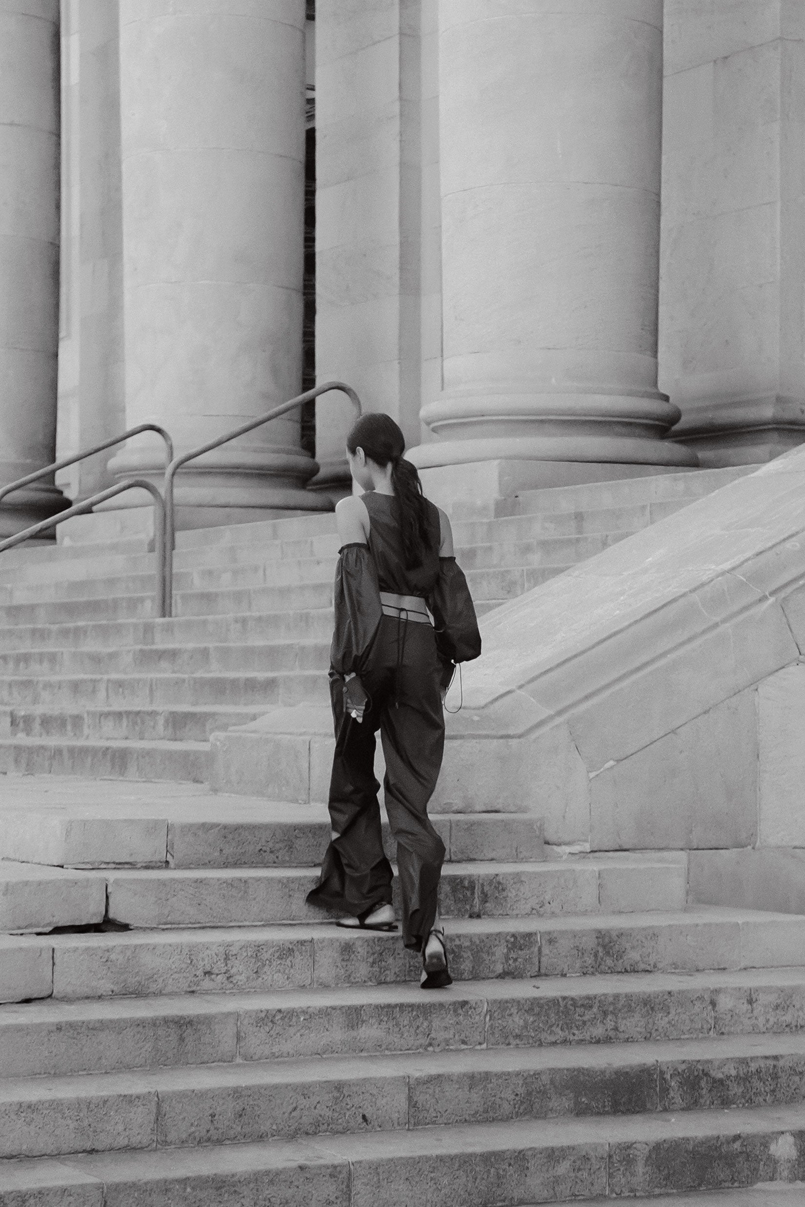 In All-Gen Athleisure E.3, the language of black nylon evolves, sculpted into daring silhouettes. The collection revisits signature codes with ruching, adjustable stoppers and sharp cut-outs that create pieces both timeless and unapologetically forward. Captured in monochrome against the city’s historic facades, the collection reflects the brand’s essence: strong, audacious and avant-garde, capturing the tension between strength and elegance while echoing the city’s modern energy.