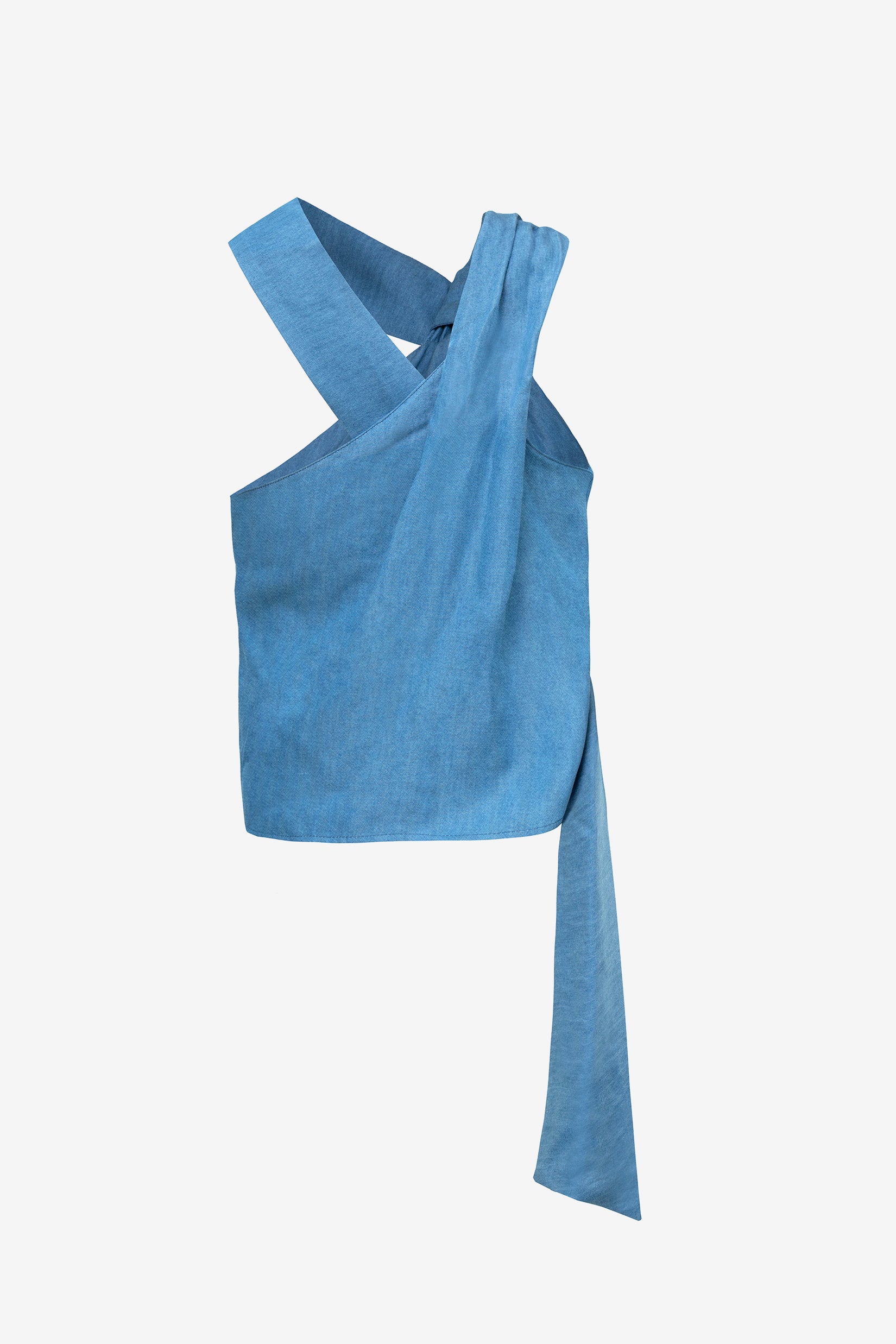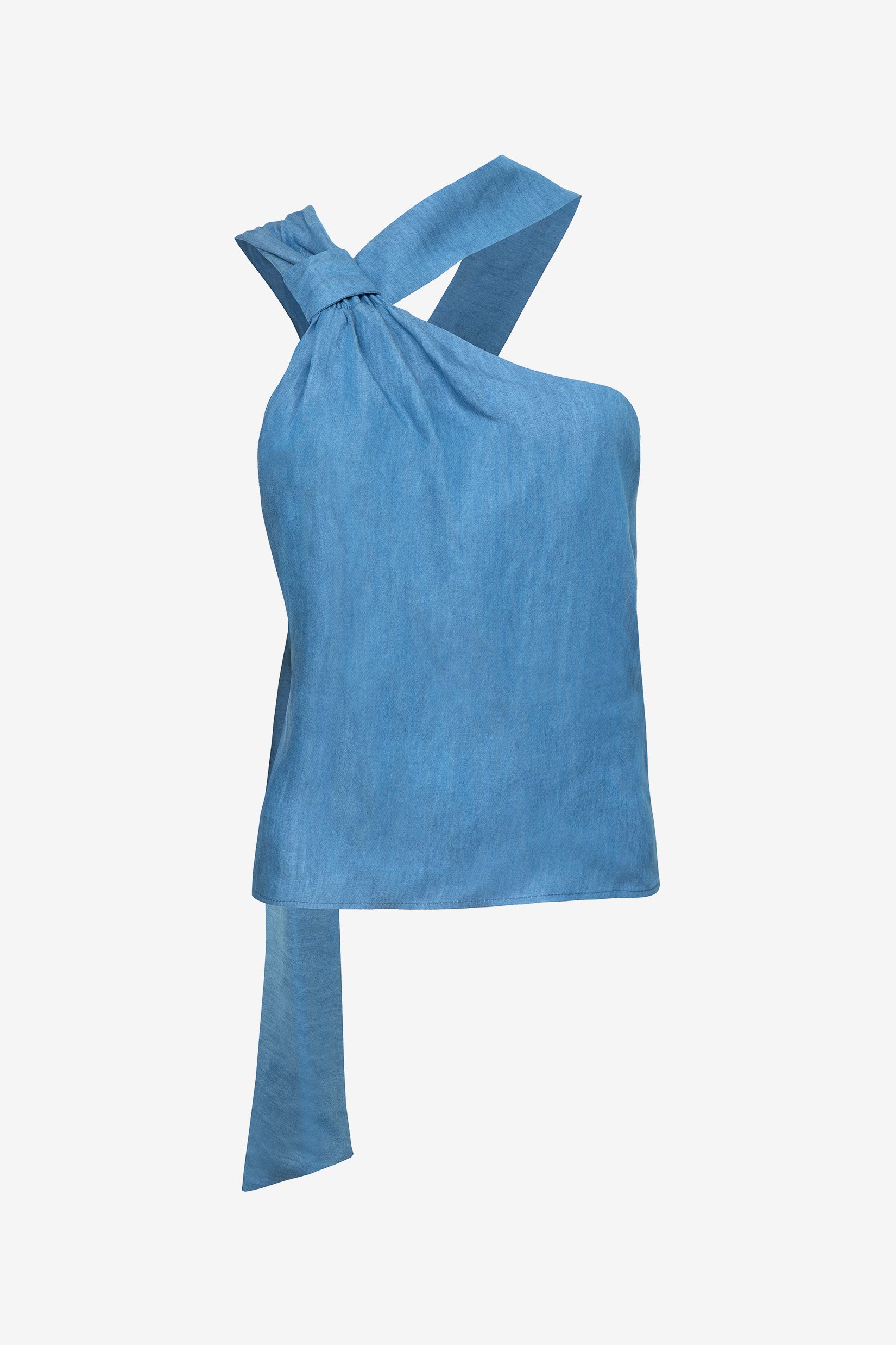 Our asymmetric Tencel top, featuring an open shoulder, adjustable strap, and knotted detailing. Cut for a fluid silhouette with a modern edge.