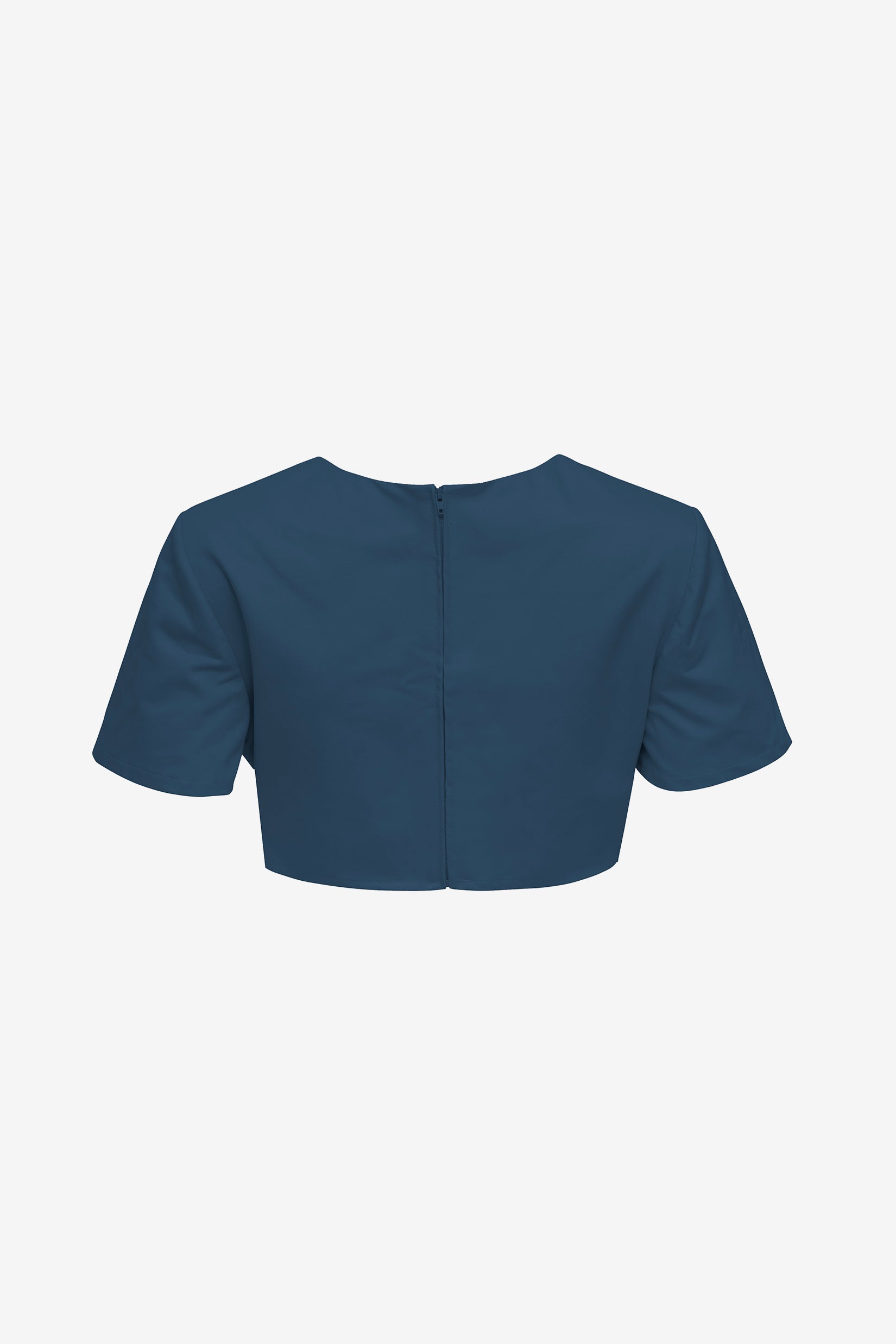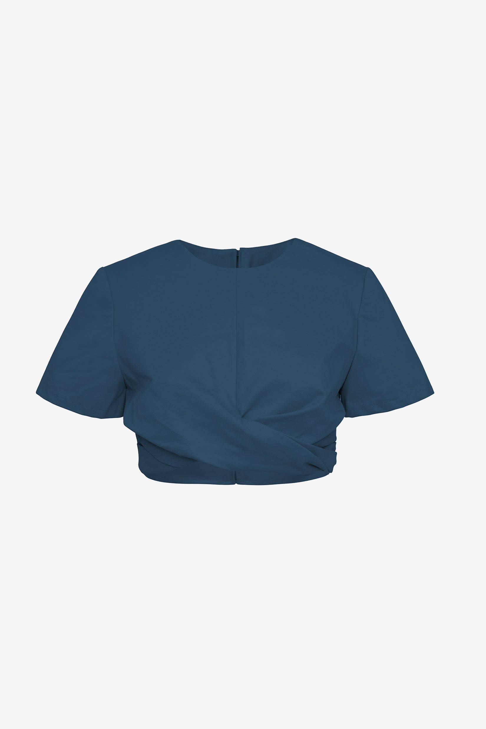 A cropped tailored blouse made from 100% cotton. This style features a cross-over detail at the waist and a zipper closure at the back. Each piece is handmade in our Barcelona atelier.