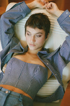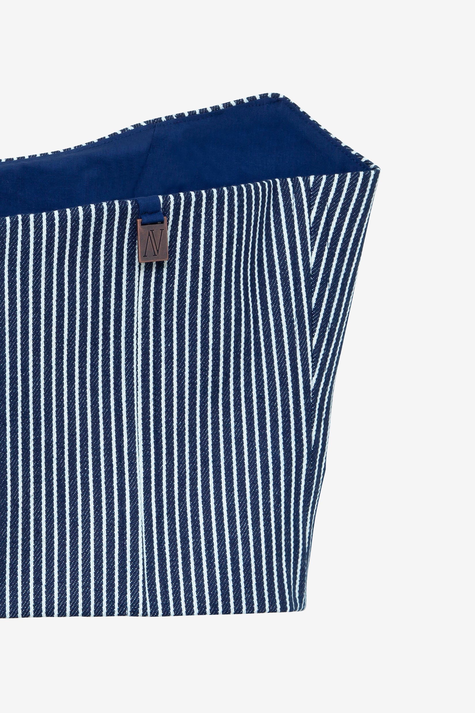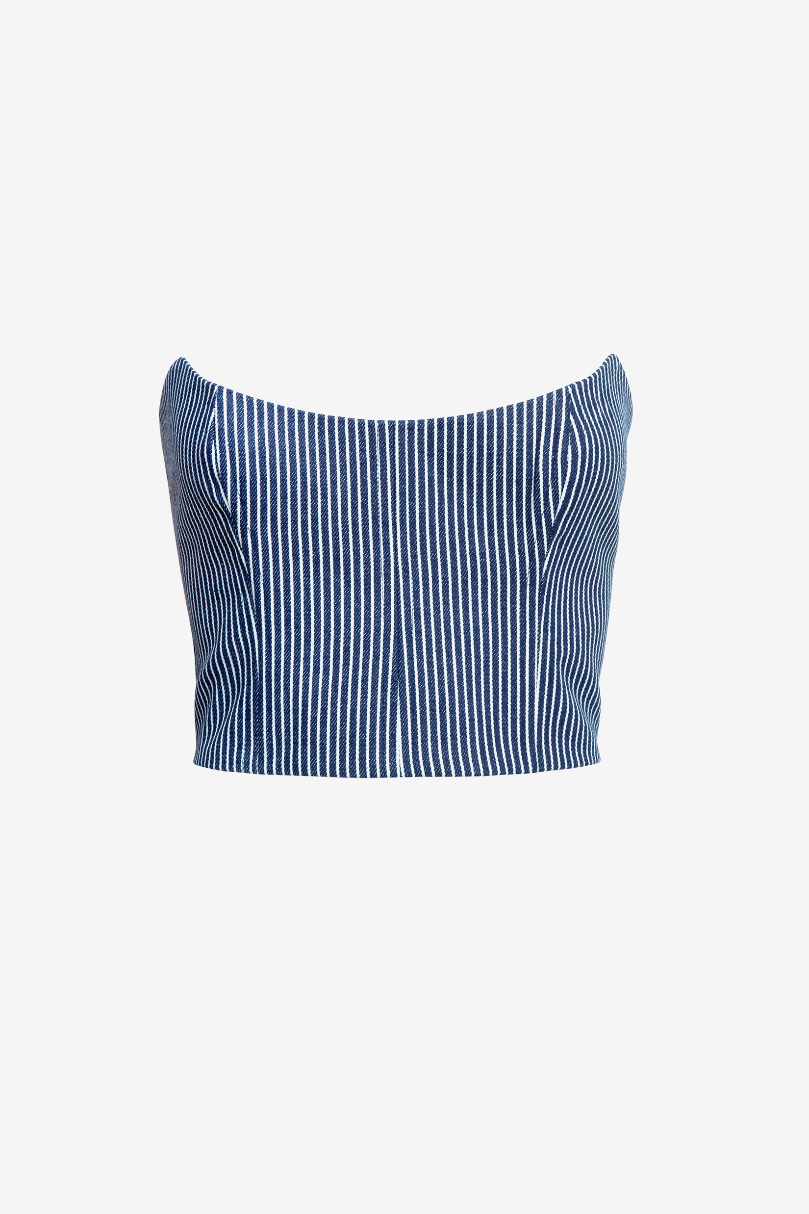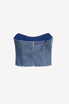 A blue & white striped denim corset, featuring a back zipper closer and fabric selected from our sustainable range library.