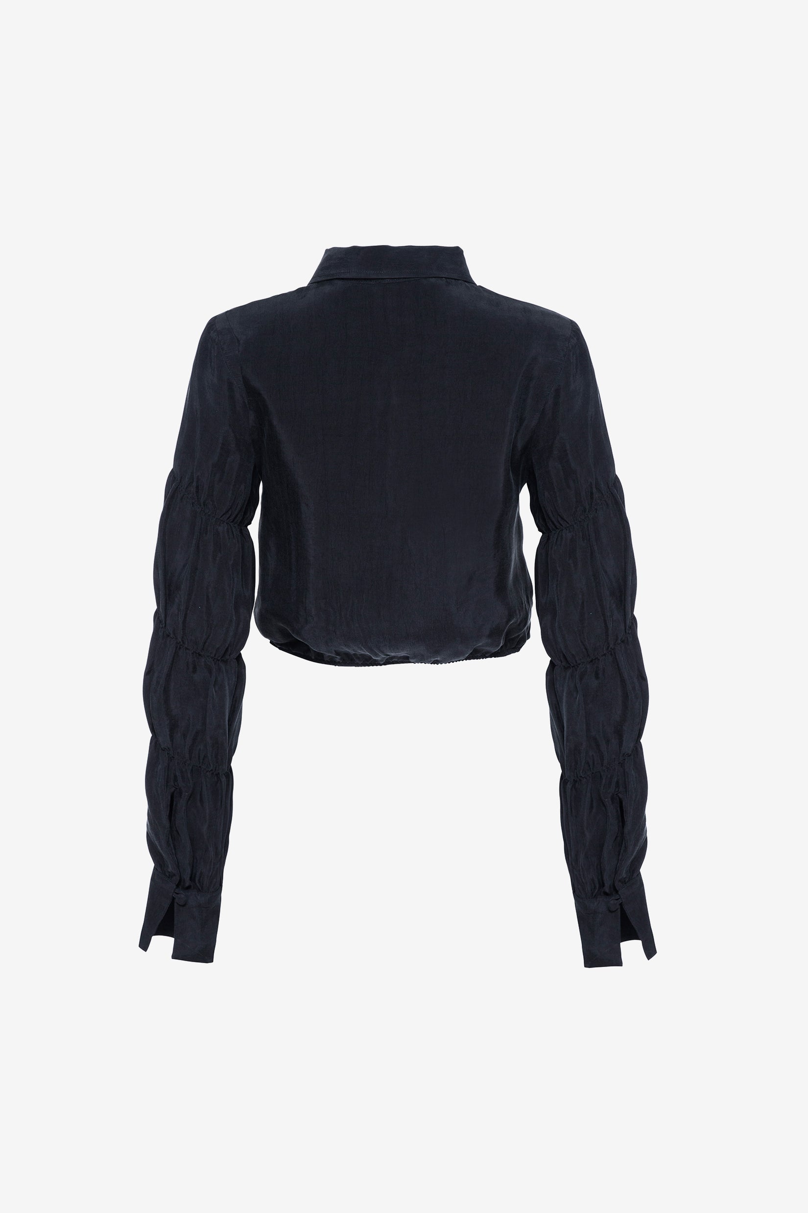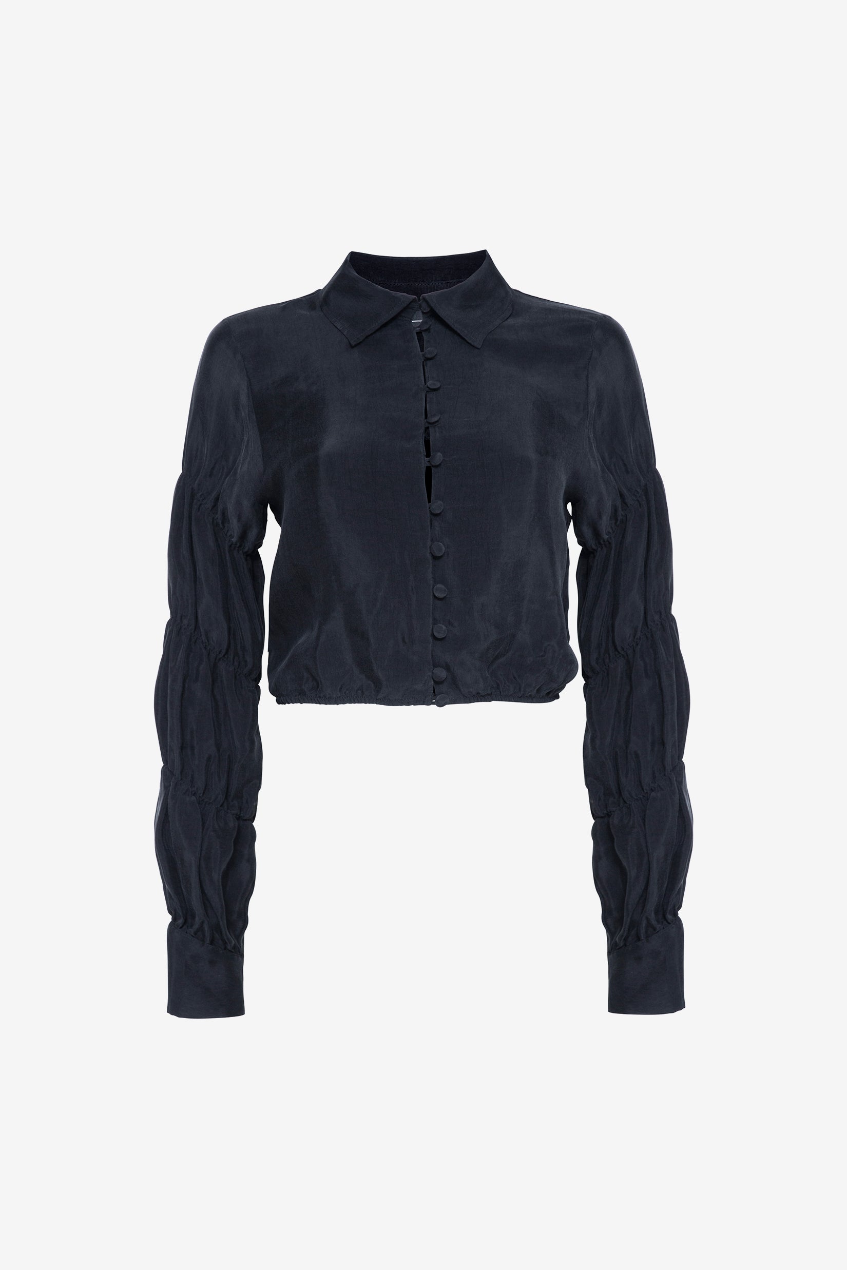 A cropped long-sleeve shirt made from 100% silky vegan cupro. This style has elasticated gathered details on the sleeves, fabric-covered button closure, and an elasticated waistband.