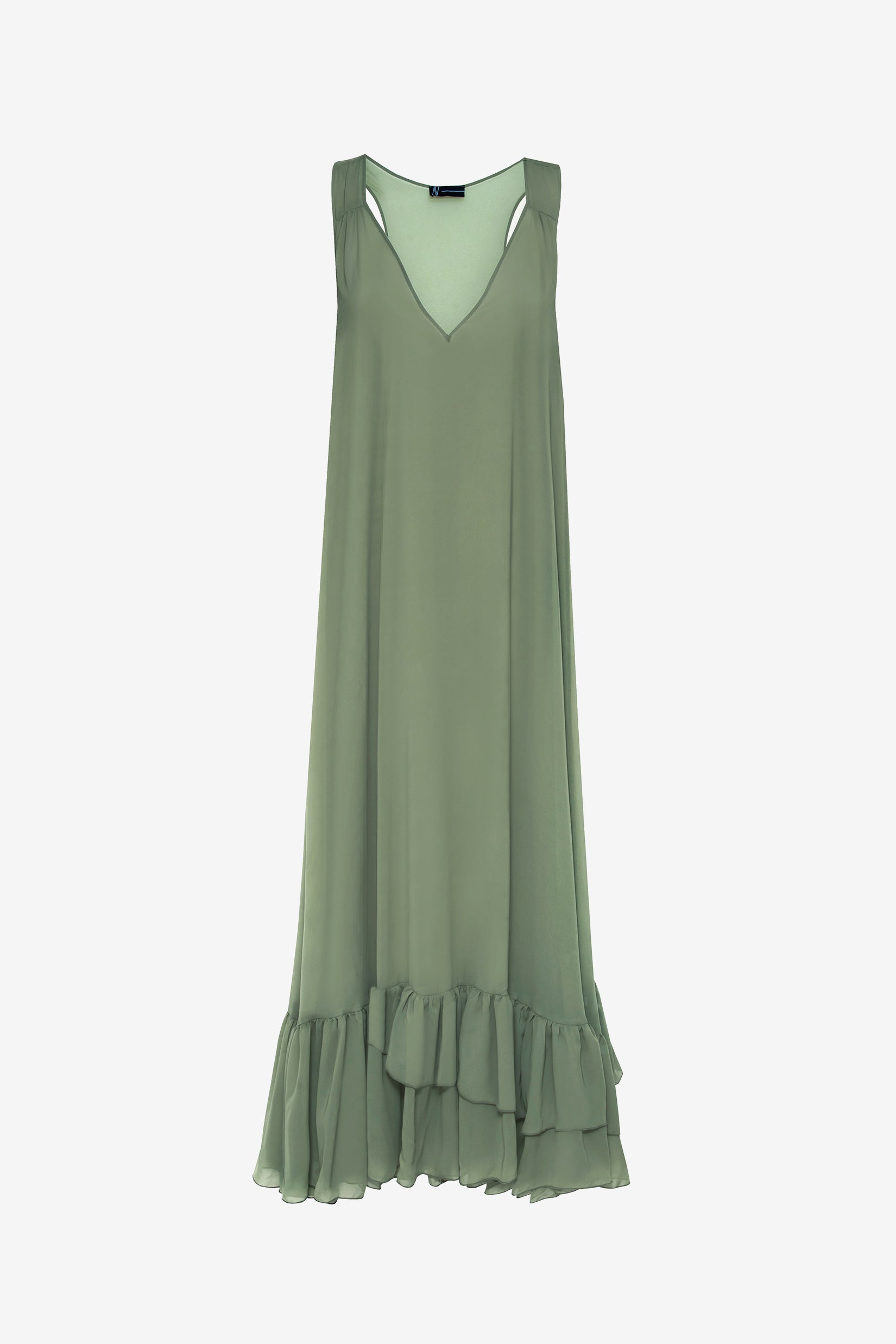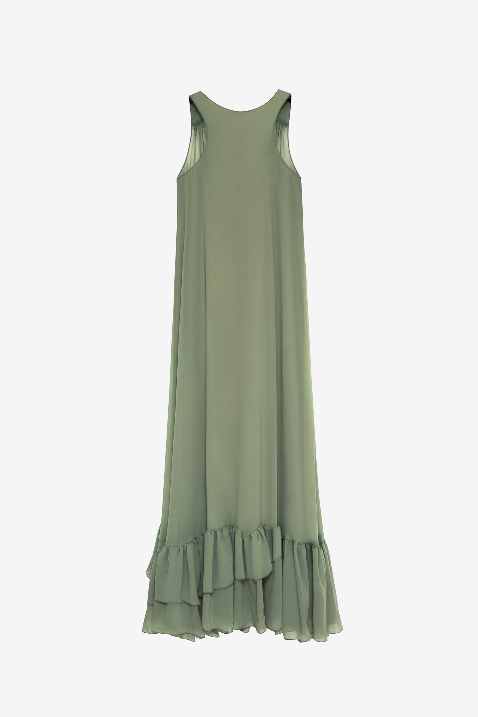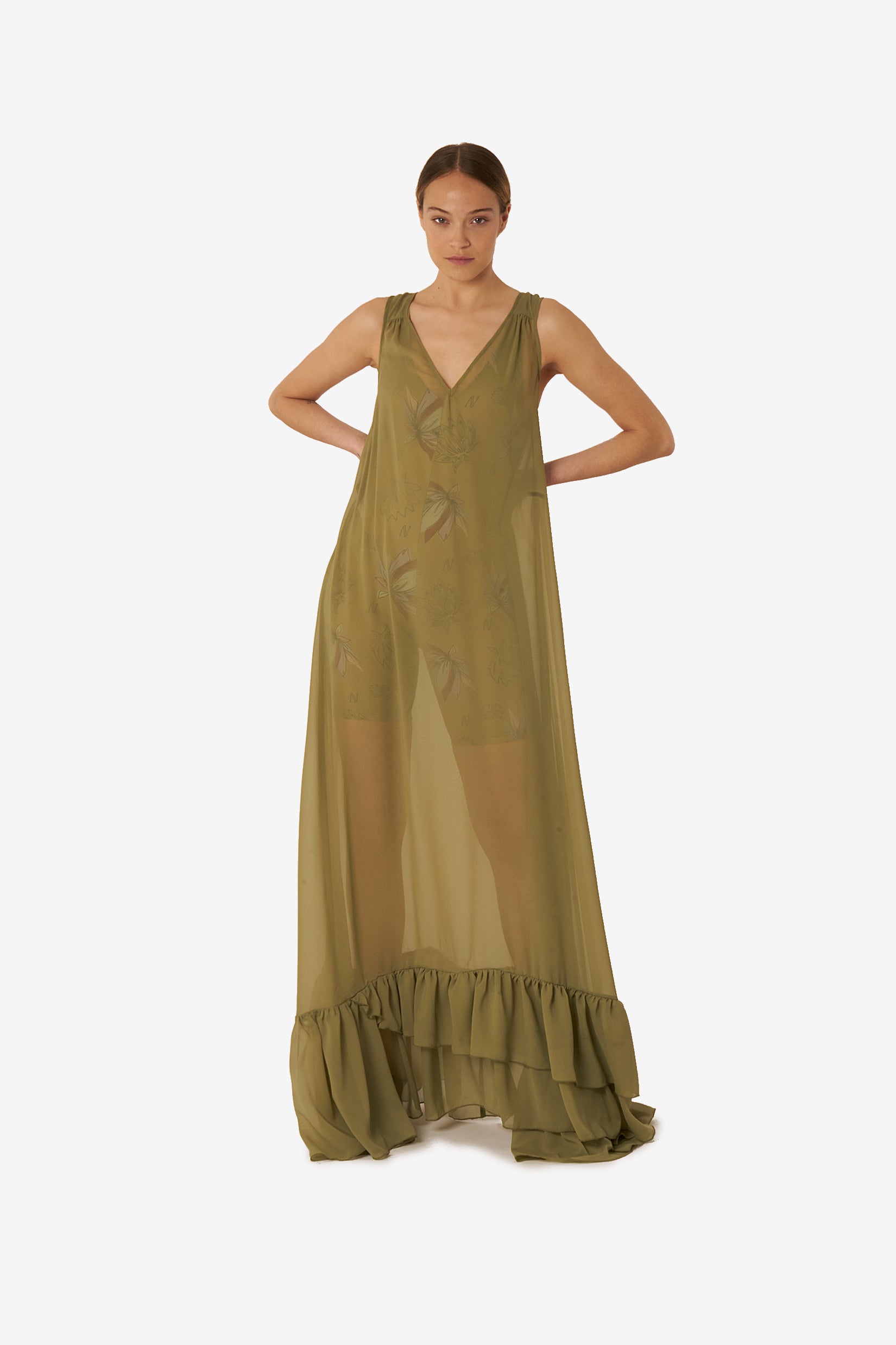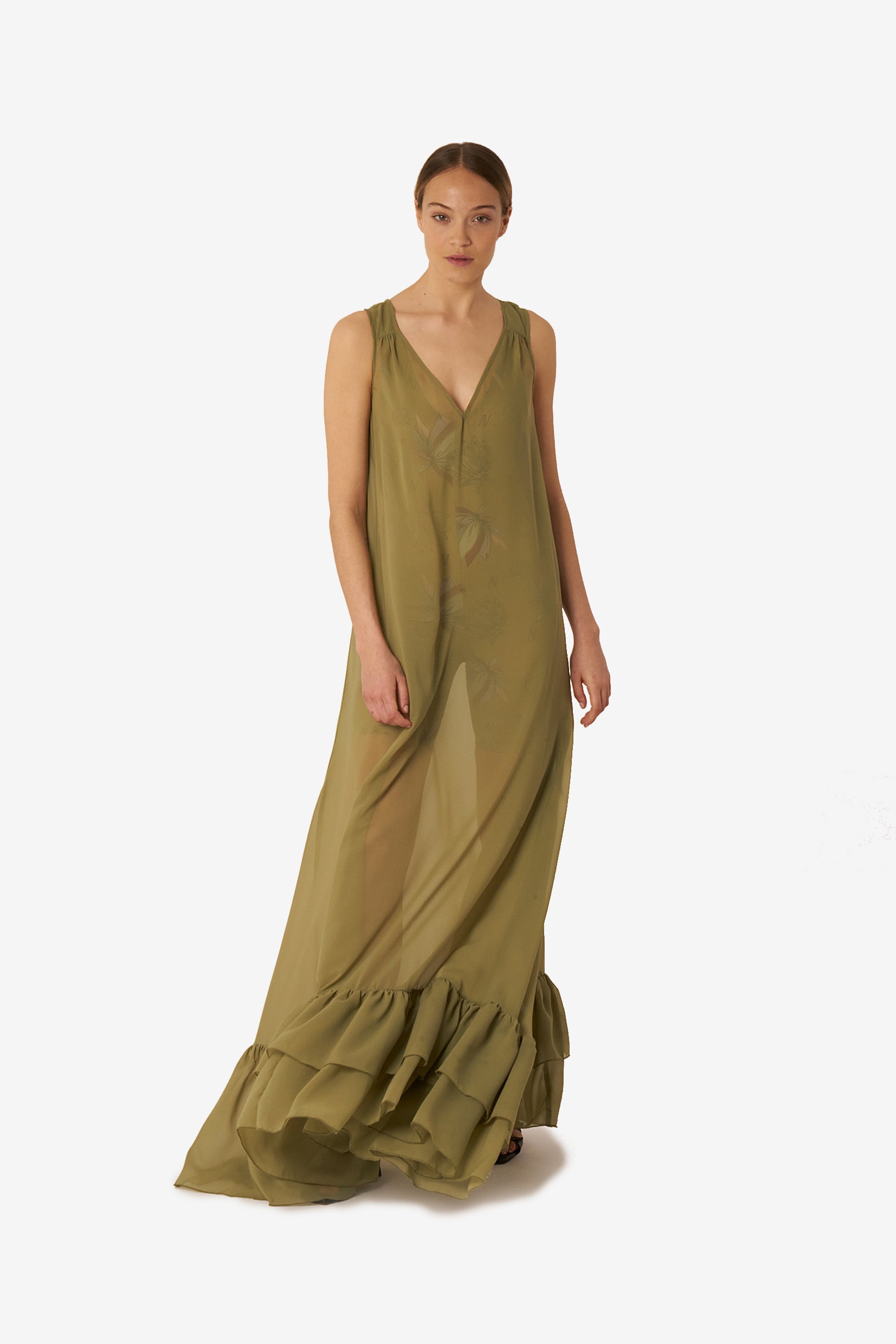 A semi-sheer maxi dress made from soft chiffon. This style has a loose fit and features a V-neck neckline and a draped ruffle hem. Each piece is handmade in our atelier.