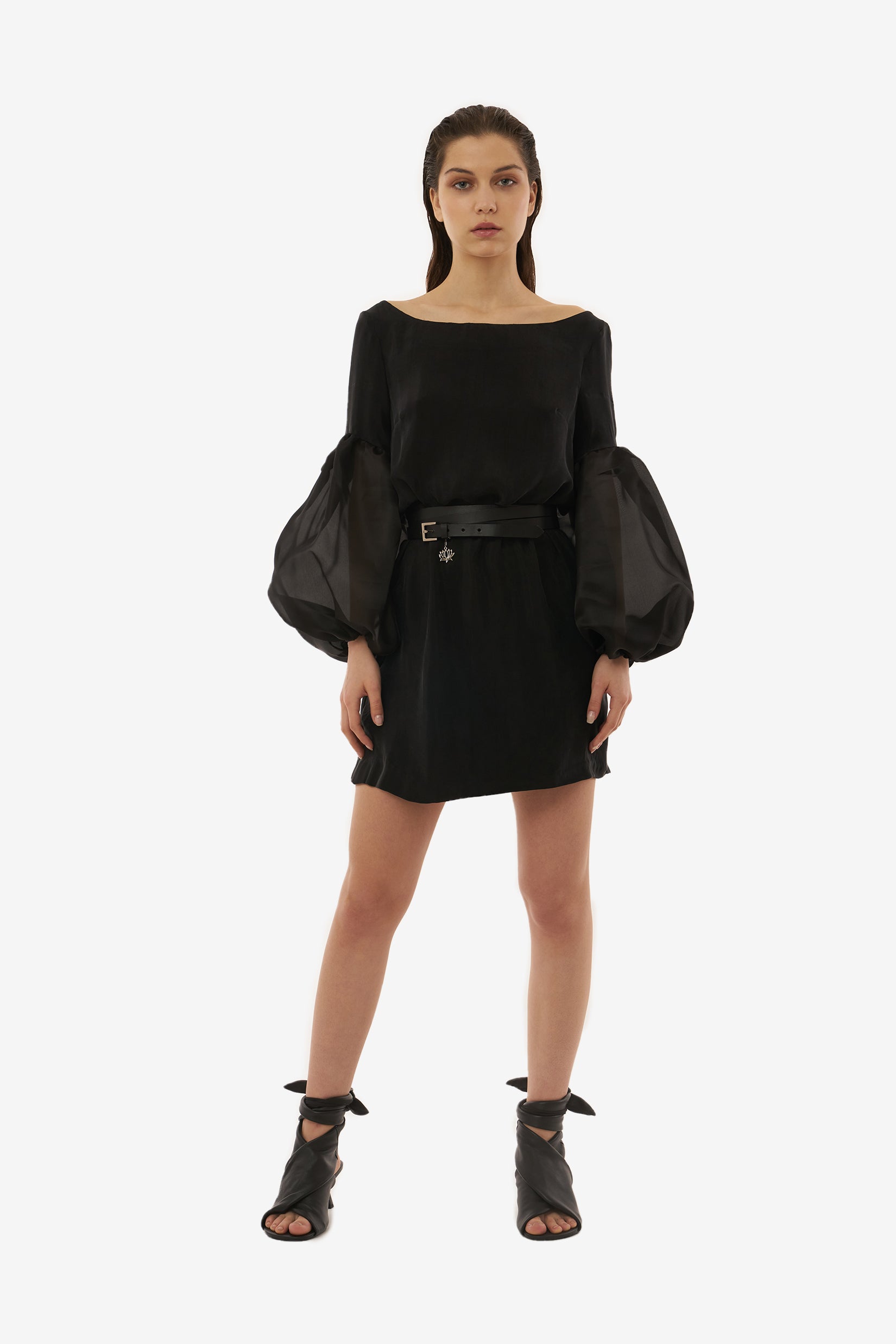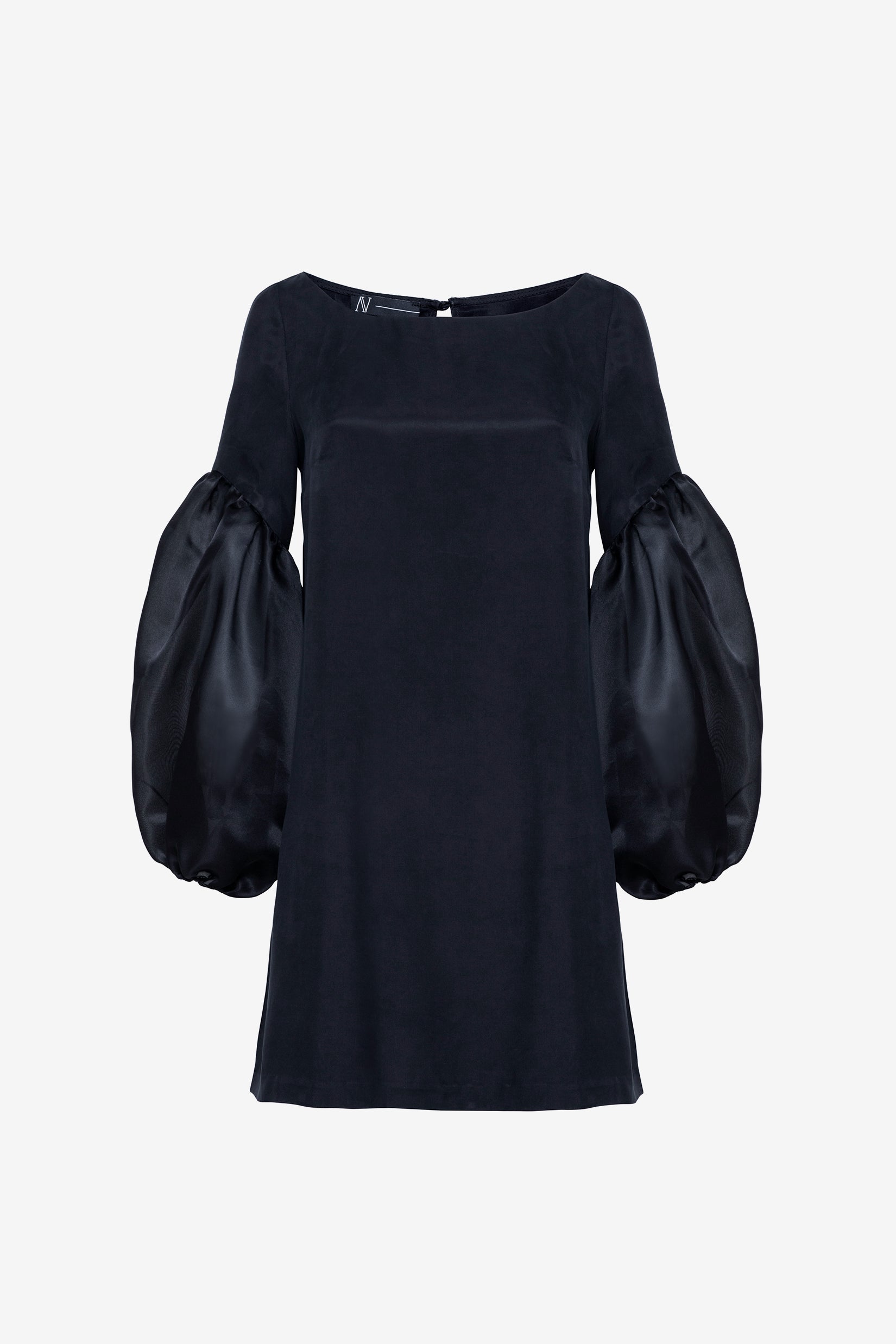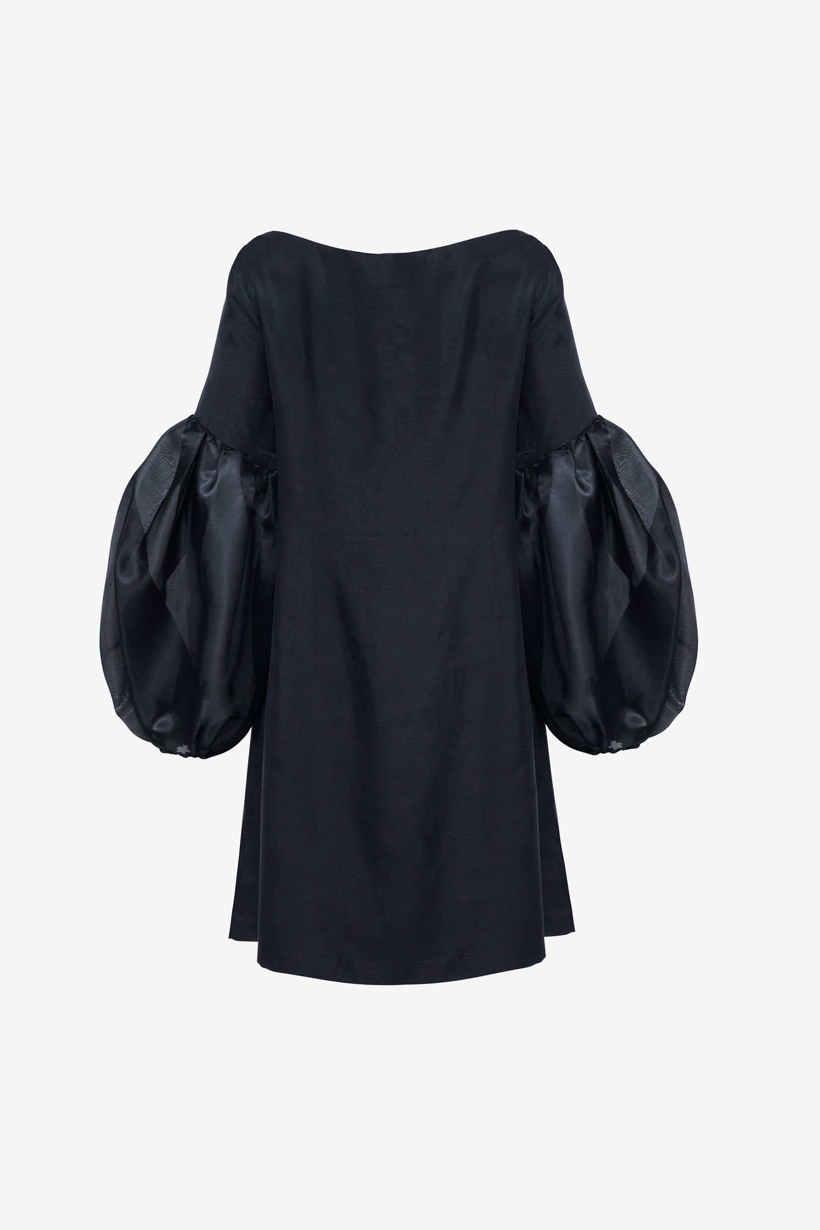 A mini-shift dress made from 100% silky vegan cupro. This style has a soft scoop neckline, an A-line silhouette, and organza balloon sleeves.