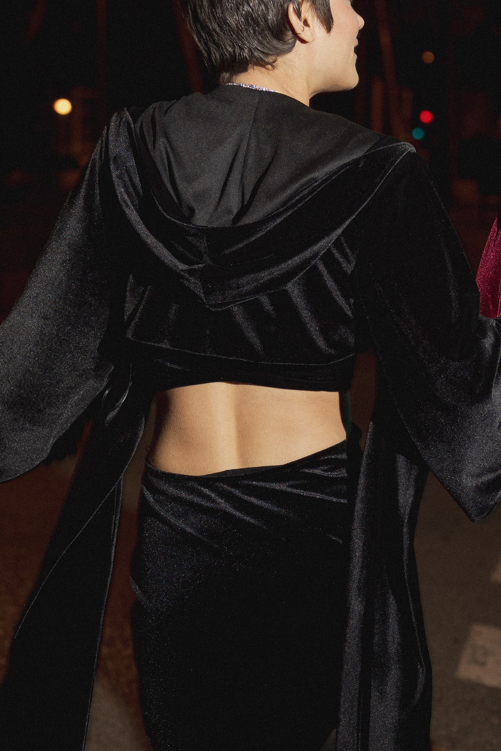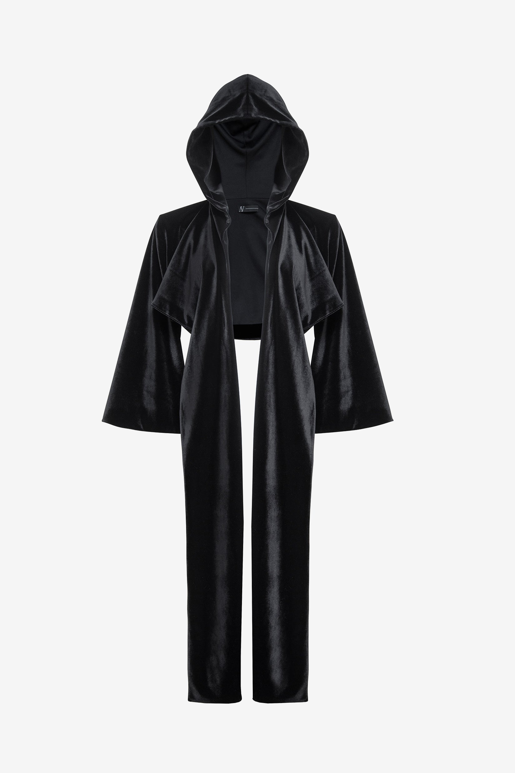 The MISS AV Amaya Bolero includes a hood and scarf, both featuring unique design details.