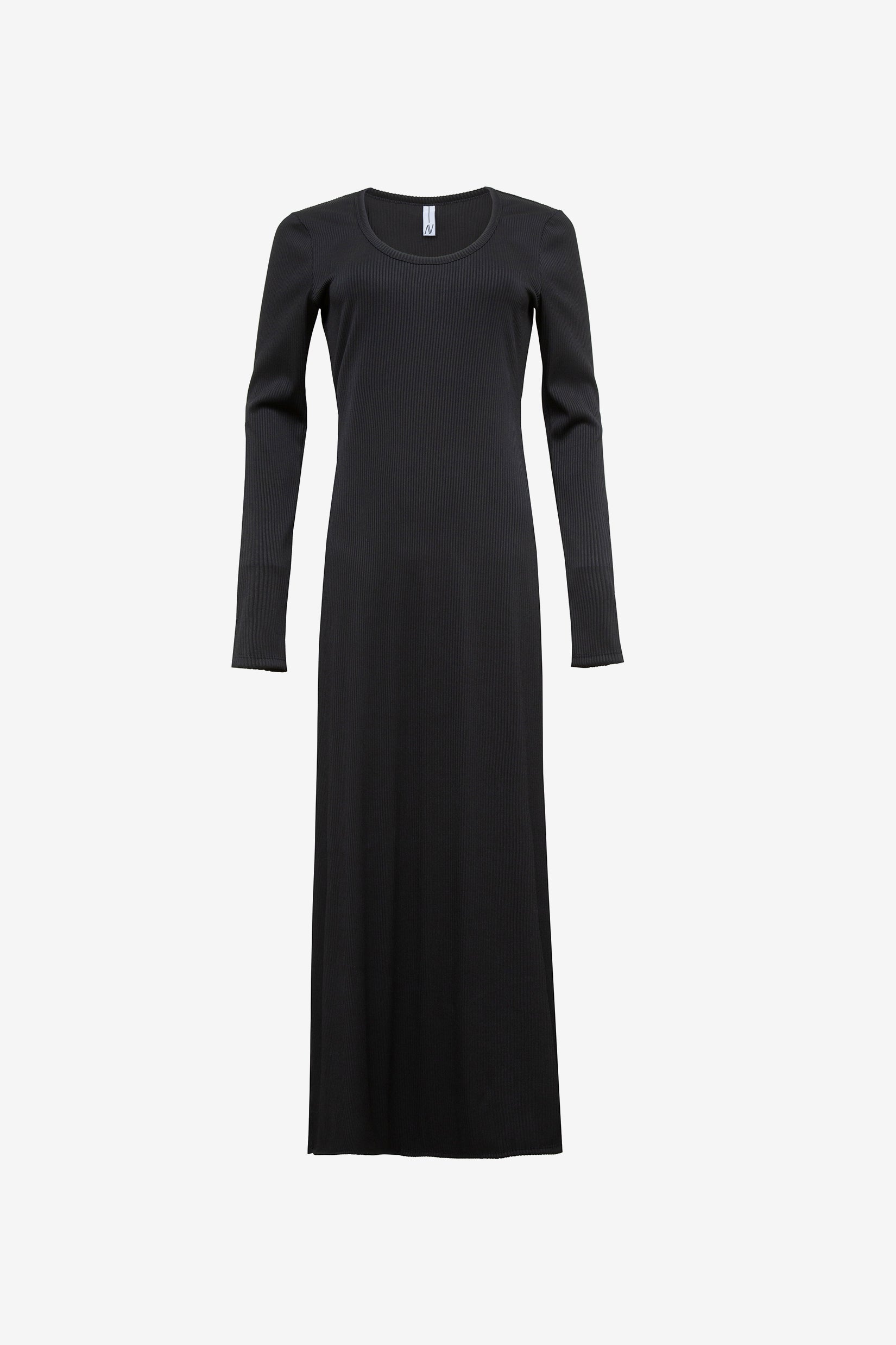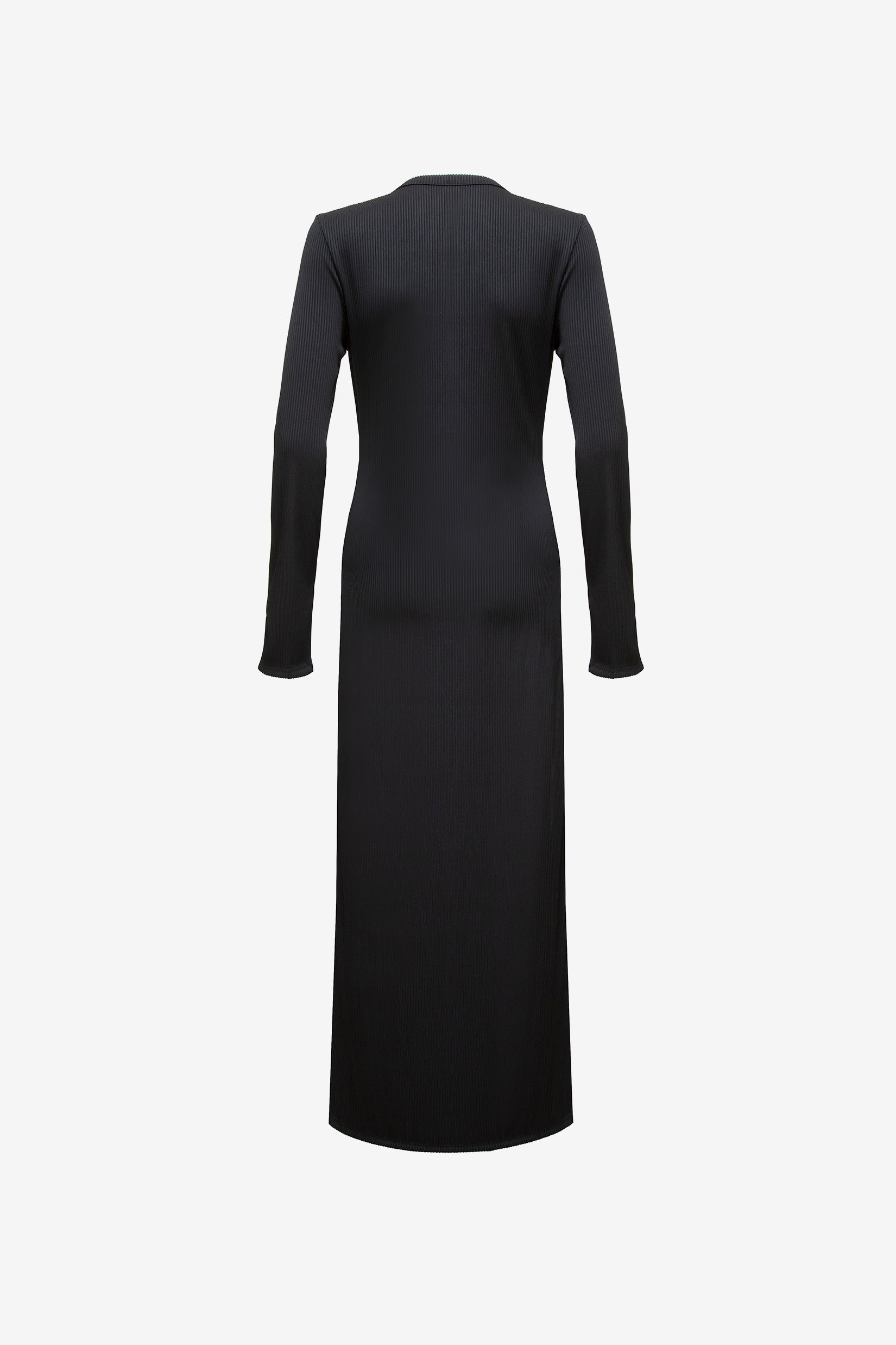 A velvet like textured fabric dress, features a low neckline with long sleeves.