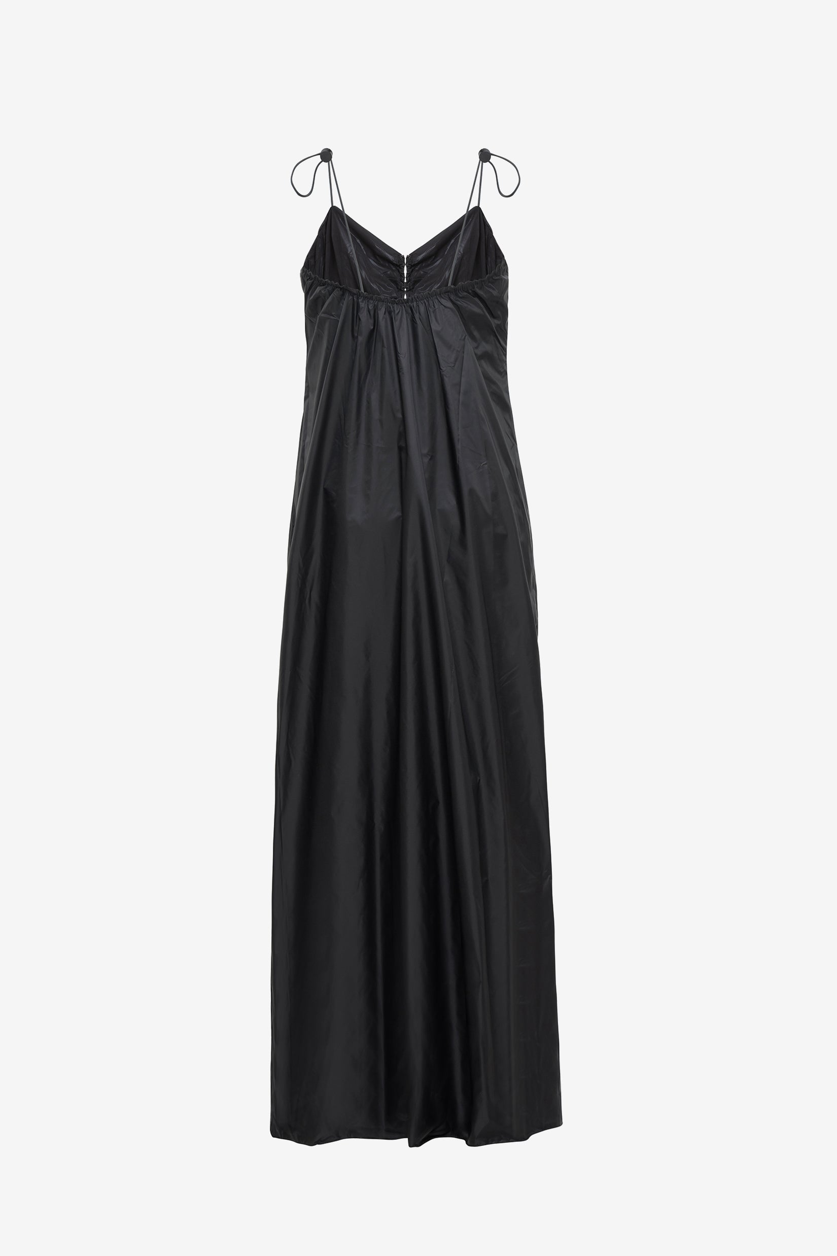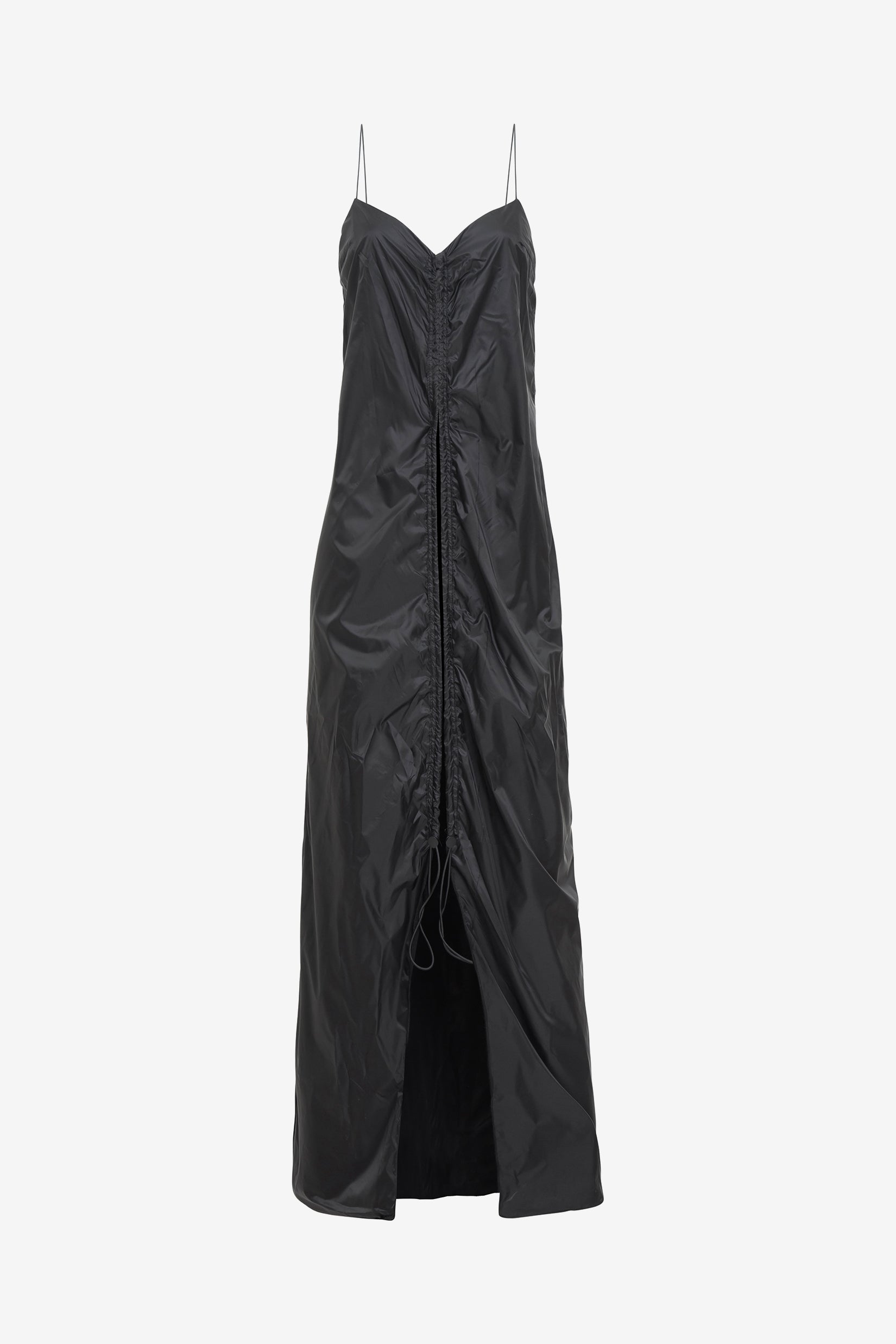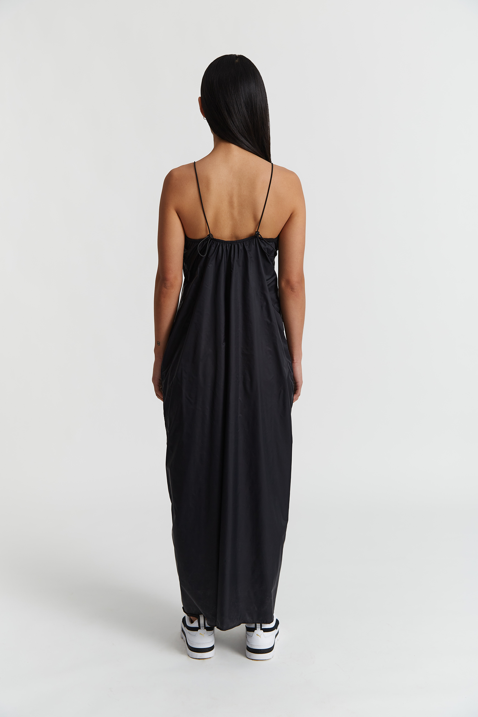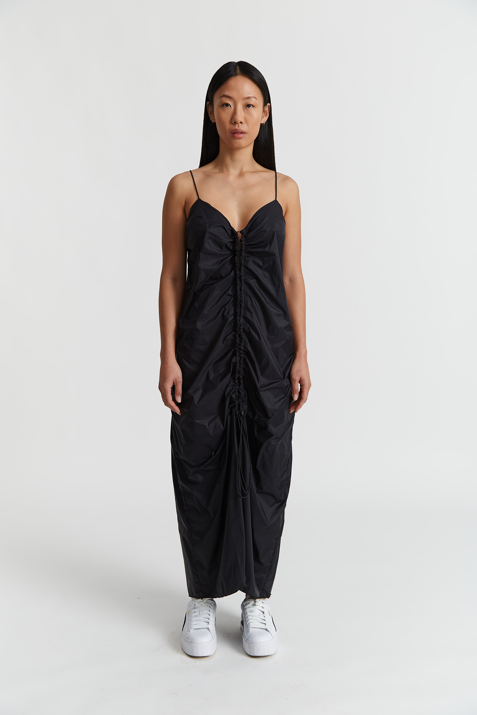 A statement athleisure dress made from 100% soft nylon produced in Italy. This style features a ruched gathered detail at the front with an eyelet closure and an adjustable elastic cord-toggle finish. The back features an elastic gathered neckline and strappy adjustable cord straps. This style is fully-lined. Each piece is handmade in our Barcelona atelier.