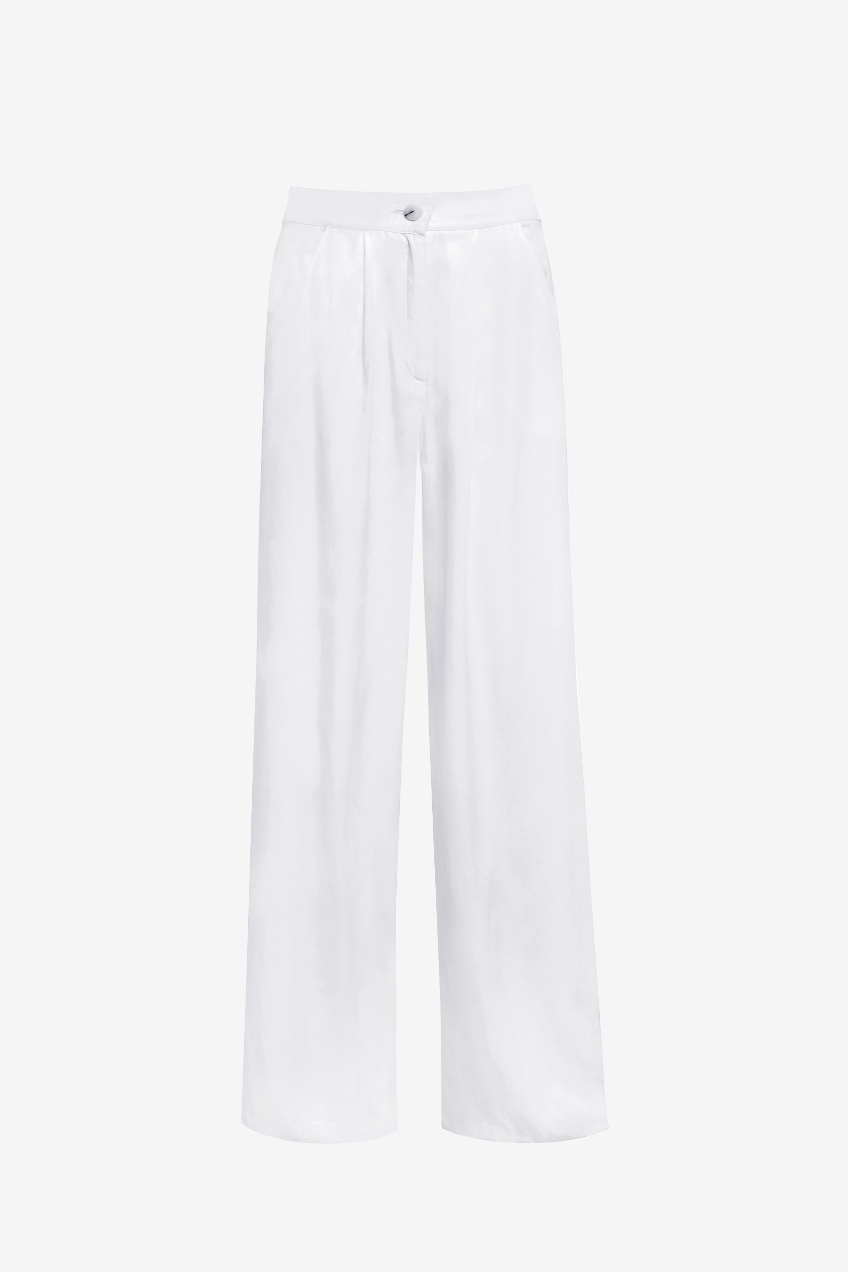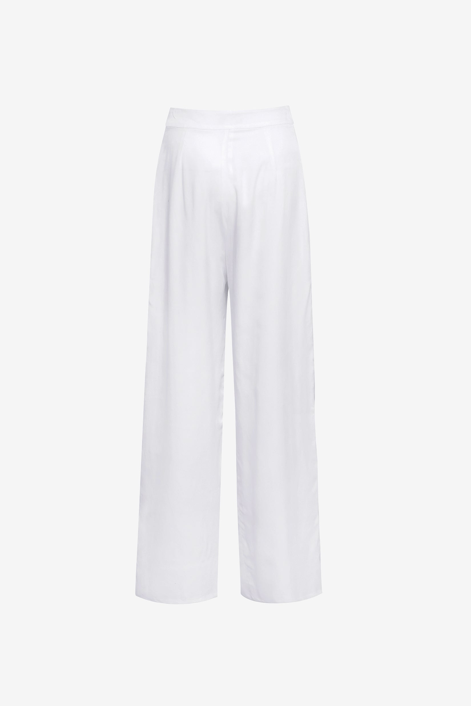 Tailored trousers made from soft satin and printed with our signature AV print. This style has a straight leg, a pleated detail at the waist, and a zipper and button closure. Each piece is handmade in our Barcelona atelier.