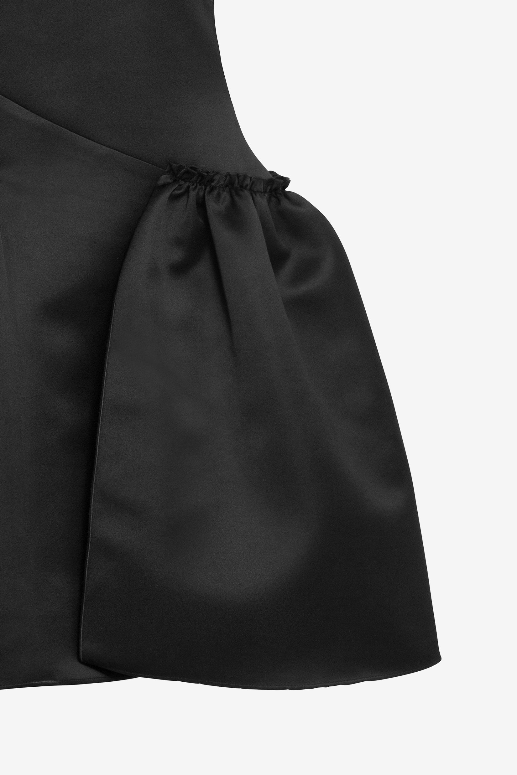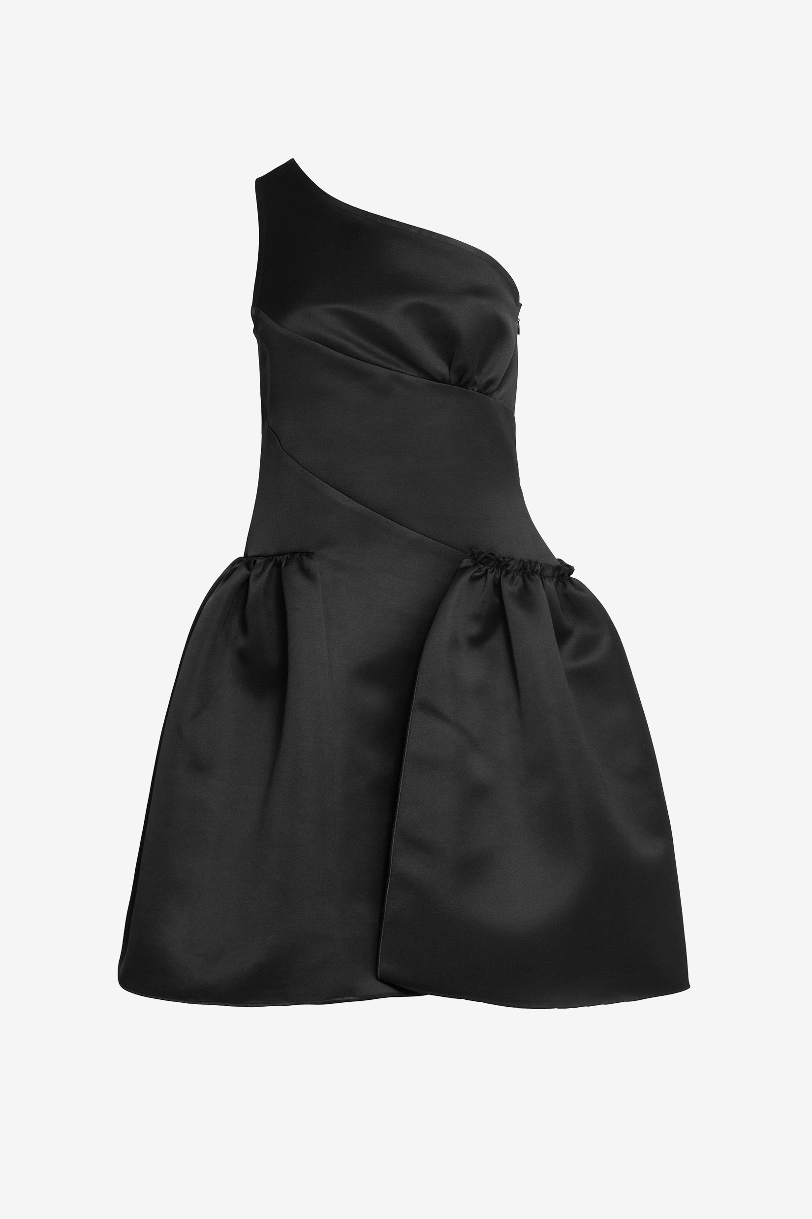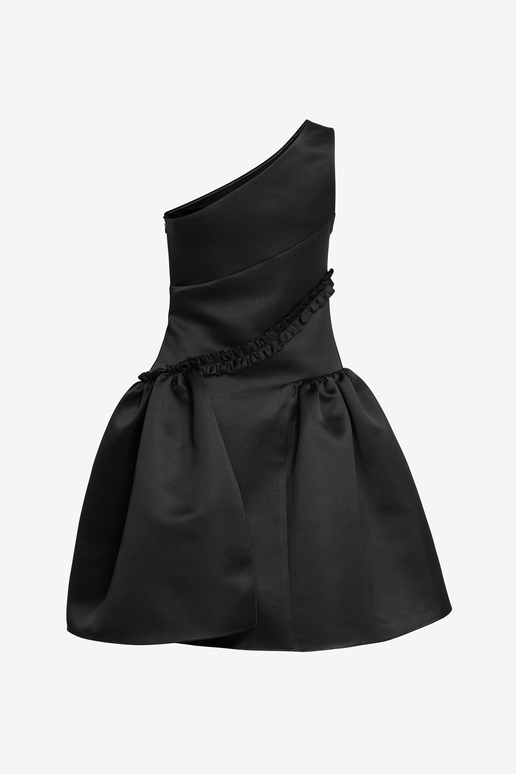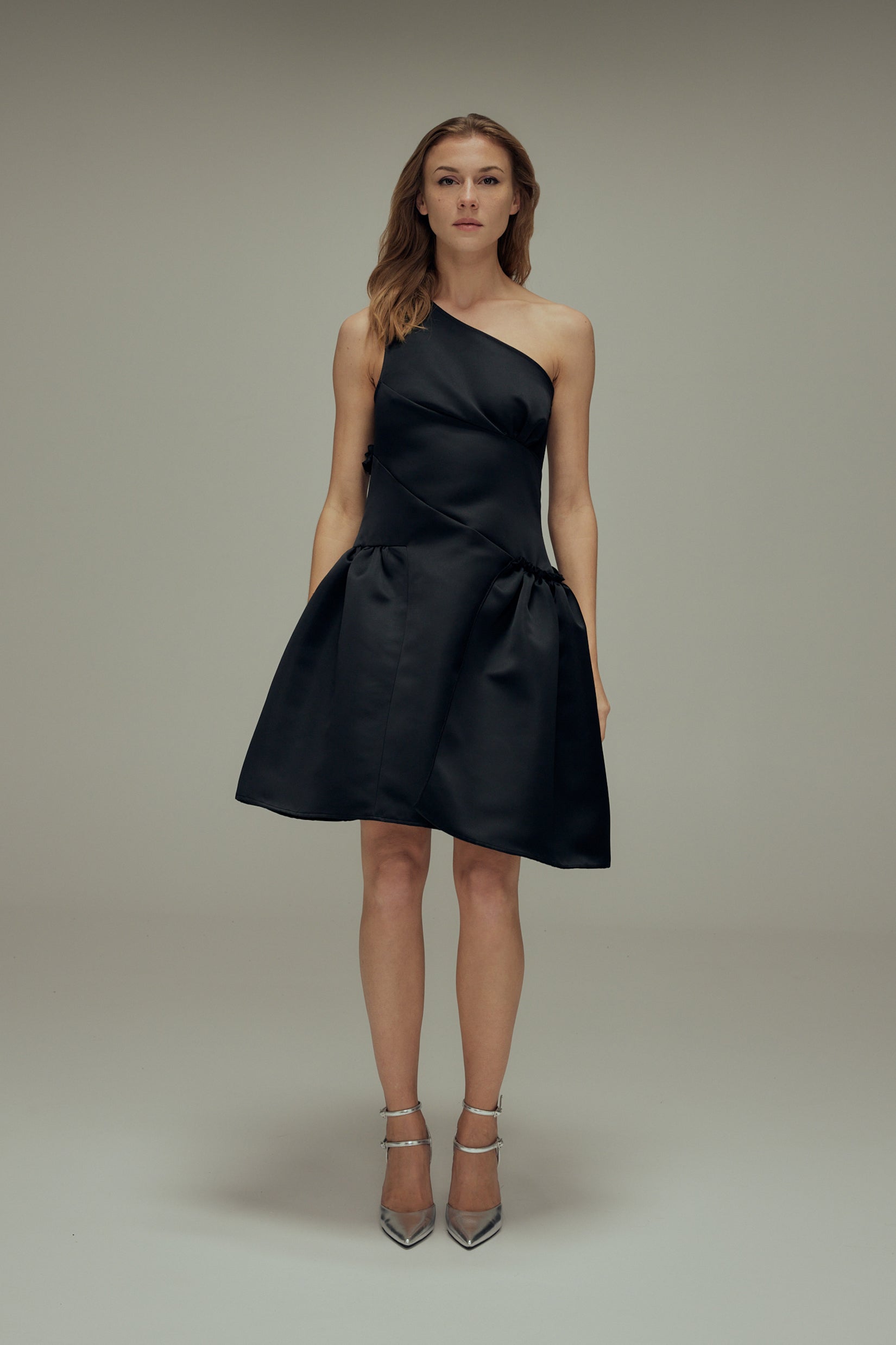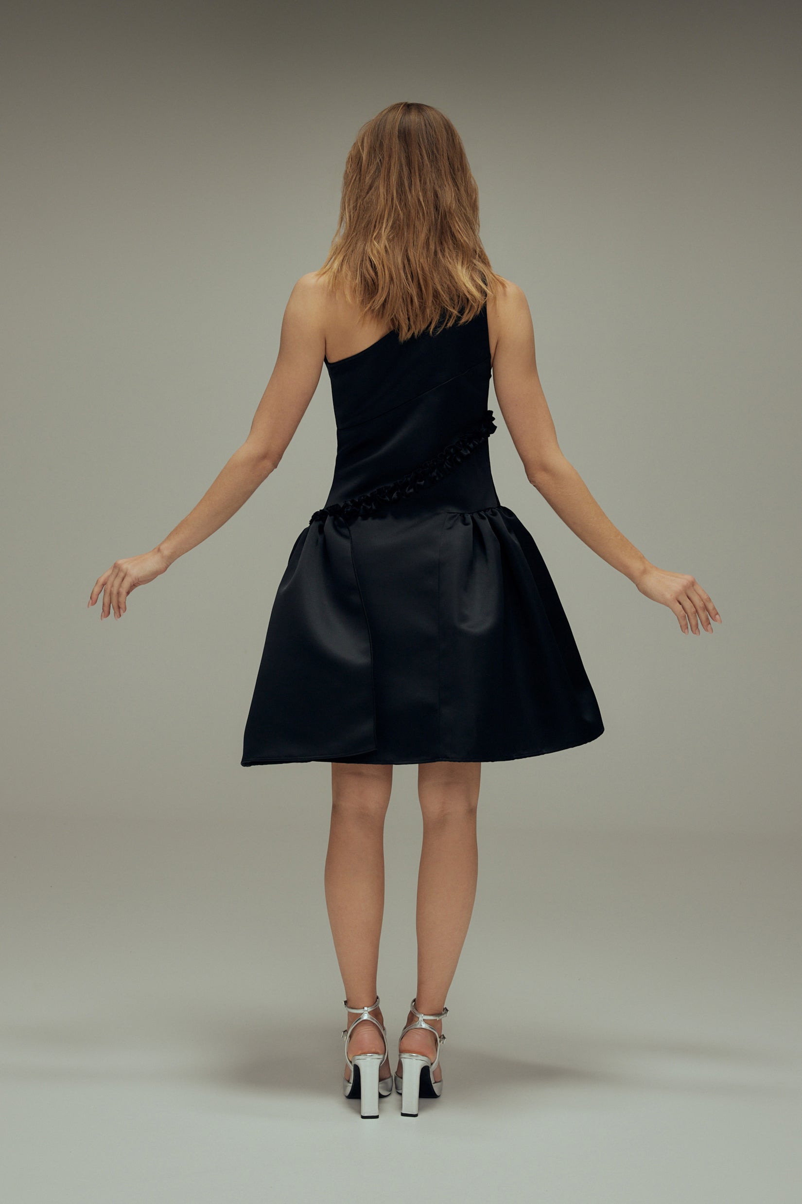 An elegant mini dress made from soft double satin. This style features a one-shoulder strap neckline with diagonal seams and gathered ruffle details on the skirt. Every piece is handmade in our Barcelona atelier.