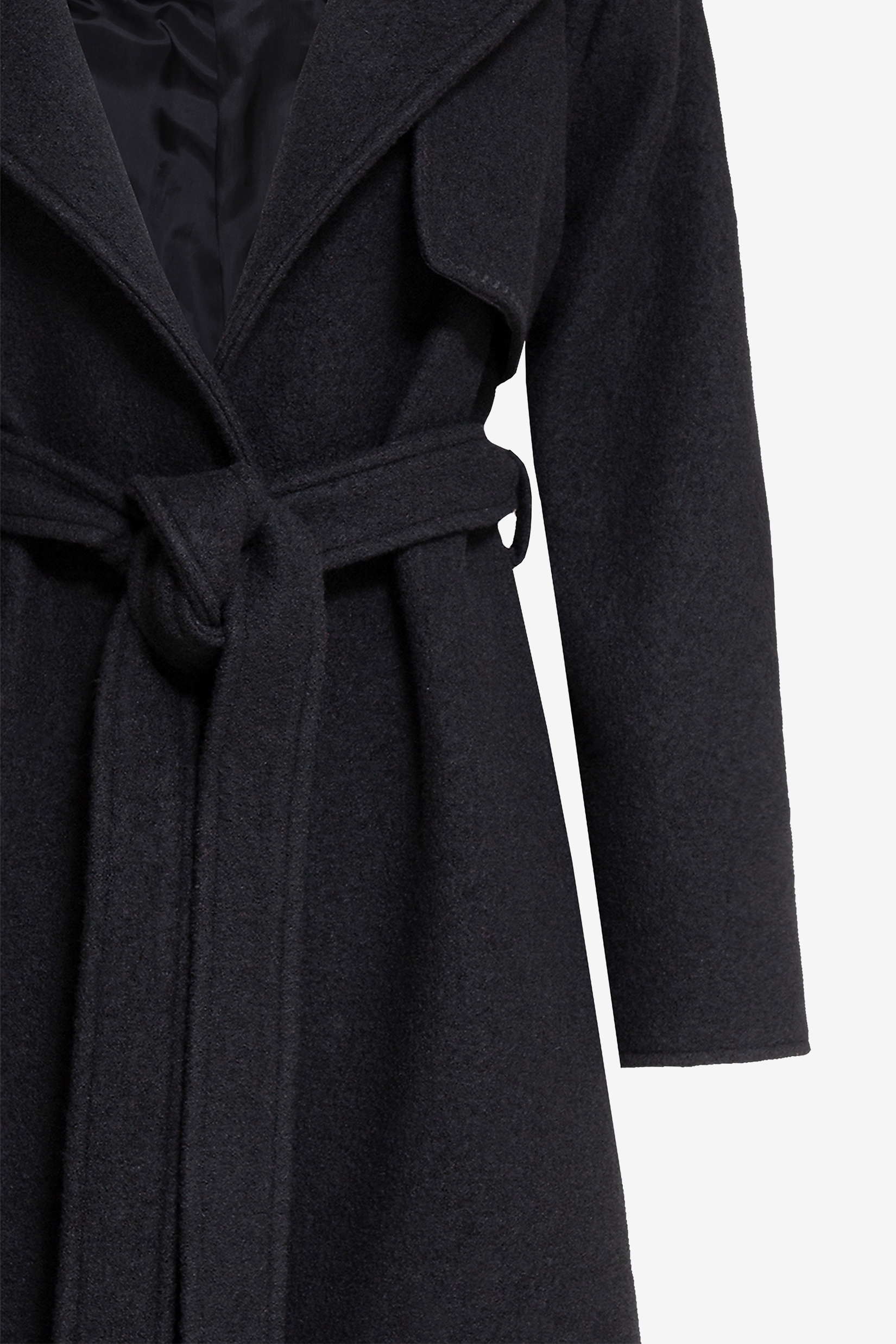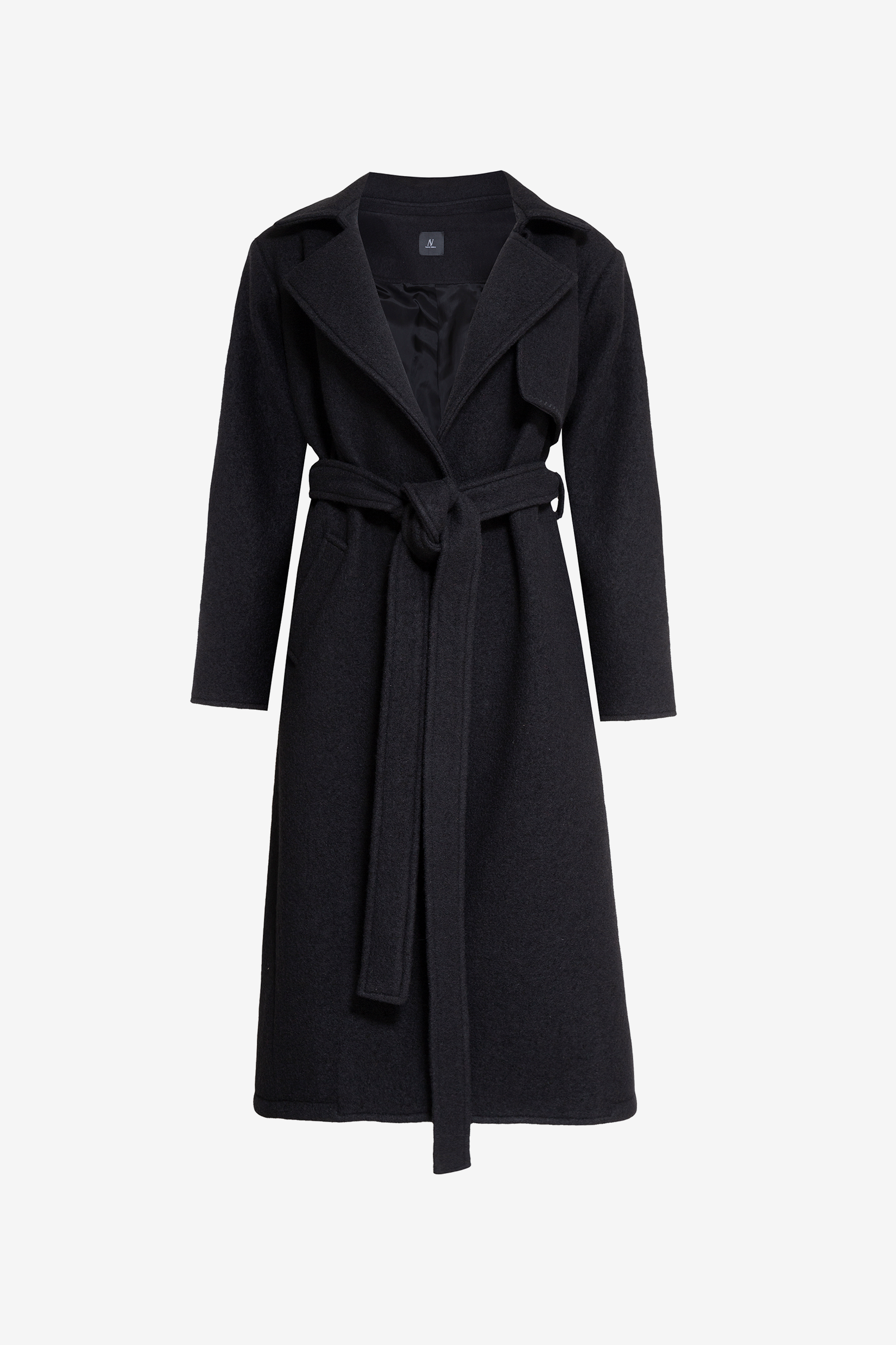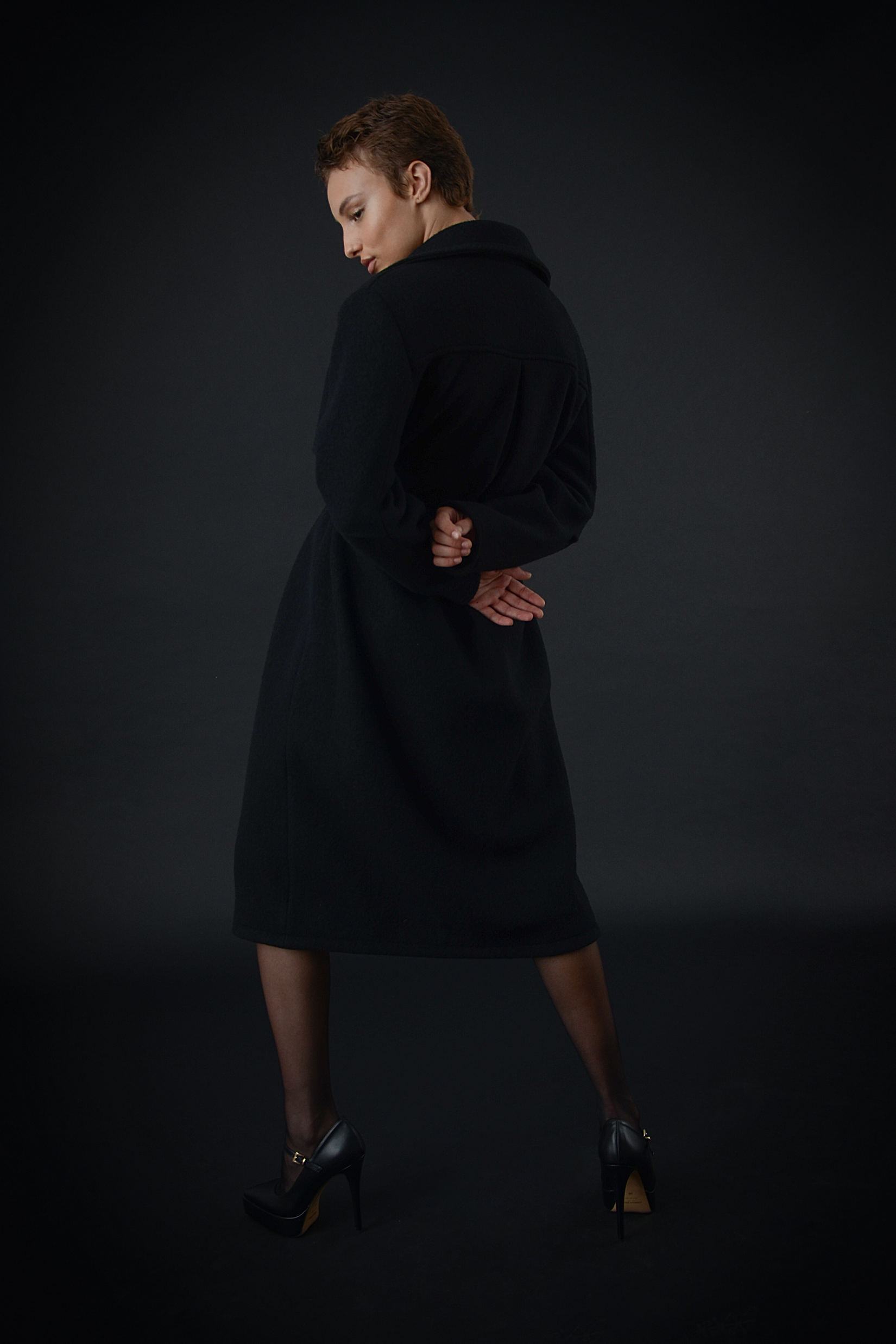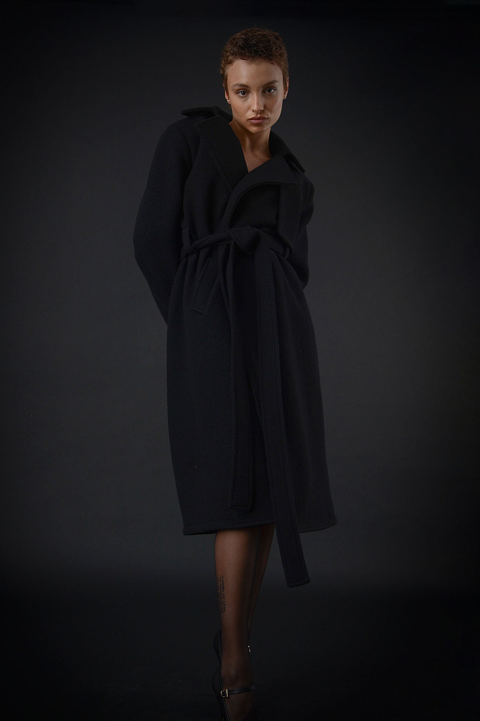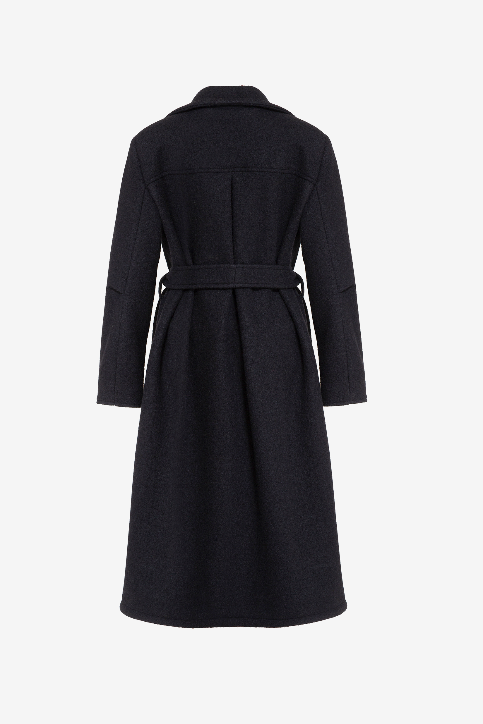 A asymmetric tailored full length coat made from 100% wool. This style features embroidery on one lapel, a front pocket, shoulder pads, back yoke, belt loops and belt that ties for fastening. Every piece is handmade in our Barcelona atelier.