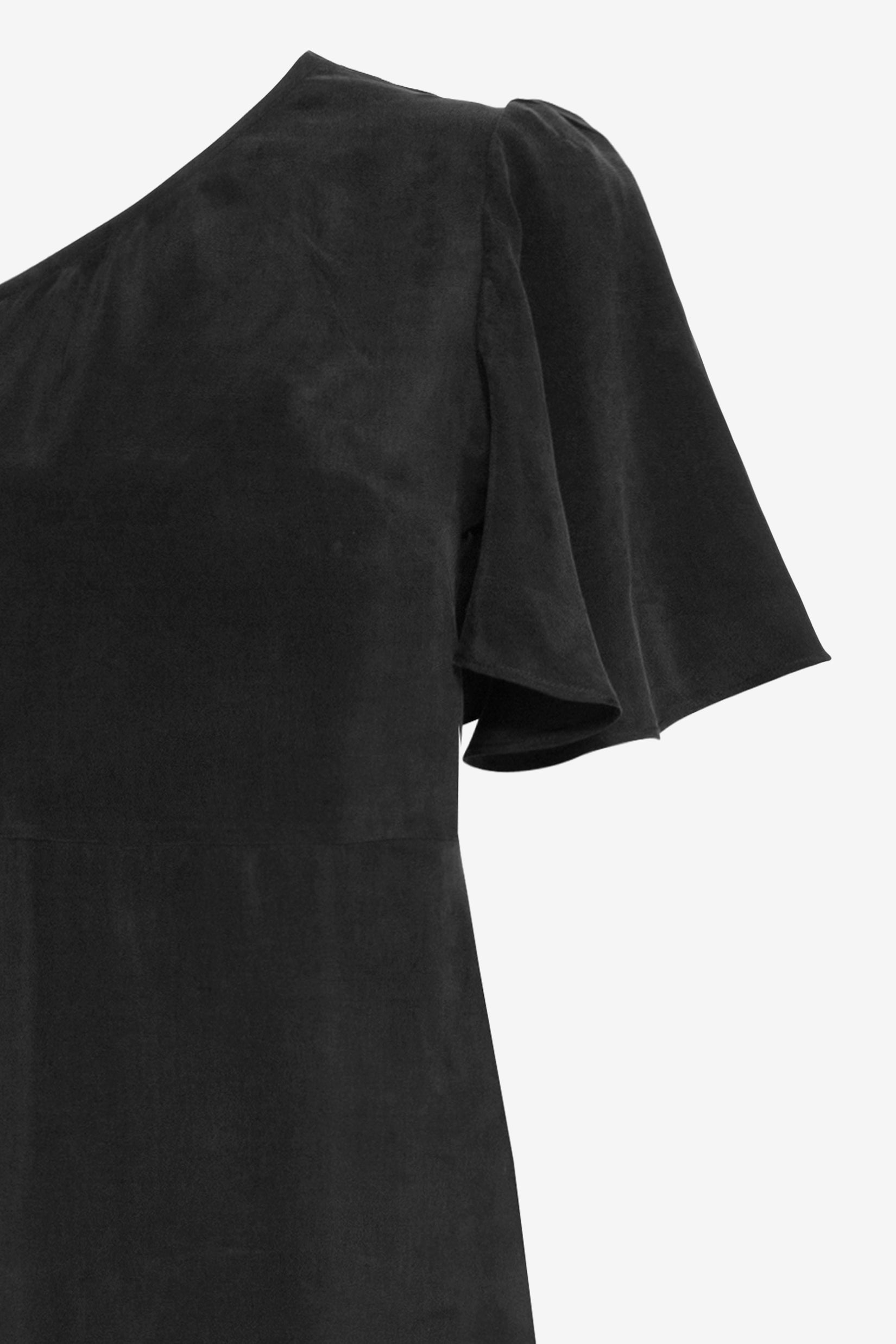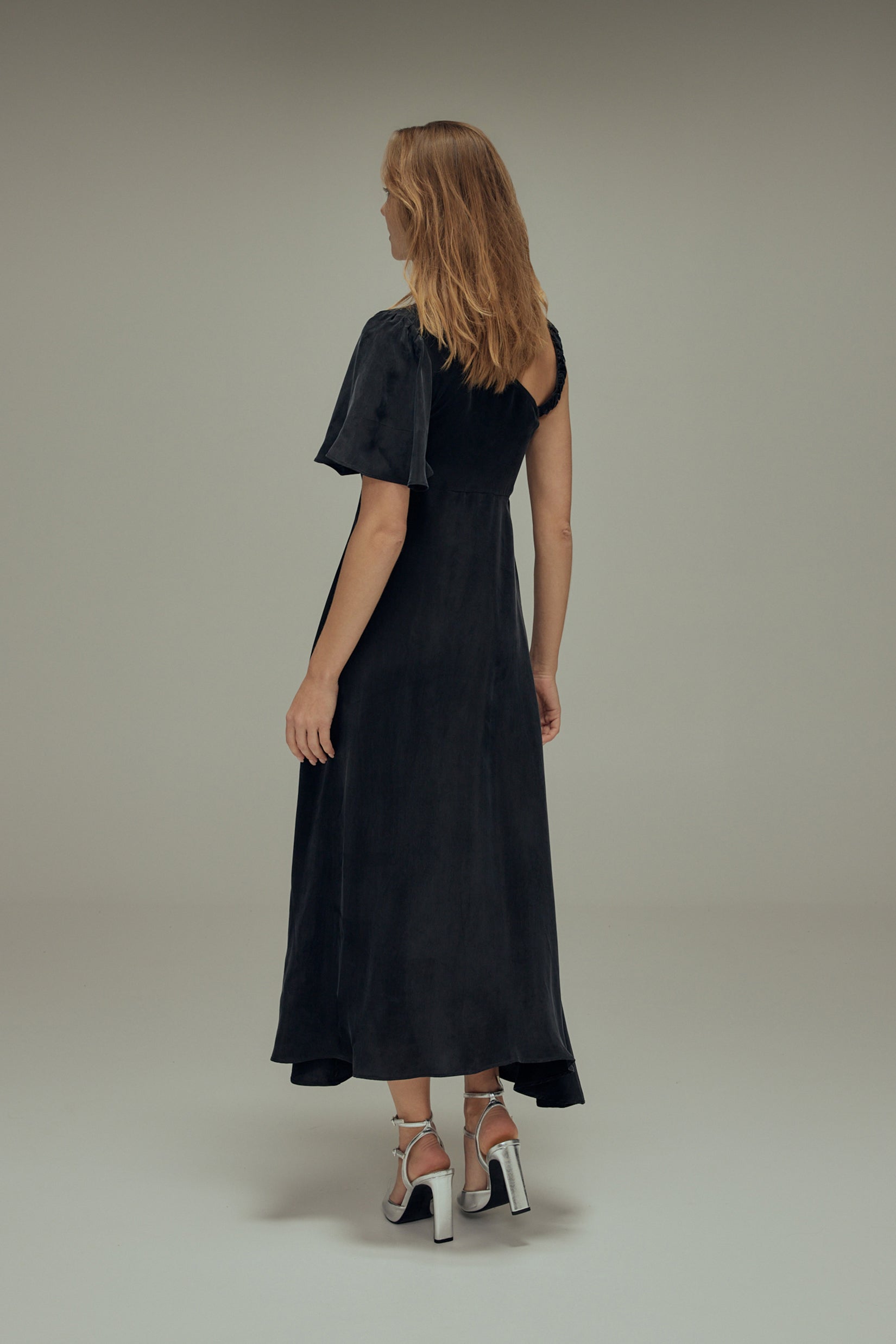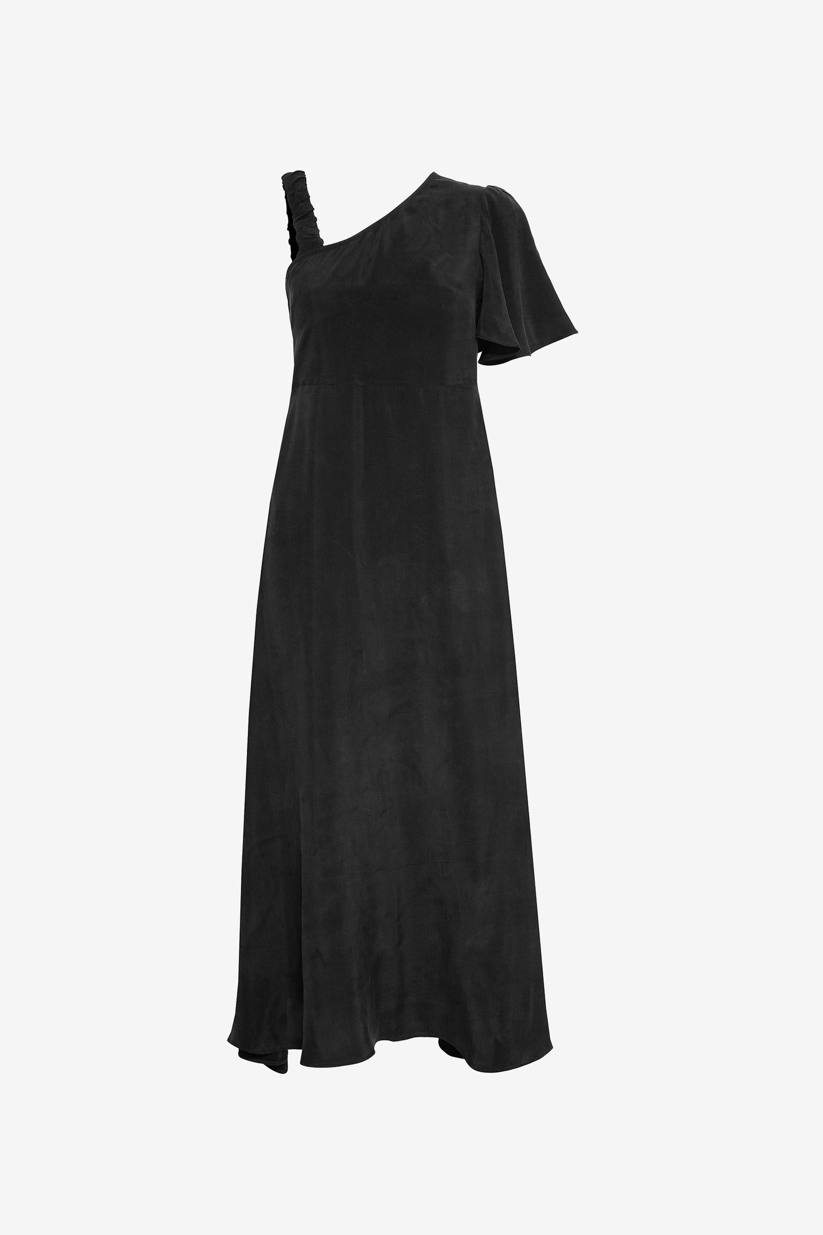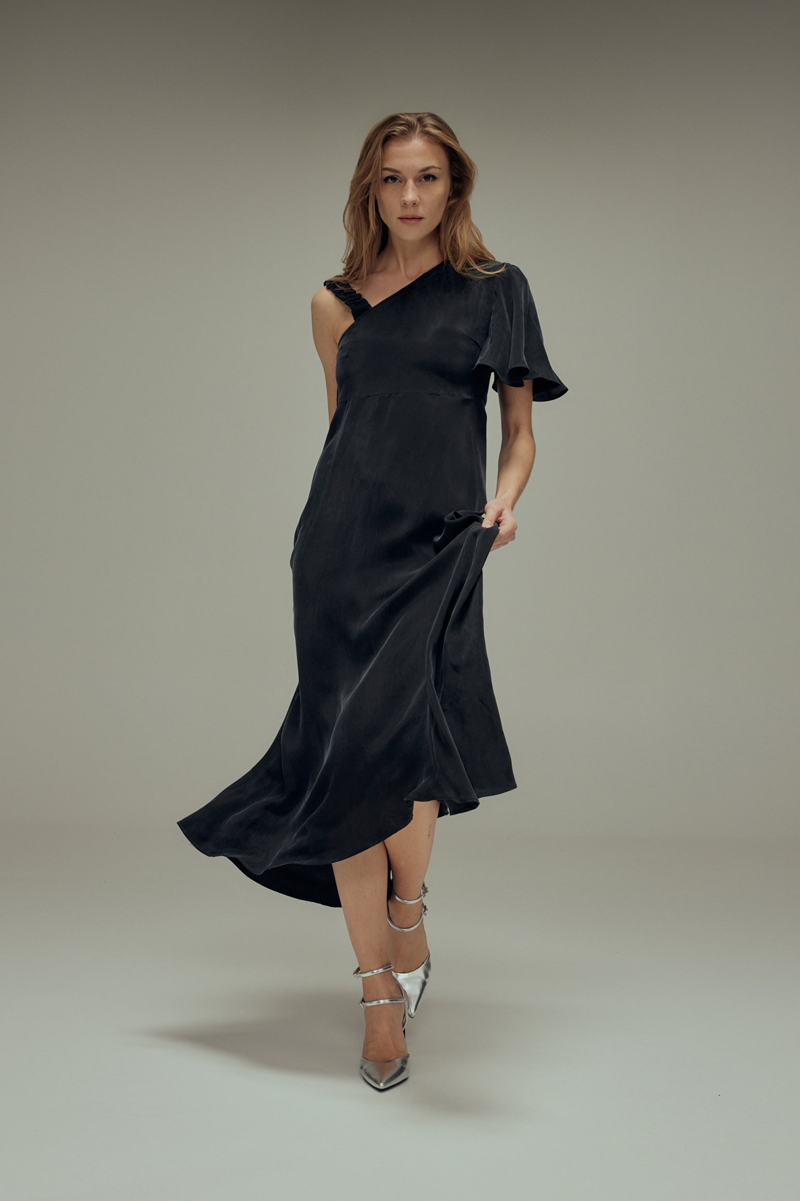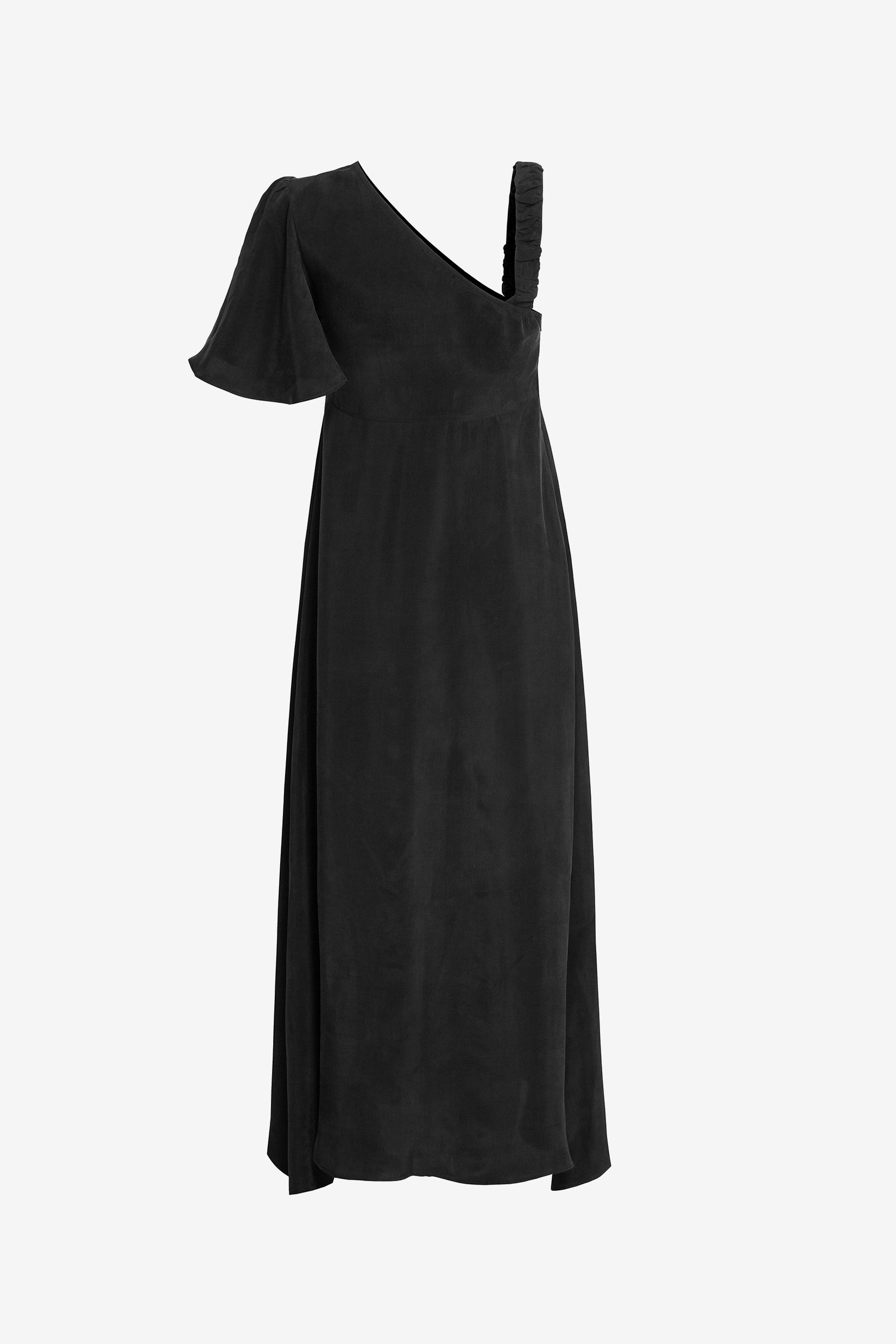 An asymmetric one sleeve maxi dress made from 100% Cupro. This dress features one elasticated gather strap, one draped sleeve and a diagonal neckline.