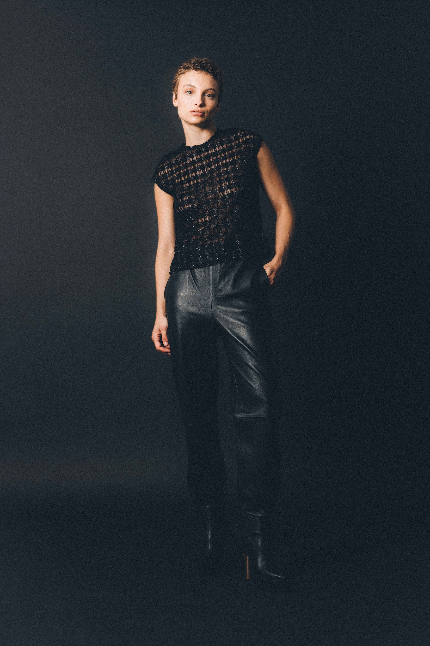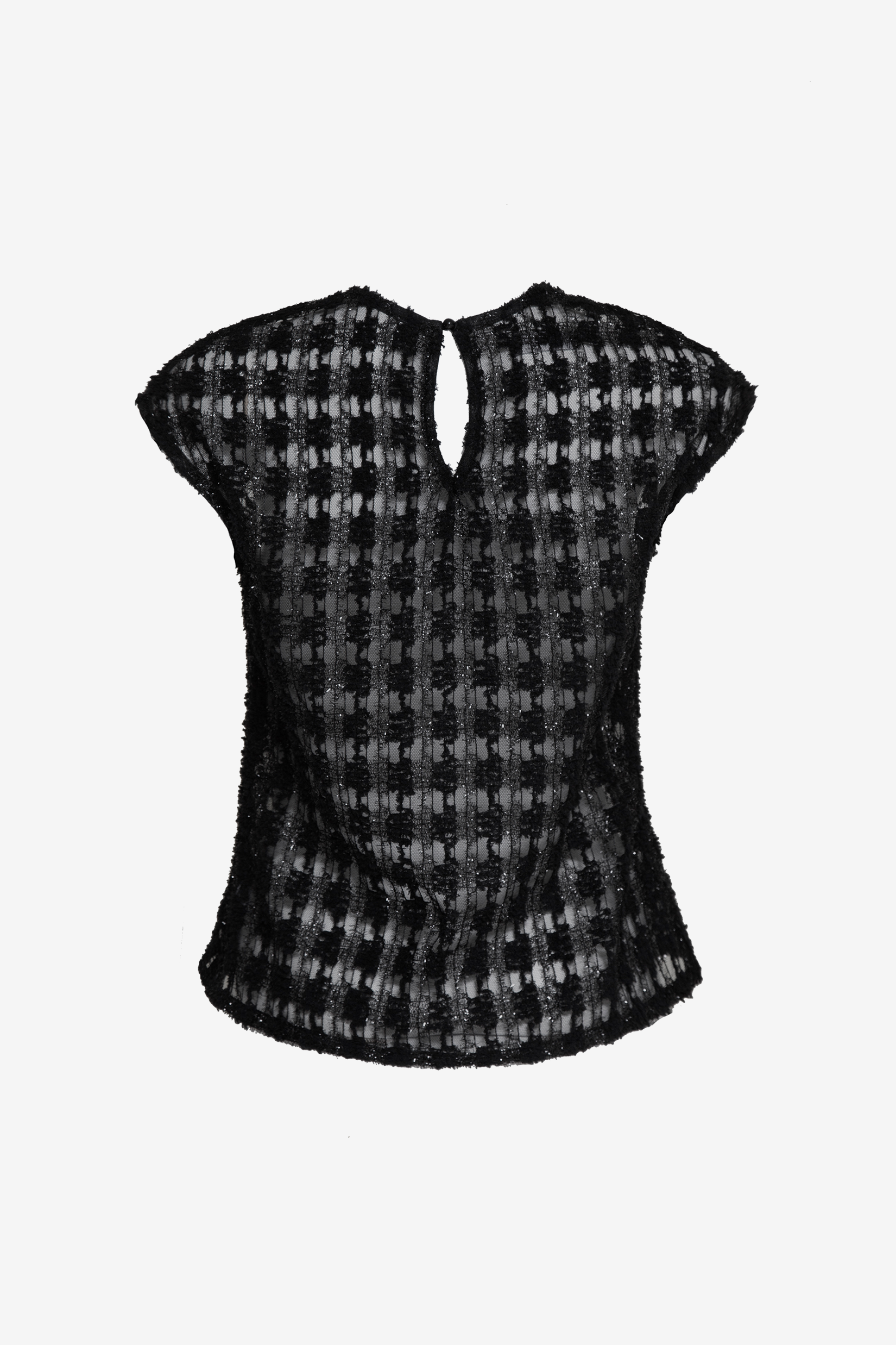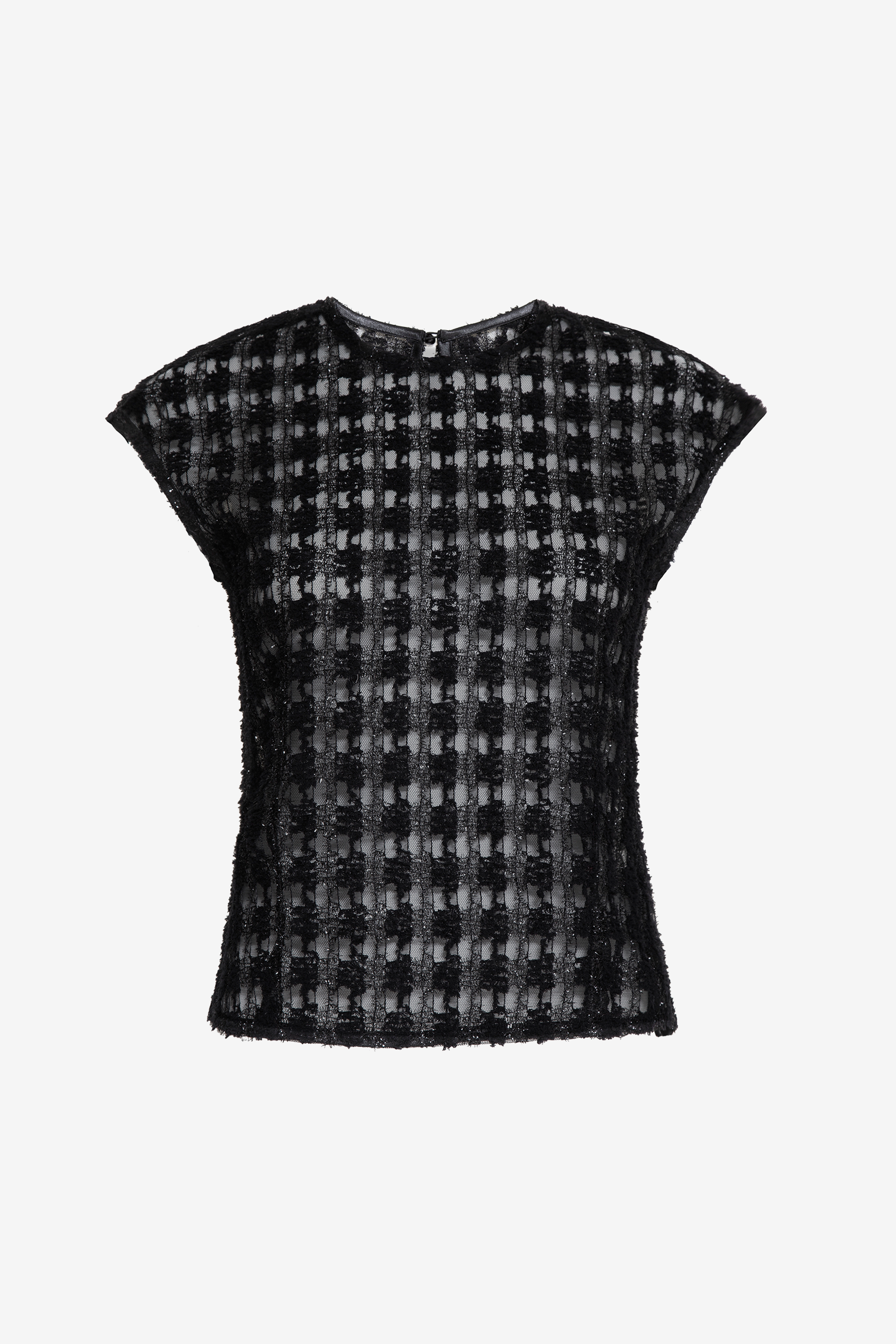 A semi-sheer duchess lace top with cap sleeves and a high neck. This style features covered buttons and regular fit. Every piece is handmade in our Barcelona atelier.