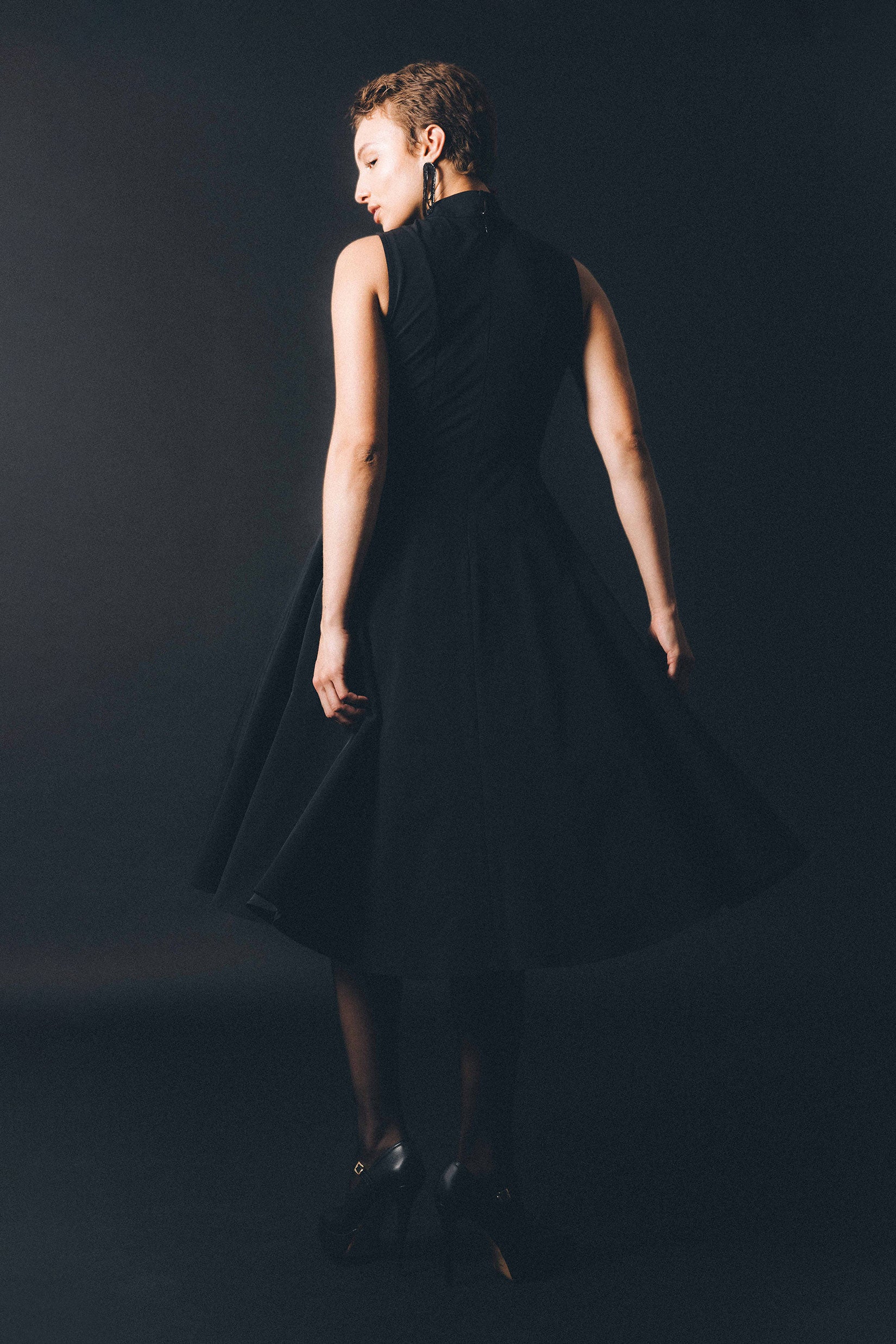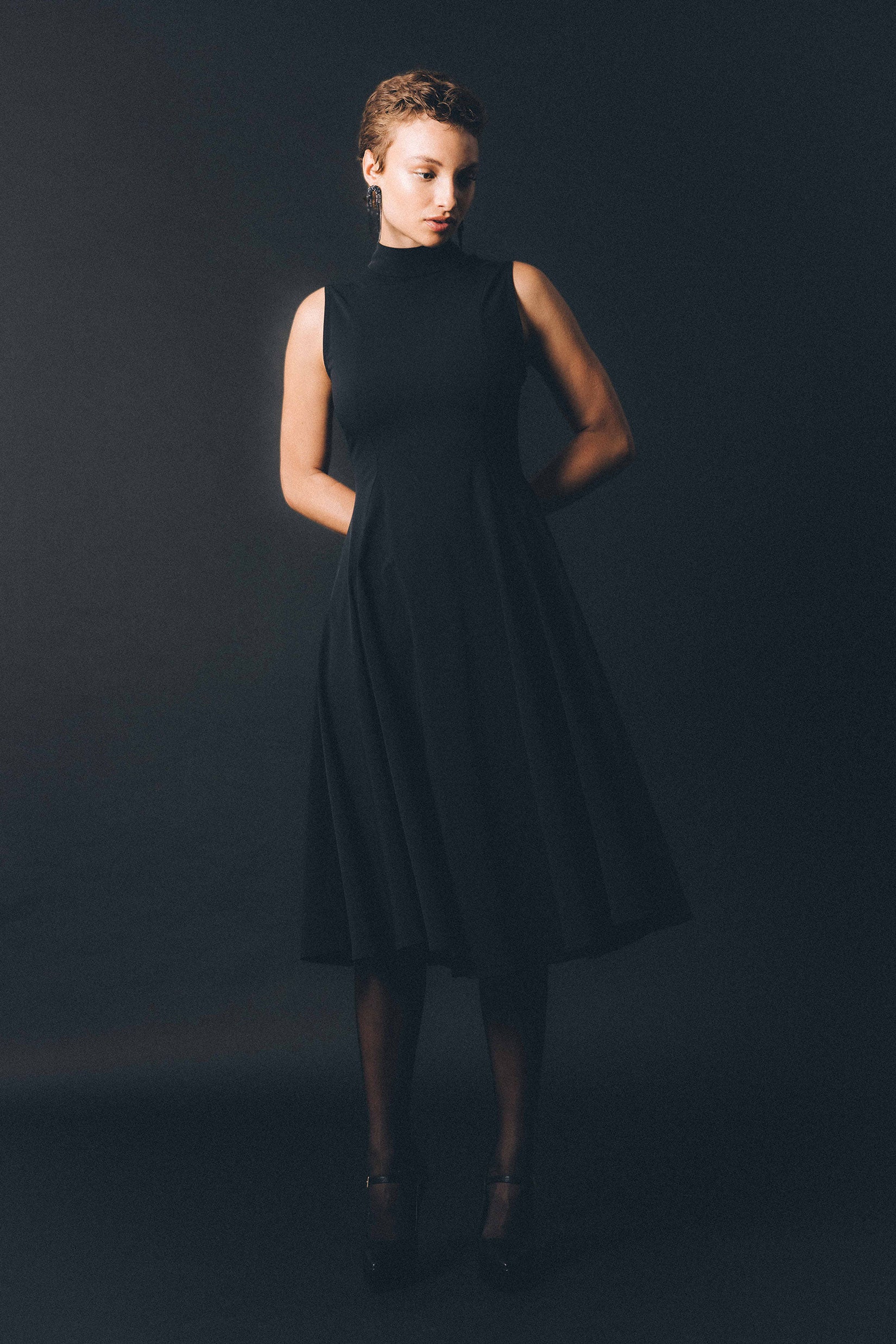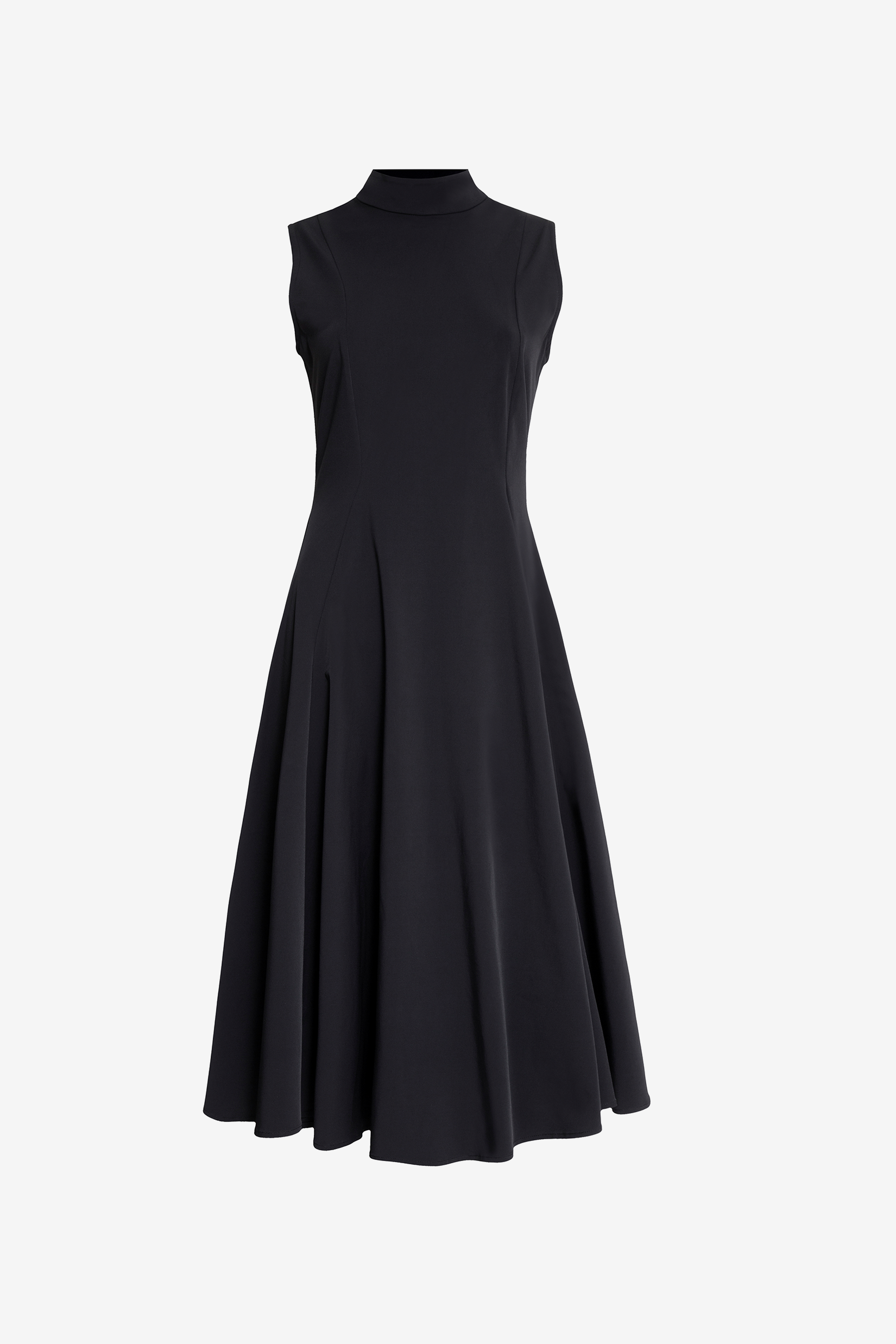 A elegant midi dress made from soft nylon. This style has a sculpting high neck and draped circle skirt. Every piece is handmade in our Barcelona atelier.