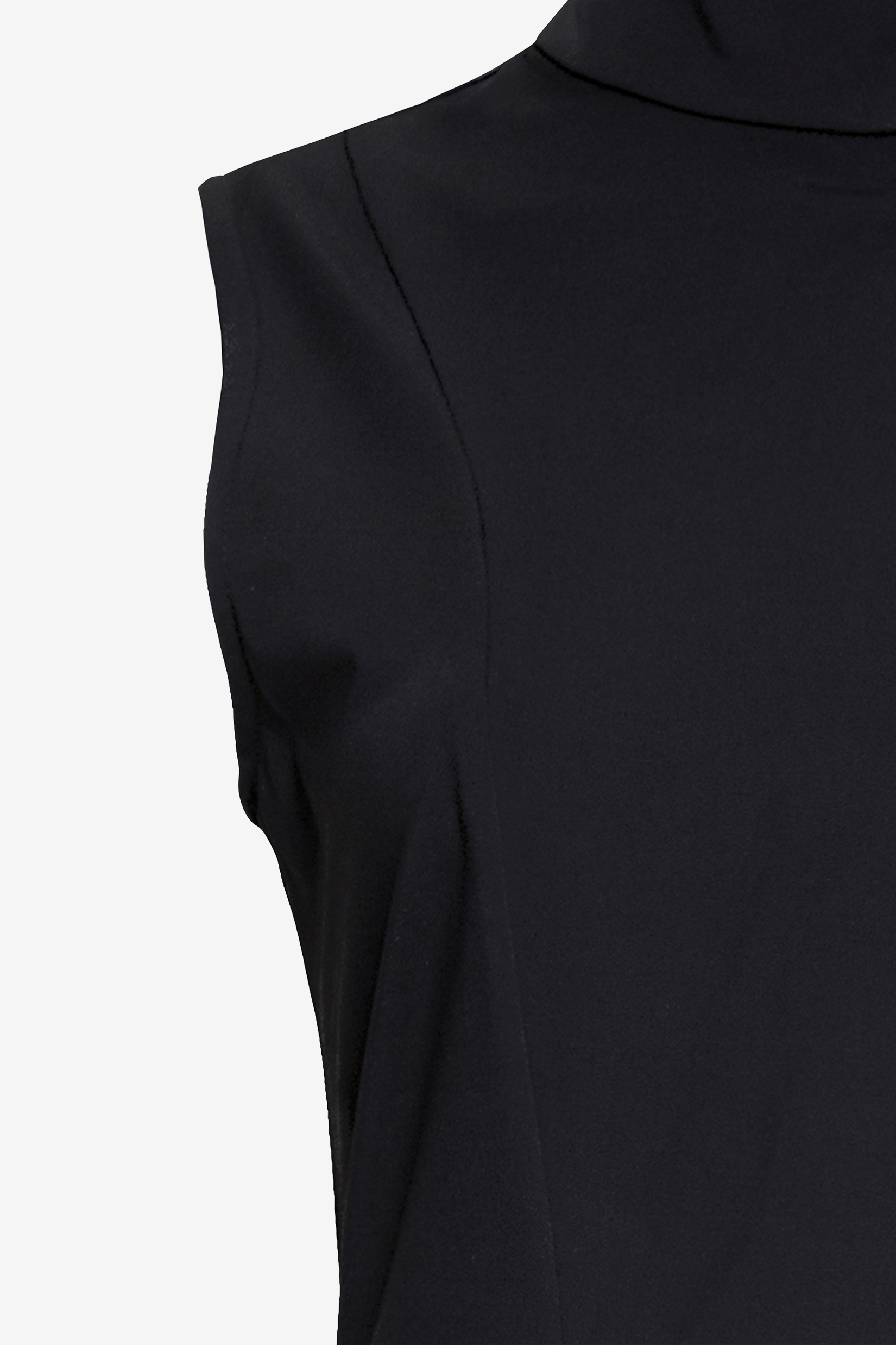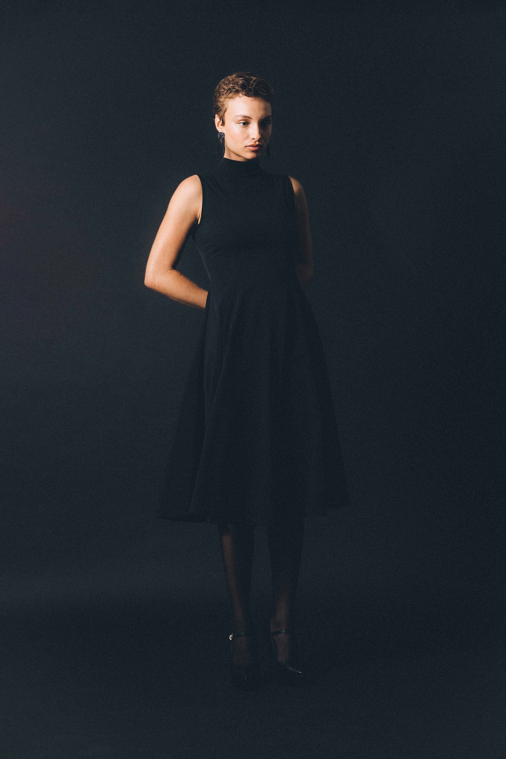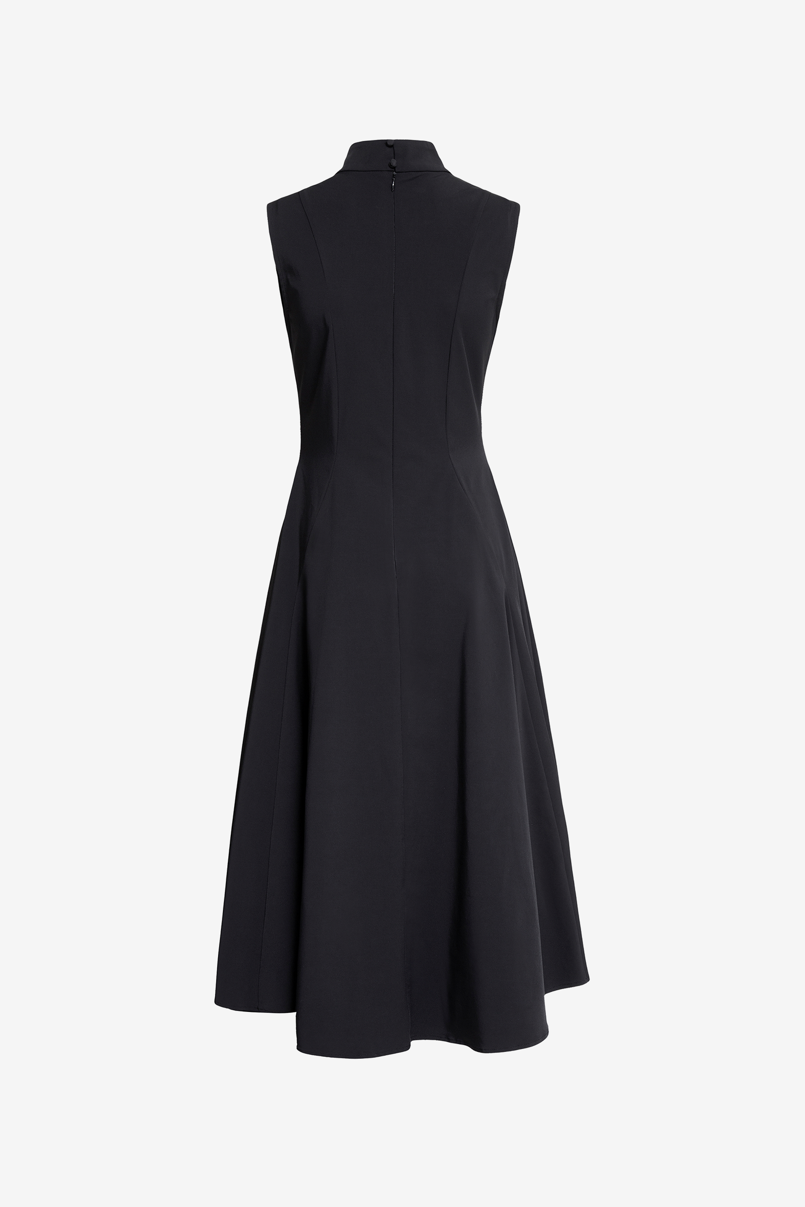 A elegant midi dress made from soft nylon. This style has a sculpting high neck and draped circle skirt. Every piece is handmade in our Barcelona atelier.
