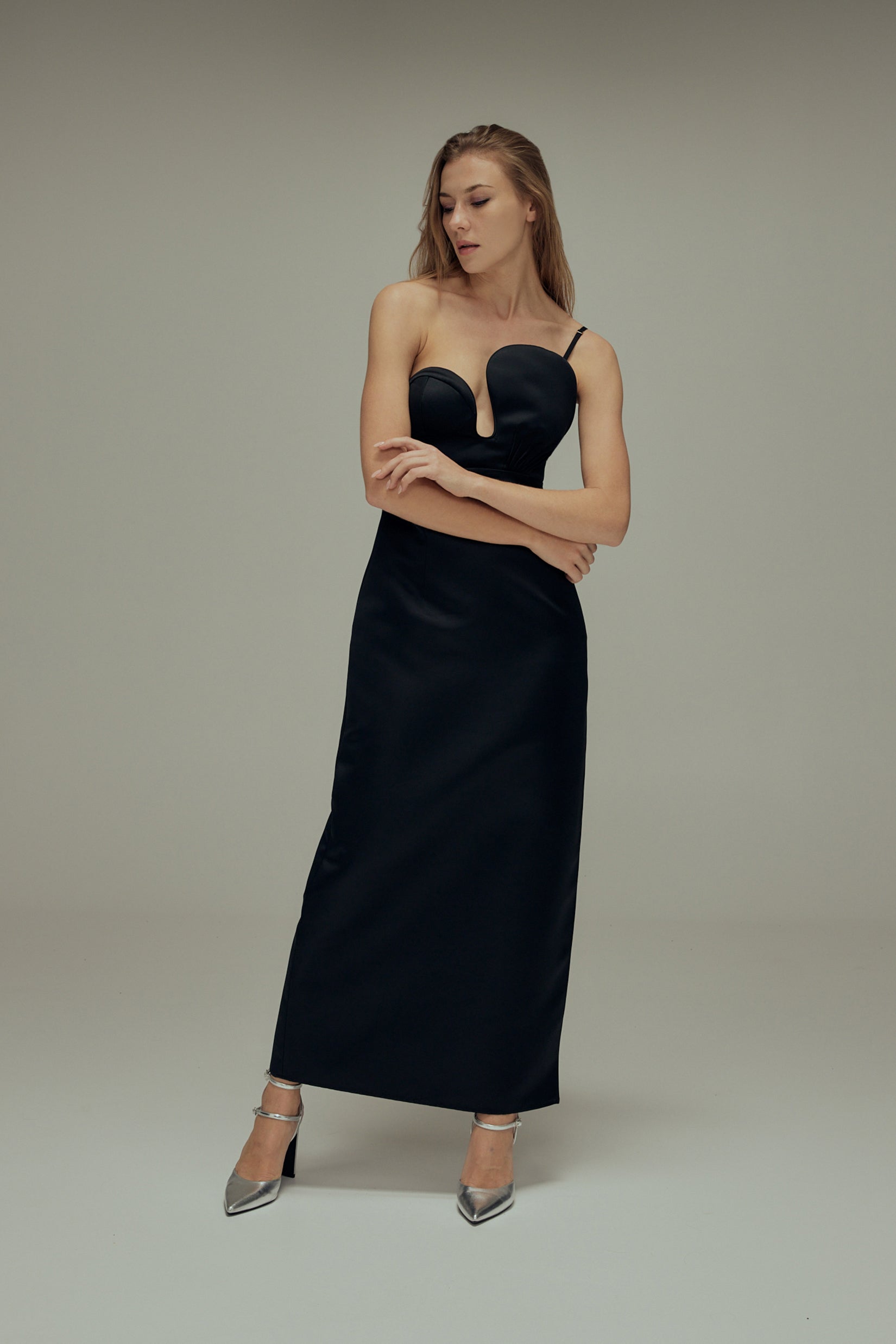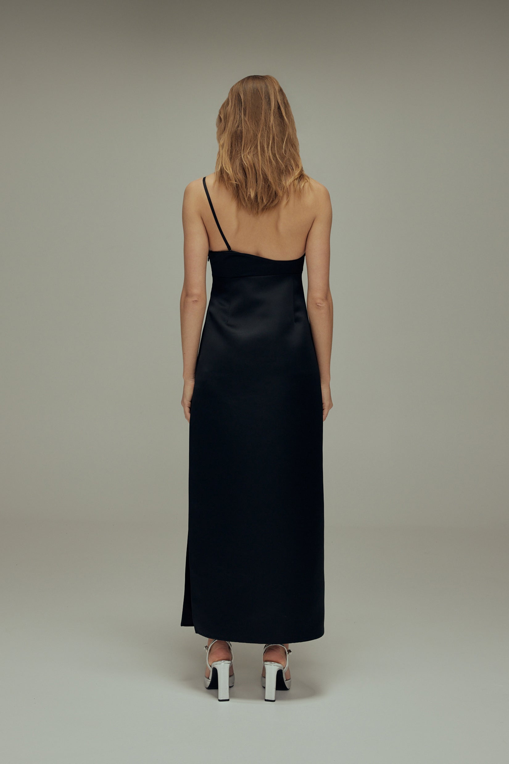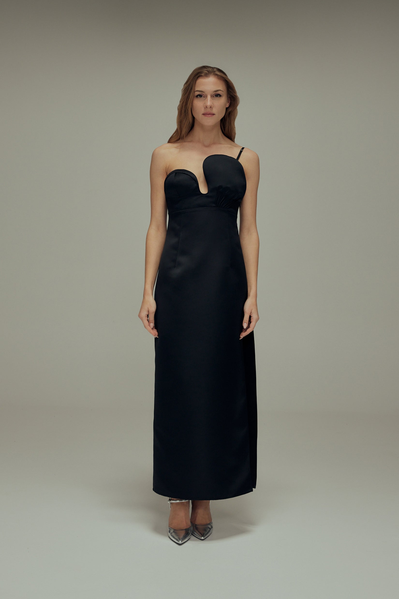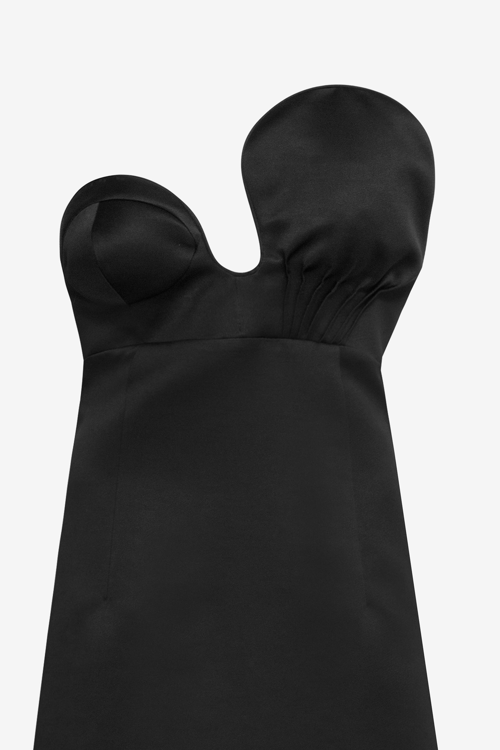 A satin bustier dress with asymmetric front. Style features include a side slit, concealed zipper and, double layering.