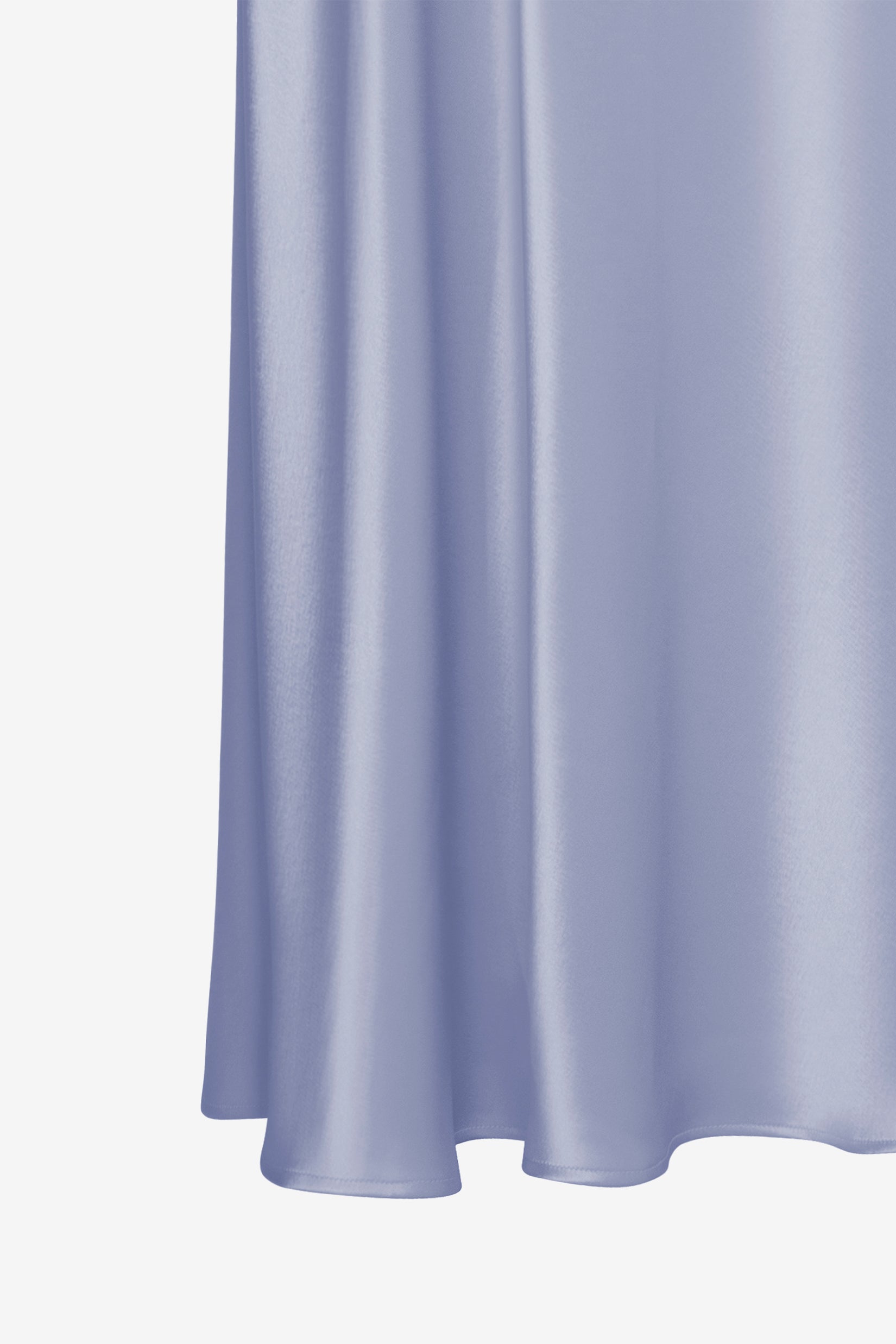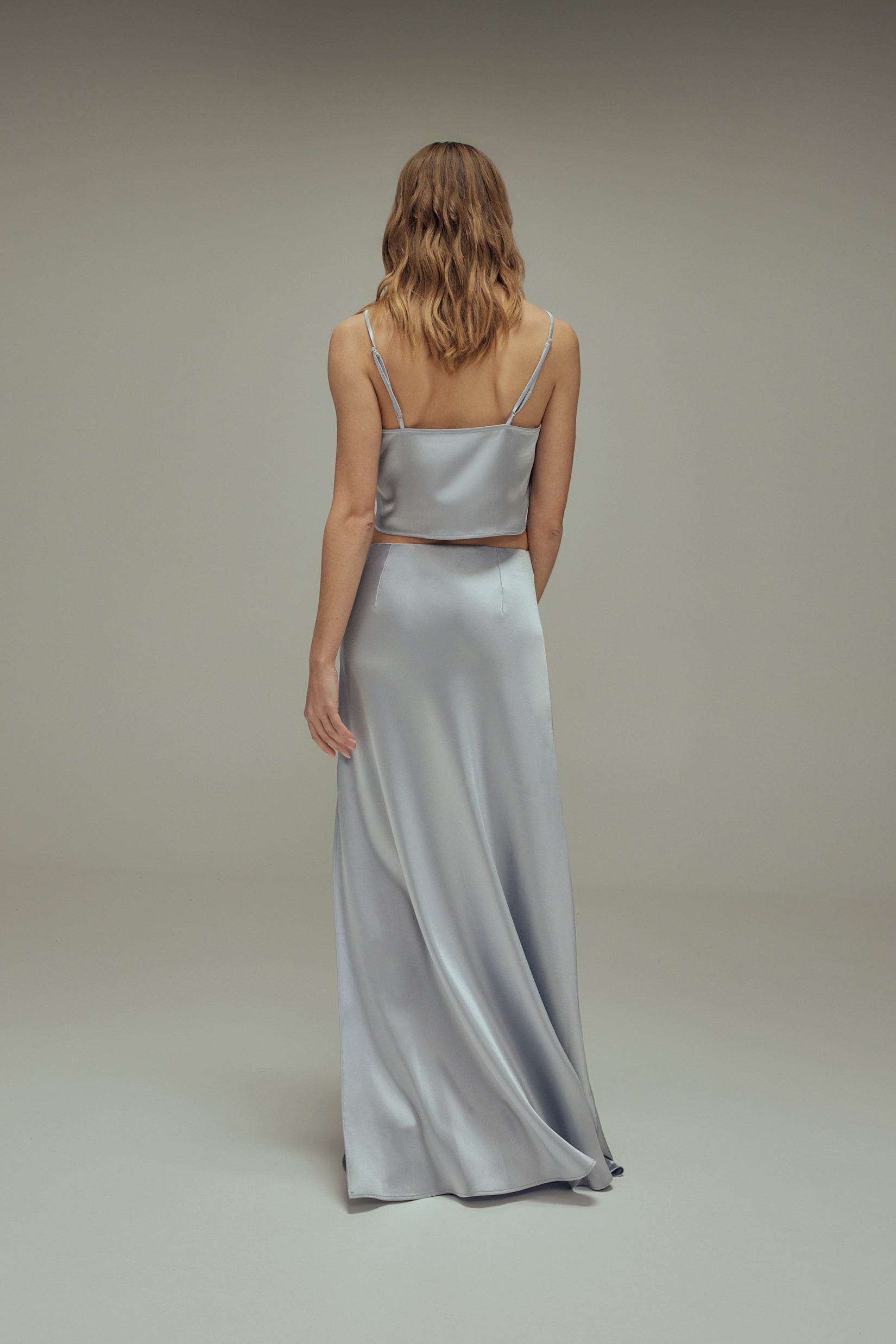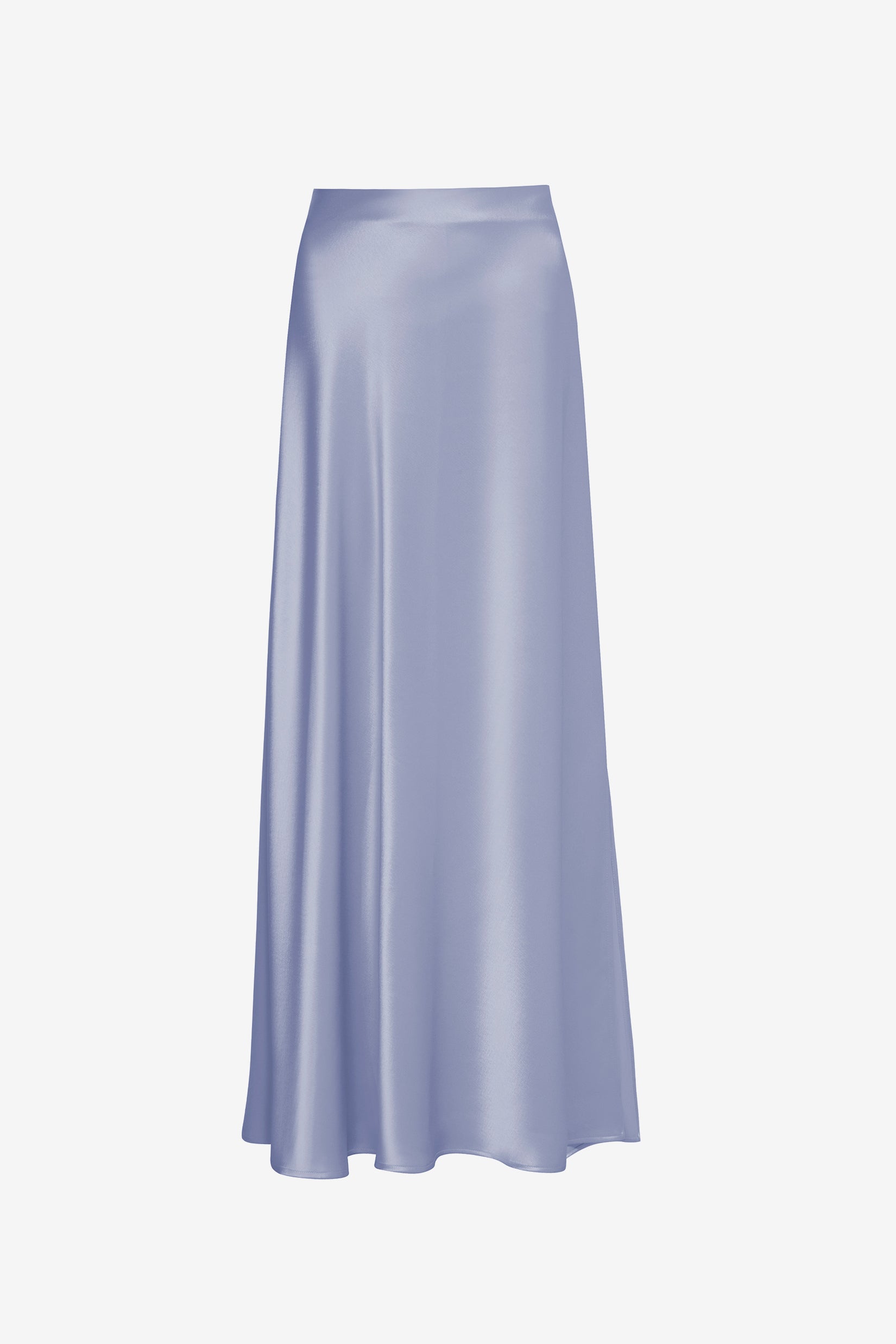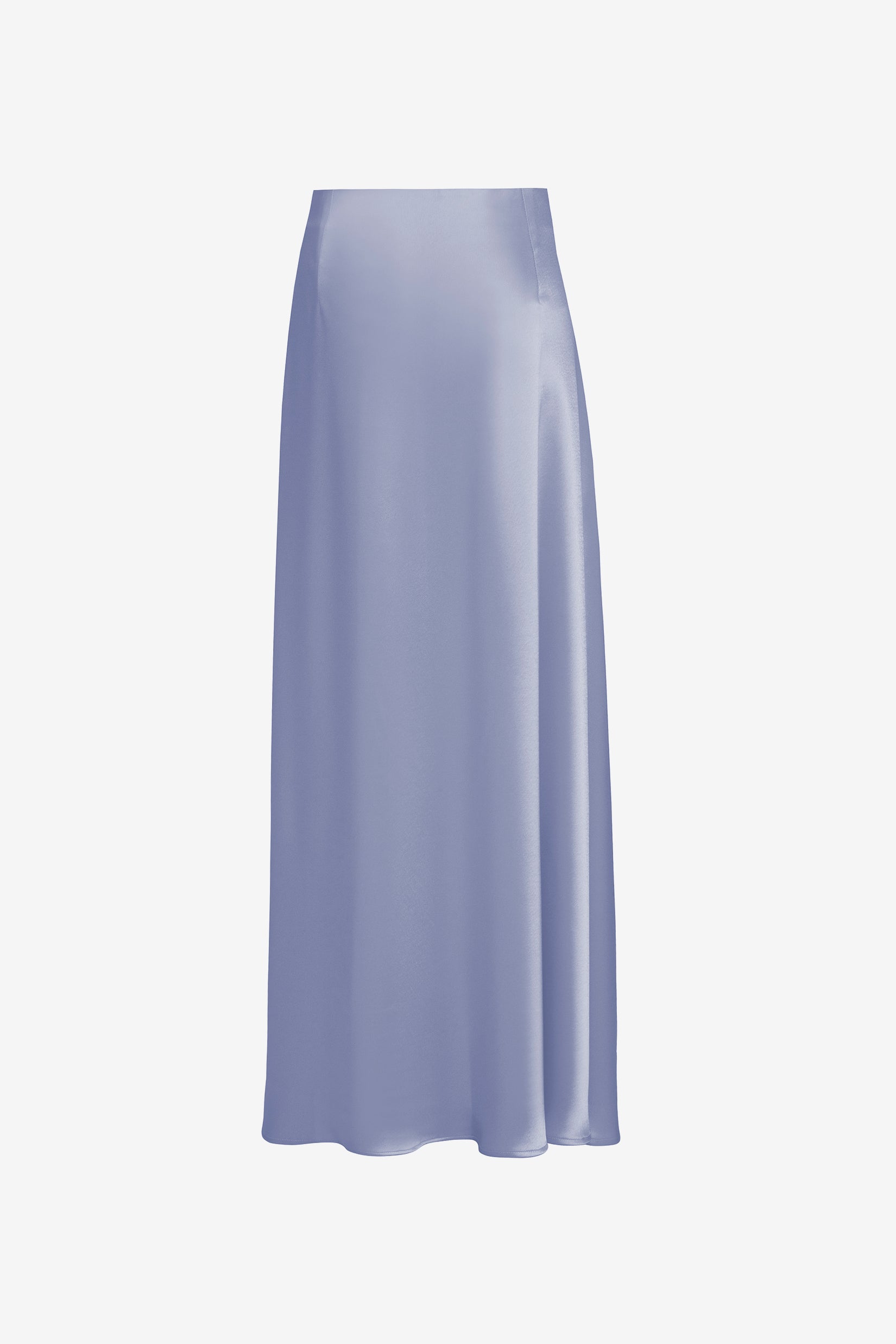 A silky maxi skirt made from soft satin. This style features a knee high slit, concealed side zipper and, mid rise.